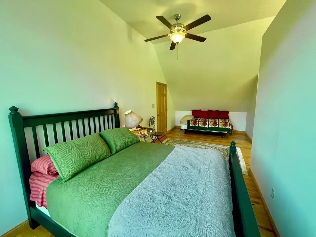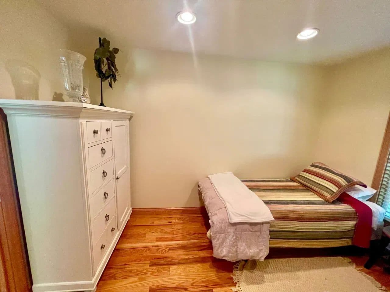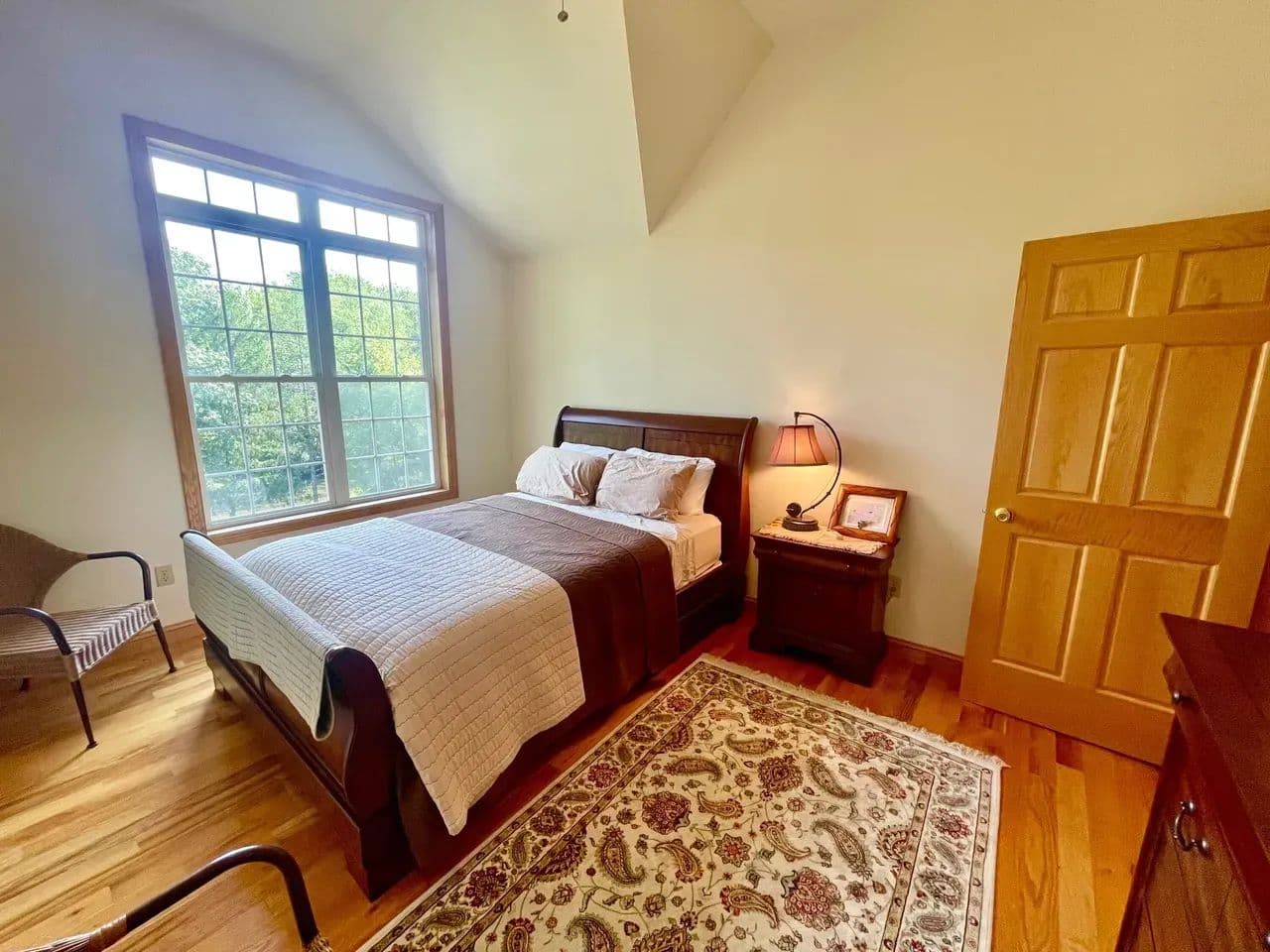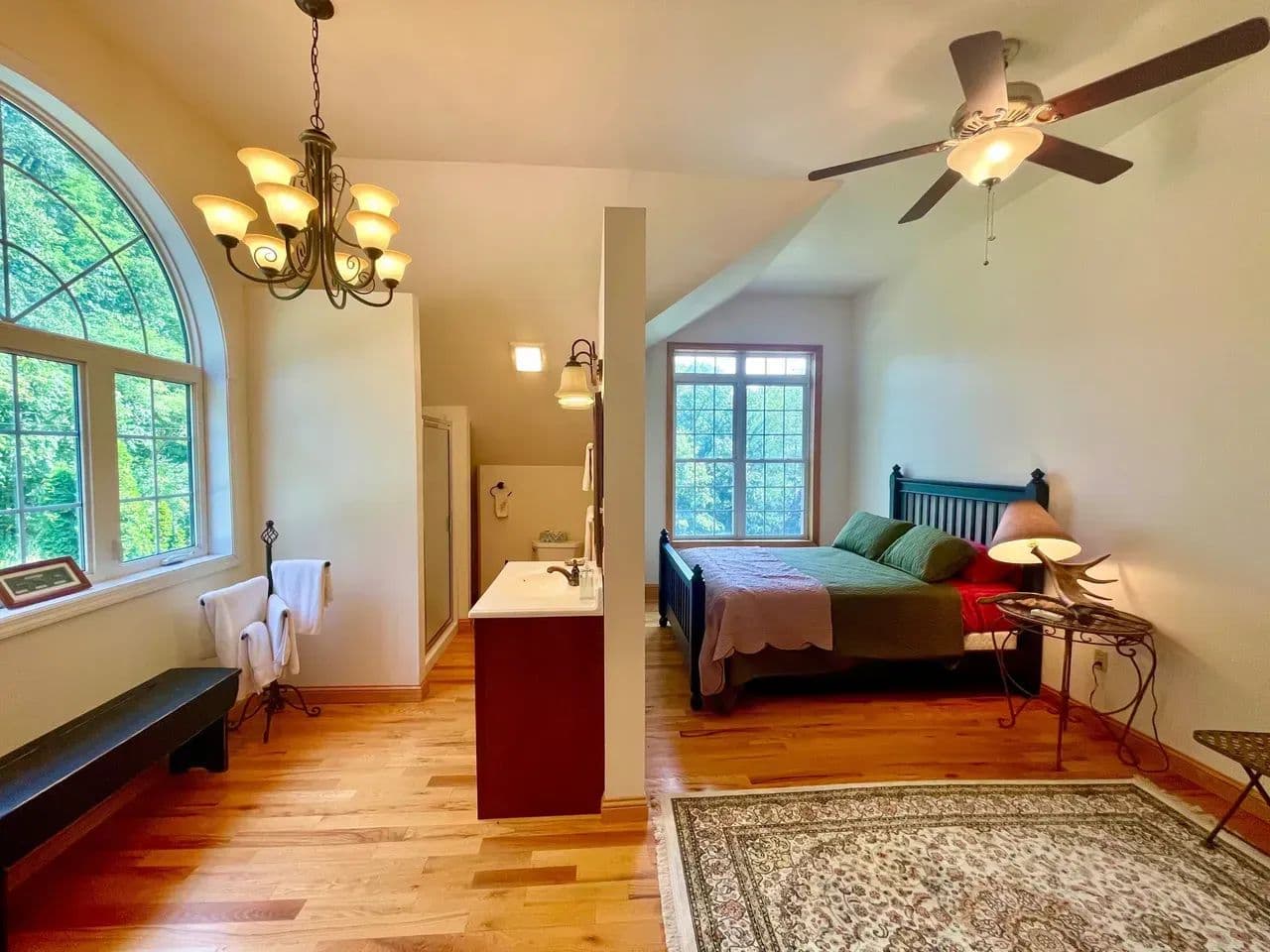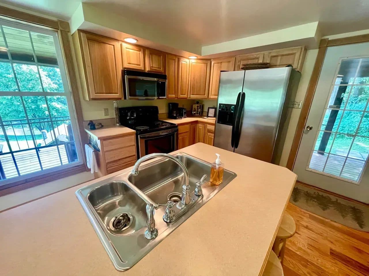 The bright and inviting kitchen showcases maple cabinetry, a generous center island with prep sink, and an open flow for easy entertaining. A first-floor bedroom and full bath add convenience, while upstairs you’ll find a second bedroom with scenic river views, a full bath, and an impressive master suite with vaulted ceilings and a private en suite.