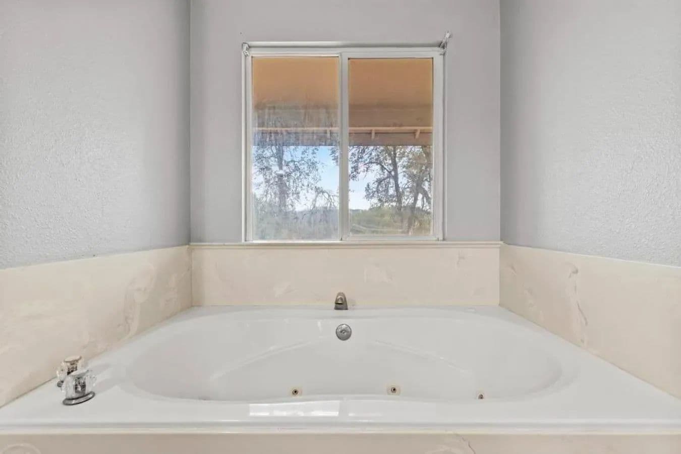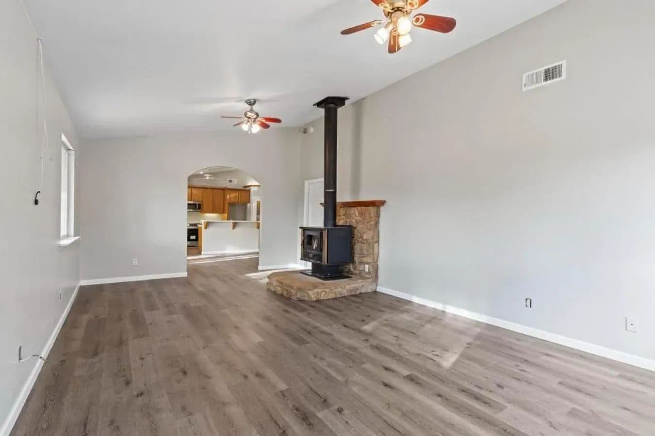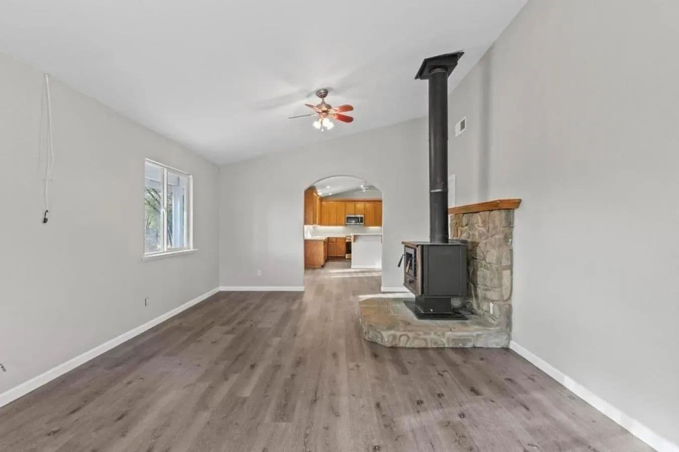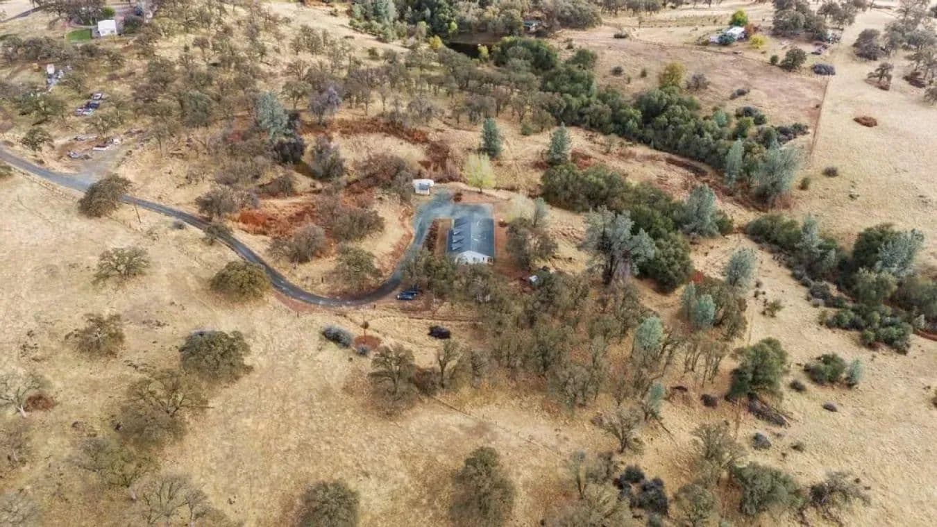 Discover ultimate privacy and breathtaking views on this expansive 10+ acre property! This spacious home offers an open floor plan, with a kitchen overlooking the family and dining rooms, which feature a gas fireplace and vaulted ceilings. A versatile bonus room with a wood-burning stove and outside access could serve as a second living room or be converted into guest quarters. The kitchen is equipped with a pantry closet and garden window. The primary suite is a true retreat with vaulted ceilings, walk-in closet, outside access, and bathroom featuring a separate tub, shower, and dual sinks. The spacious hall bath boasts a skylight and double sinks, while the large laundry room offers abundant storage. Recent updates include new flooring and fresh interior paint throughout, as well as a tankless water heater for added efficiency. Outside, enjoy the serenity of nature from two long covered patios on each side of the house, perfect for morning coffee or evening relaxation. Wildlife abounds, with deer and turkeys frequenting the property, adding to the peaceful ambiance. With over 10 acres and BVID irrigation water, it's perfect for animals. Plus, a pad is ready for a shop if you desire additional workspace. This private, gated property with all the conveniences and plenty of space to make it your own!