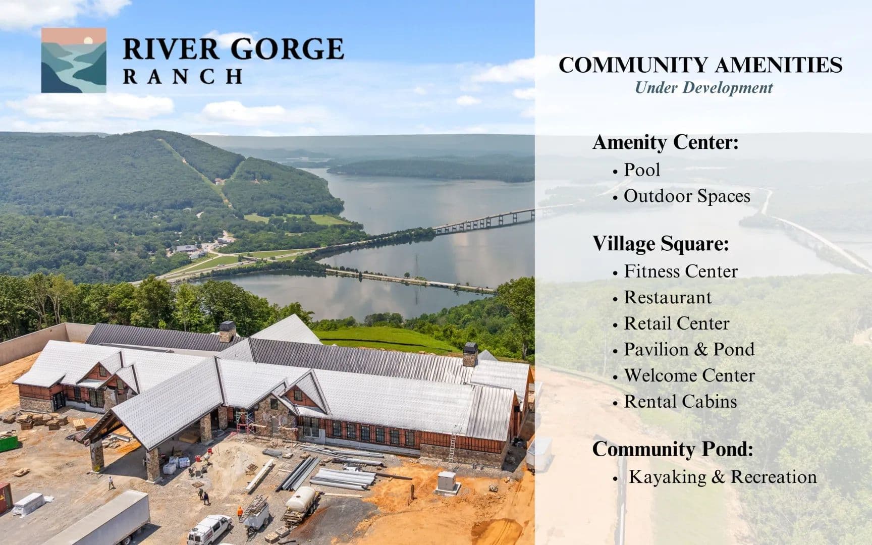 Pre-approved for 3 bedroom home, power, water, and GIG SPEED fiber optic internet access on site. Upcoming River Gorge Ranch AMENITIES include the 27-acre VILLAGE SQUARE with dining, retail, fitness center, luxury pavilion, rental cabins, upcoming community POOL, POND, and outdoor recreation spaces. Enjoy peaceful days surrounded by nature and summer evenings on the river.