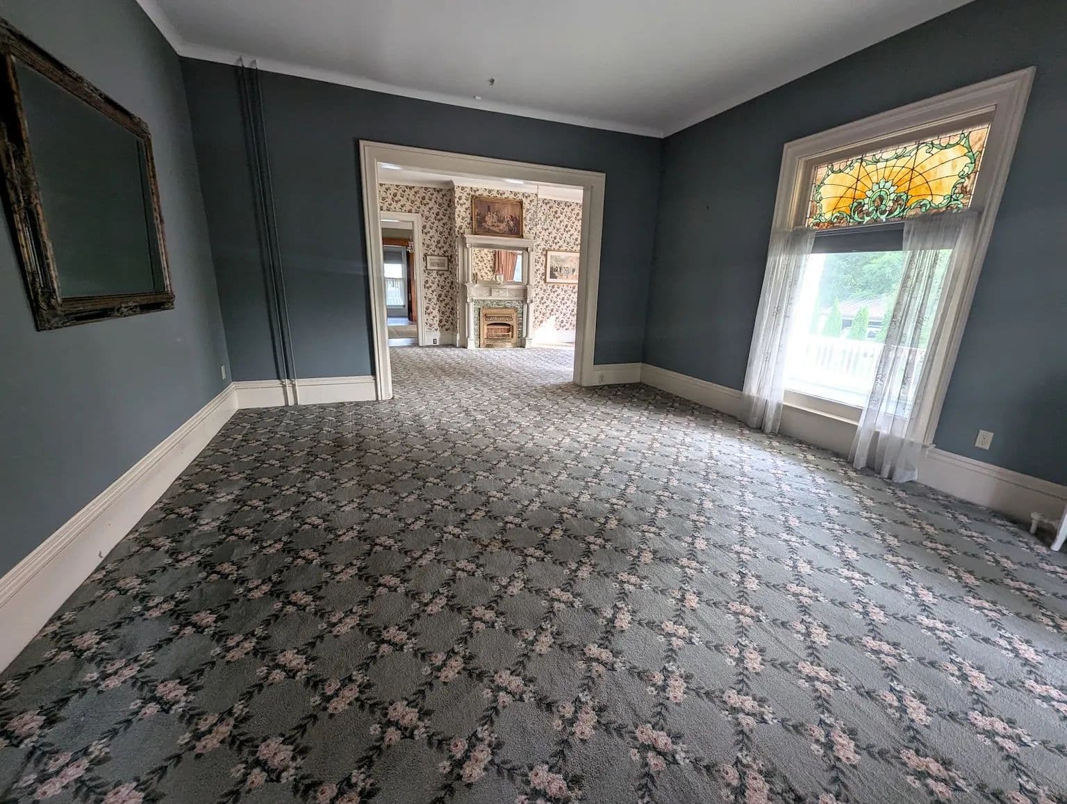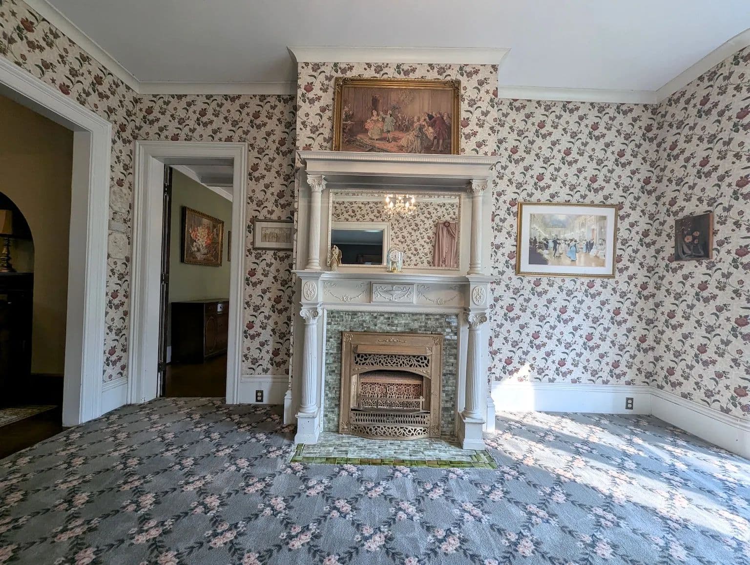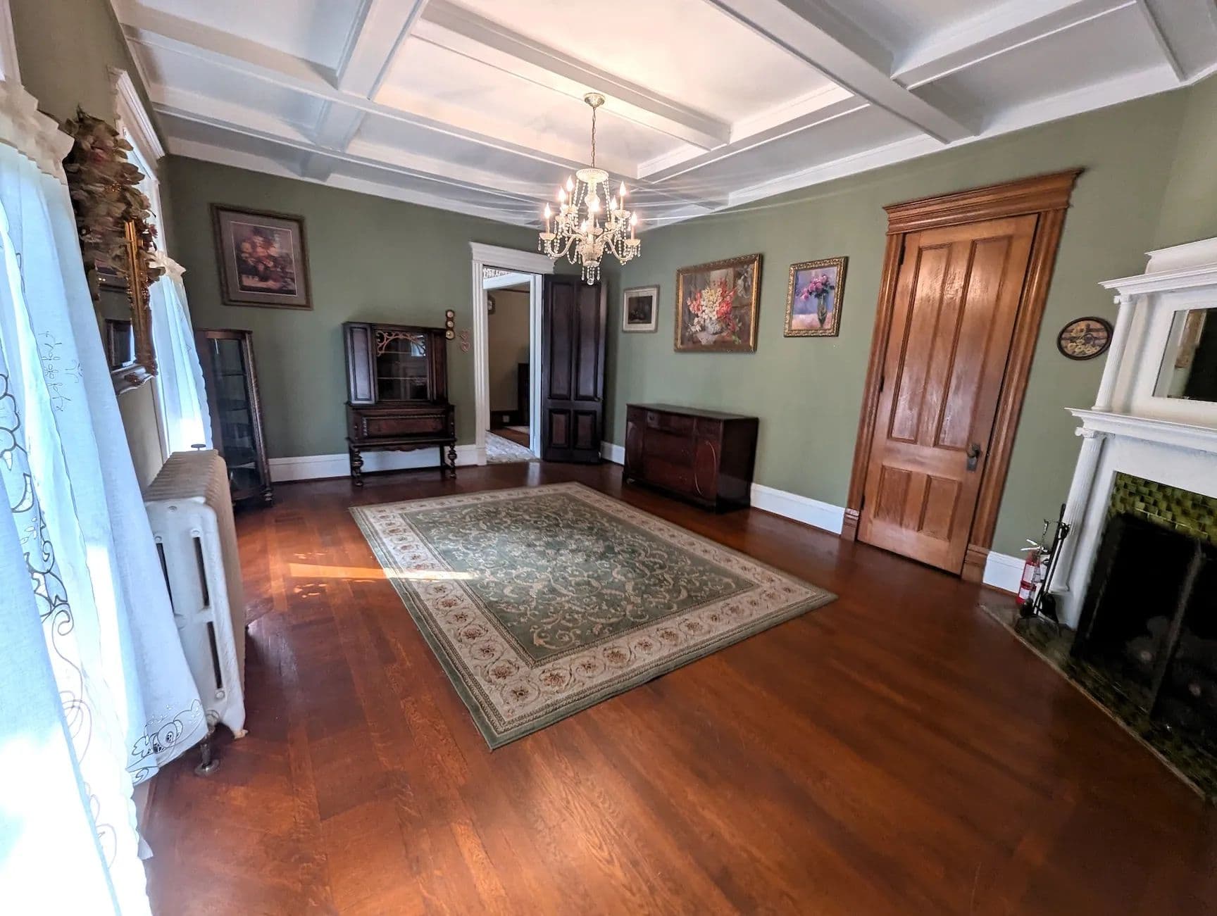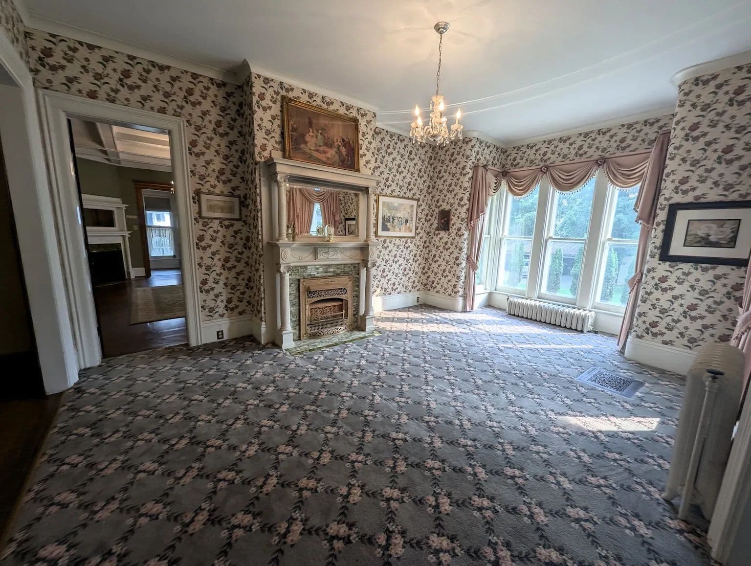 Upstairs, the home continues to impress with its tall ceilings, oversized and curved windows, detailed trim, and original hardwood flooring. The second floor includes four generously sized bedrooms, two full bathrooms, a third fireplace, and a charming sunroom. The spacious primary suite features a private bath offering both comfort and privacy. A staircase leads to the expansive attic, a versatile space perfect for storage or easily finished into additional living space. The full basement offers dry storage and a separate laundry area keeping utility space out of sight from the main living areas.