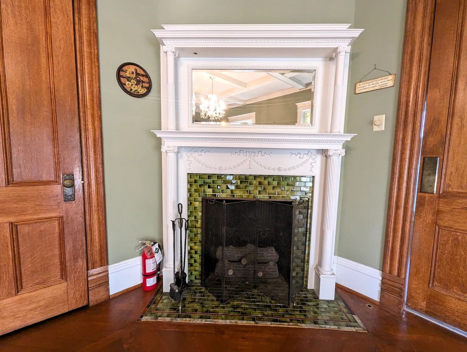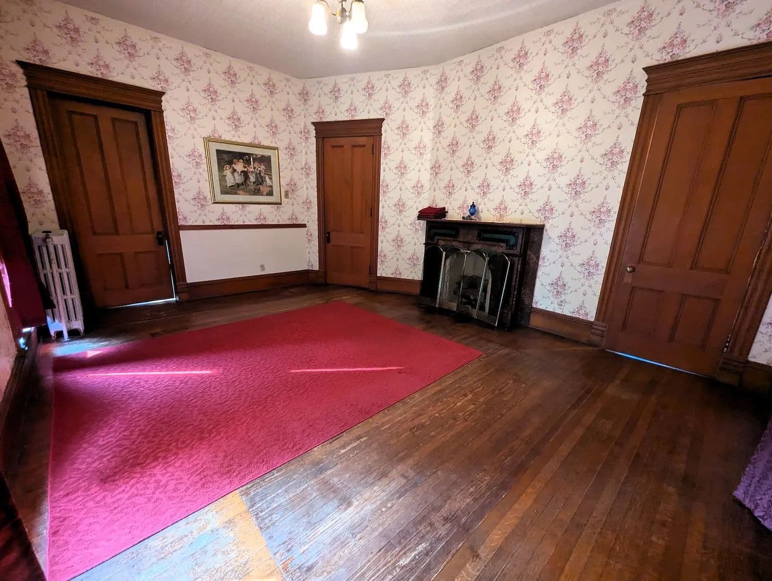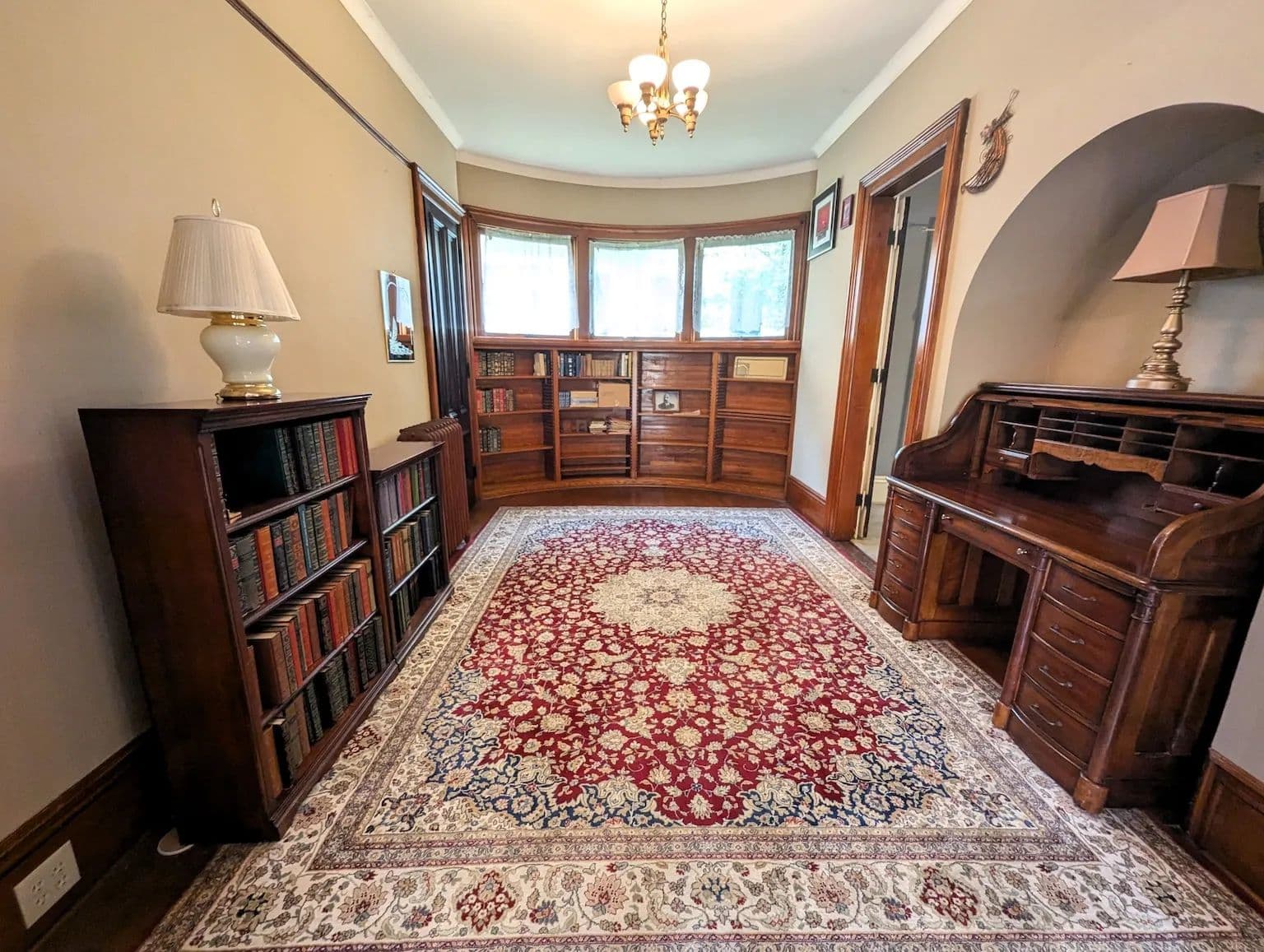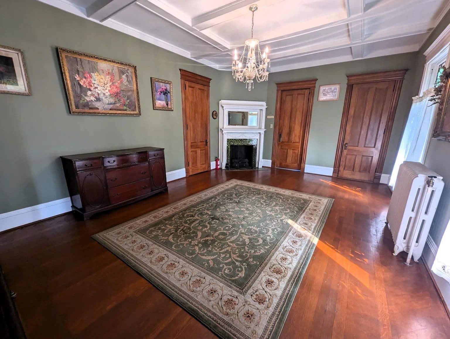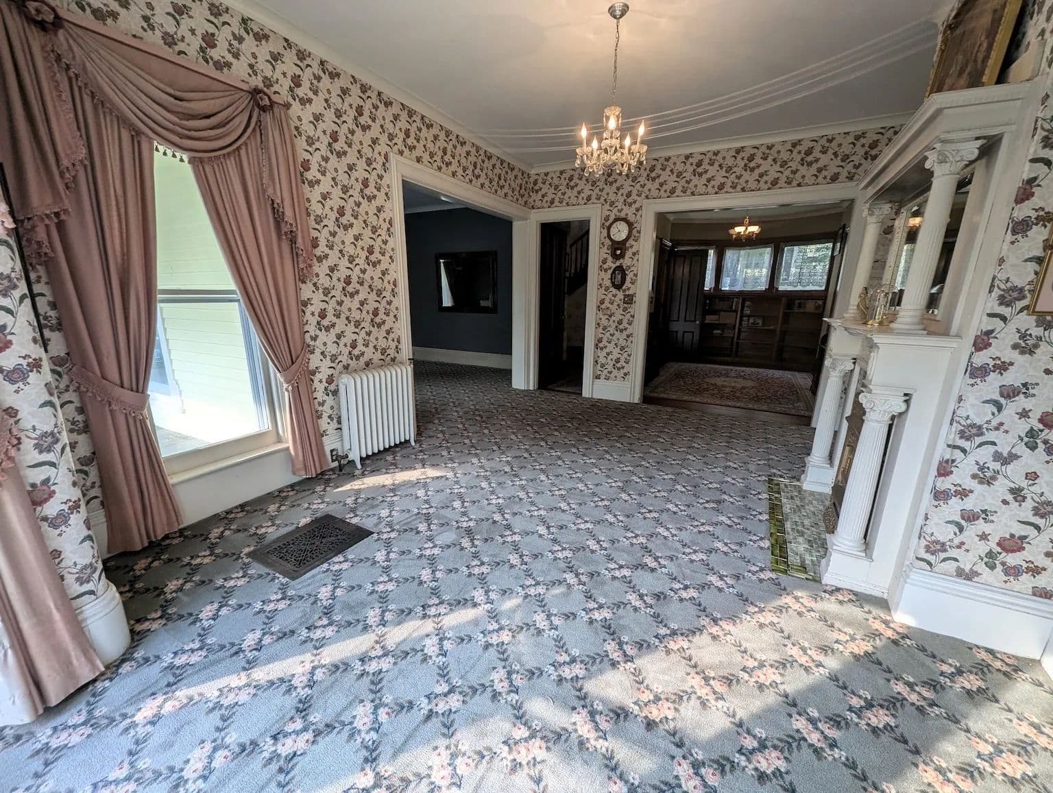 Upstairs, the home continues to impress with its tall ceilings, oversized and curved windows, detailed trim, and original hardwood flooring. The second floor includes four generously sized bedrooms, two full bathrooms, a third fireplace, and a charming sunroom. The spacious primary suite features a private bath offering both comfort and privacy. A staircase leads to the expansive attic, a versatile space perfect for storage or easily finished into additional living space. The full basement offers dry storage and a separate laundry area keeping utility space out of sight from the main living areas.