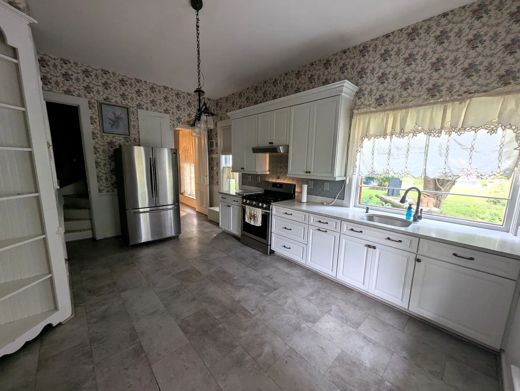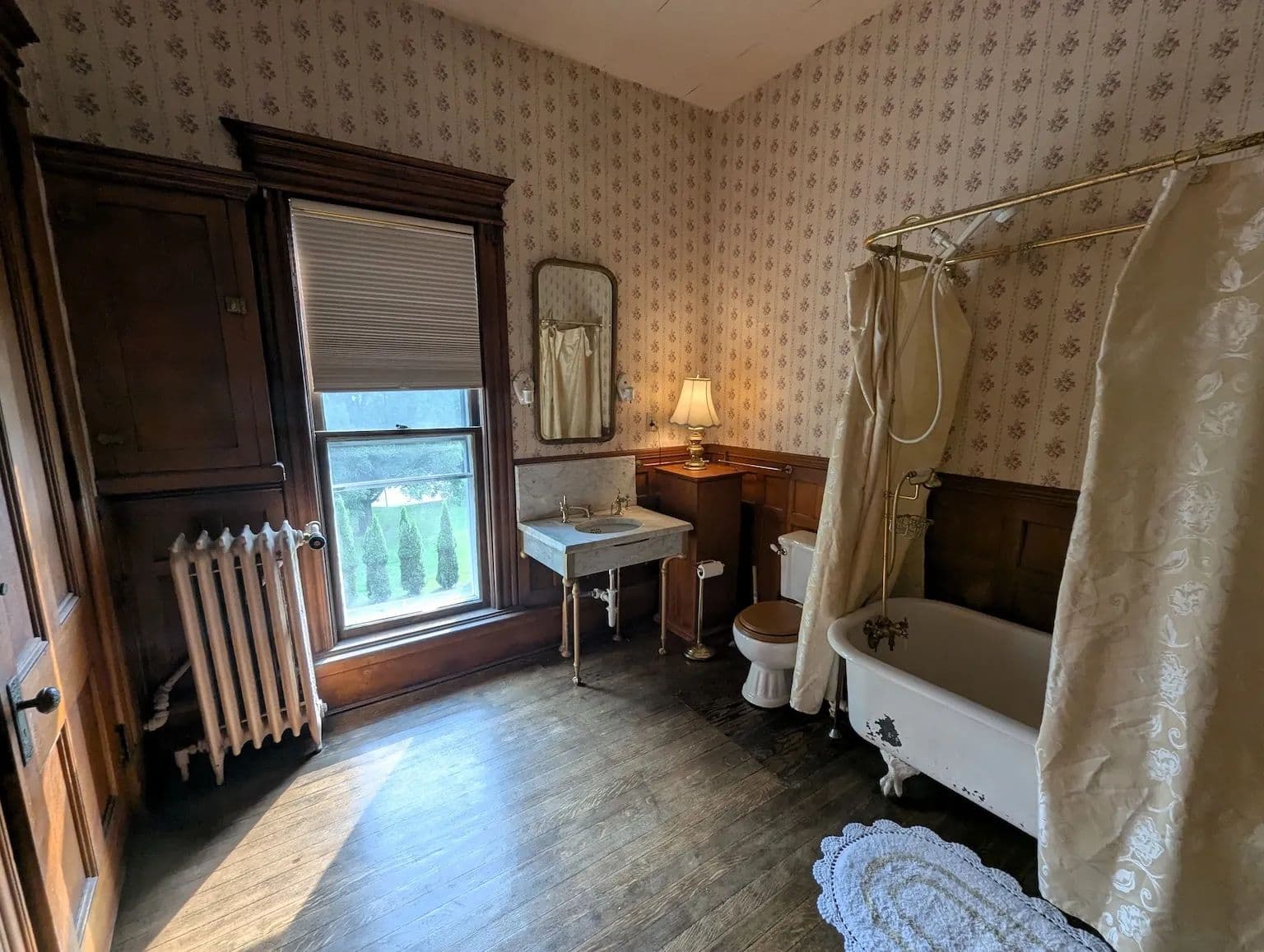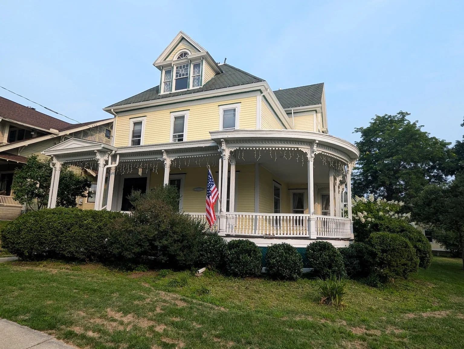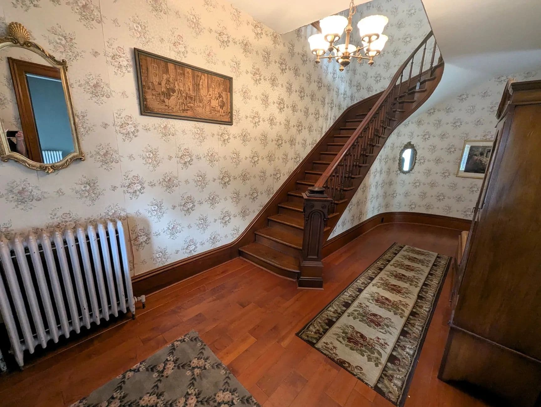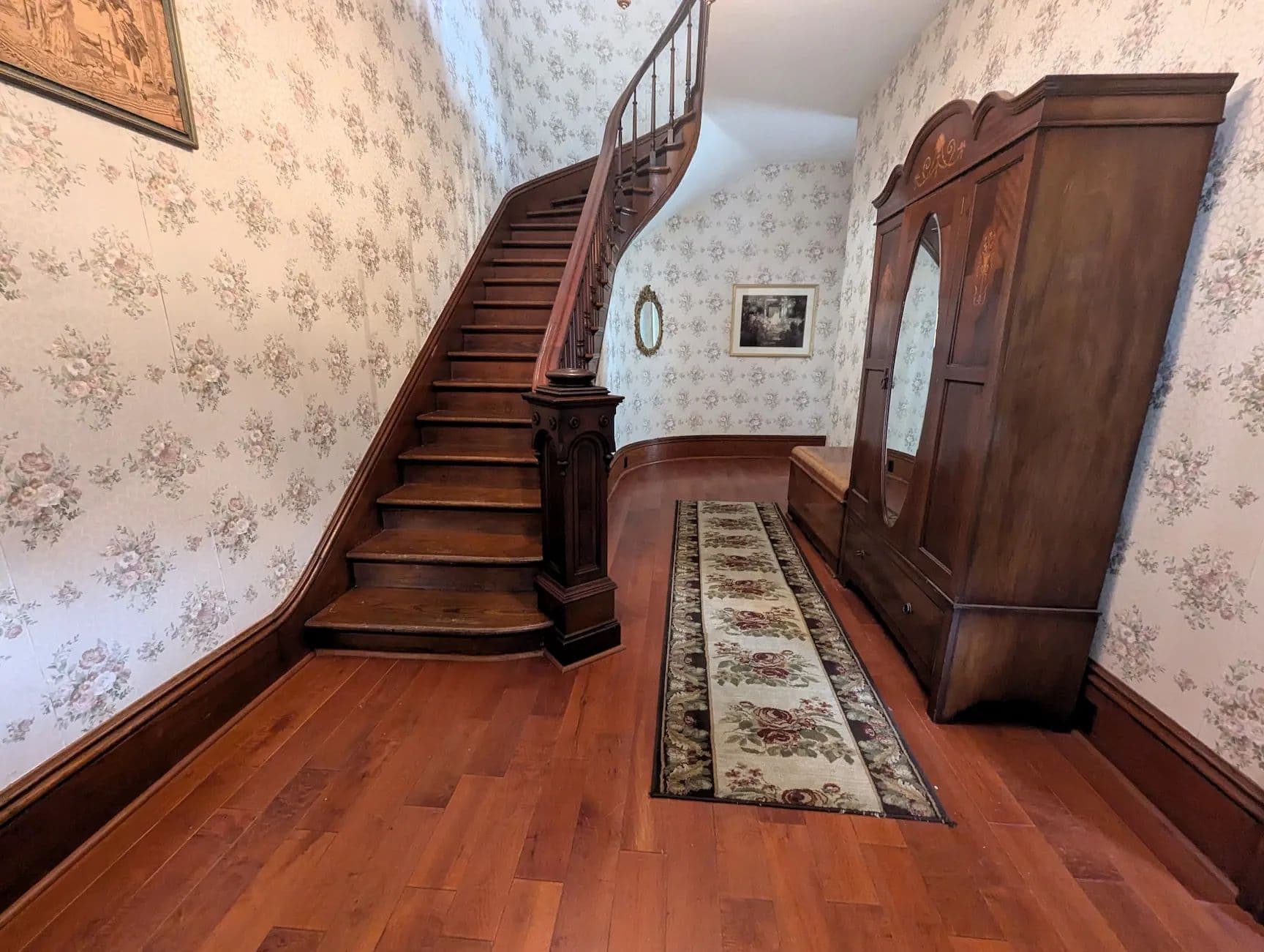 Step into the elegance of this historical Victorian home through the inviting wrap-around porch and into the grand foyer where you are immediately greeted by intricate woodwork and a stunning original curved staircase. The spacious front parlor flows seamlessly into a formal living room adorned with an impressive marble fireplace, rich trim work, and original hardwood floors that extend throughout the home. The first floor offers an abundance of space, including a large formal dining room, a cozy library showcasing exquisite craftsmanship, and a beautifully remodeled eat-in kitchen. The kitchen features quartz countertops, quality built-in cabinetry, updated flooring, and a walk-in pantry for added convenience.