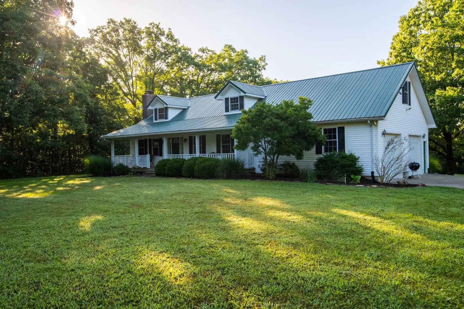 Landscaped grounds with gutters and downspouts on both house and shop