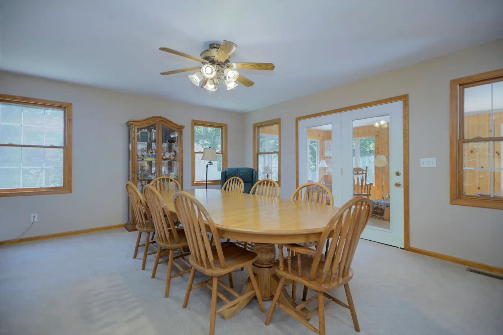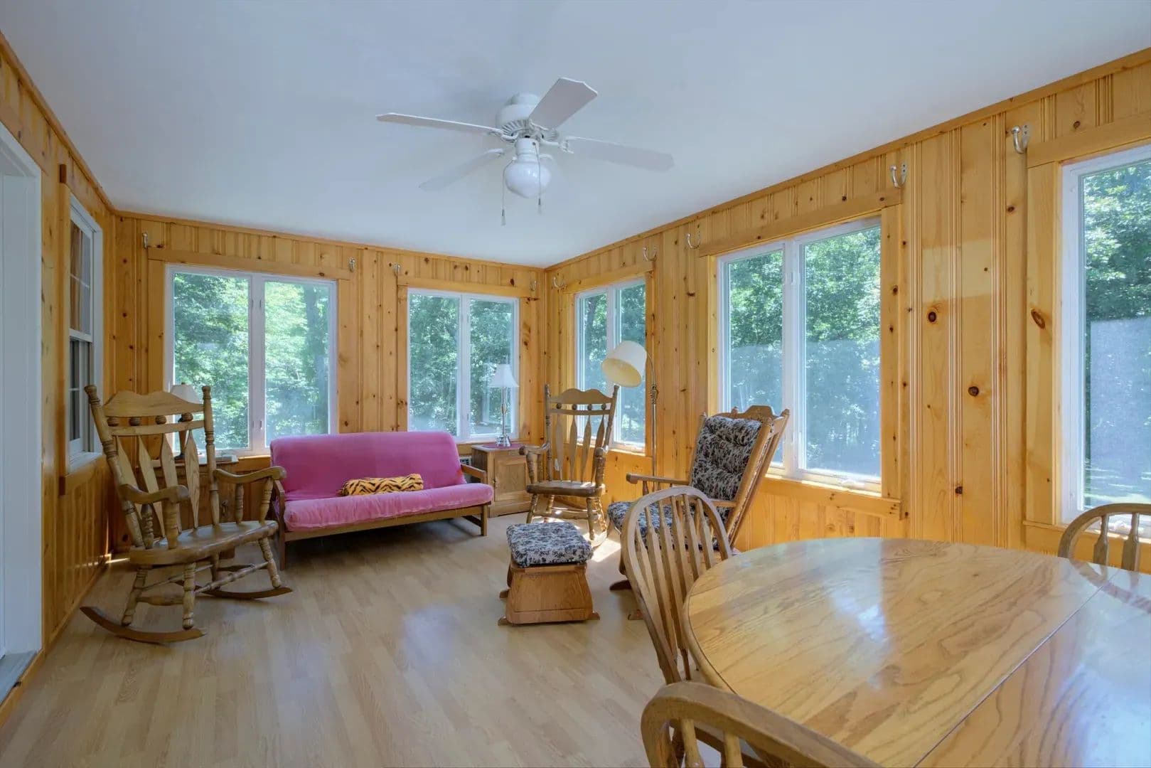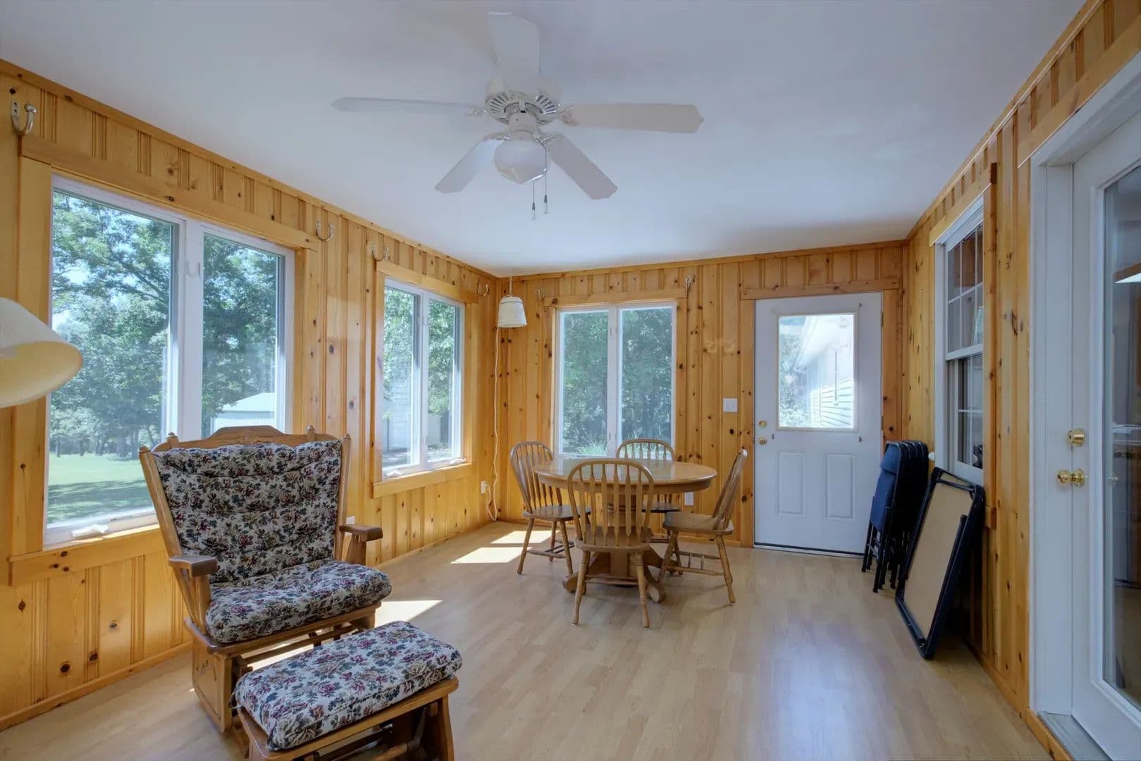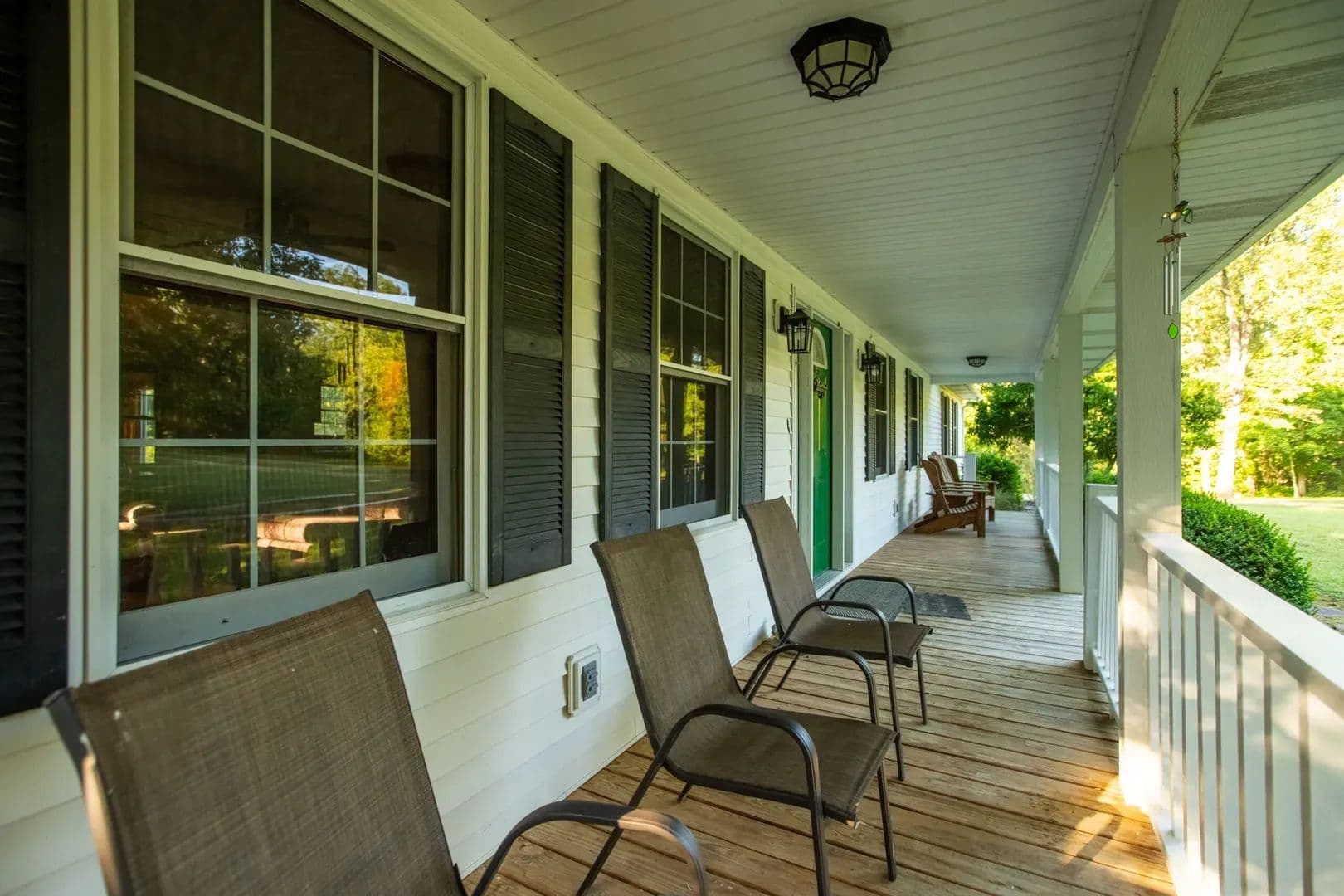 Outdoor living spaces: front deck, covered back patio, and sunroom