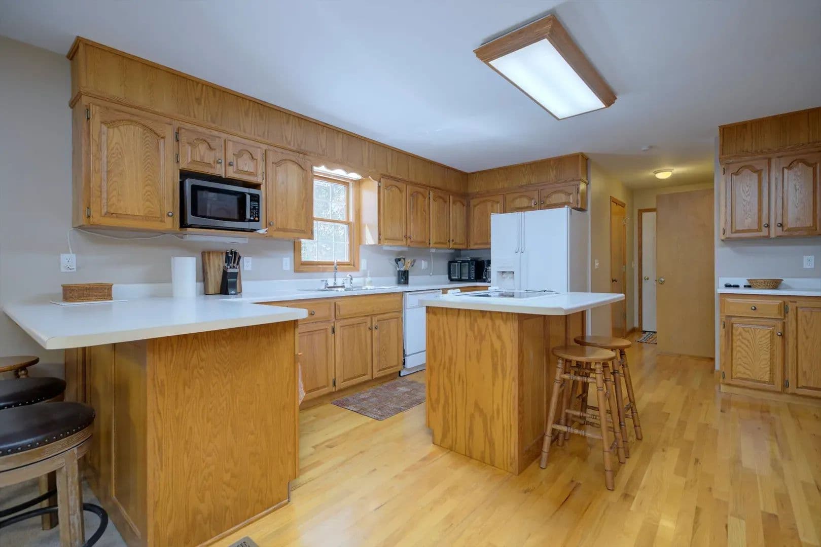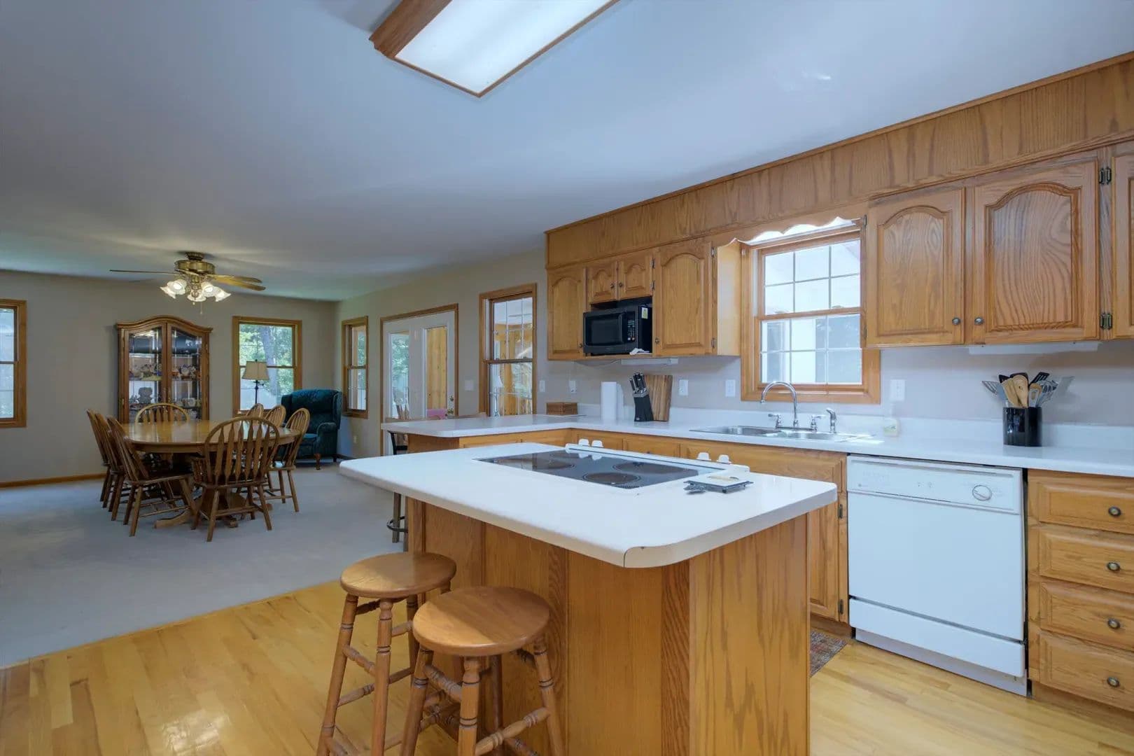 Open-concept kitchen with oak hardwood floors, abundant cabinetry, electric cooktop, and adjoining family room