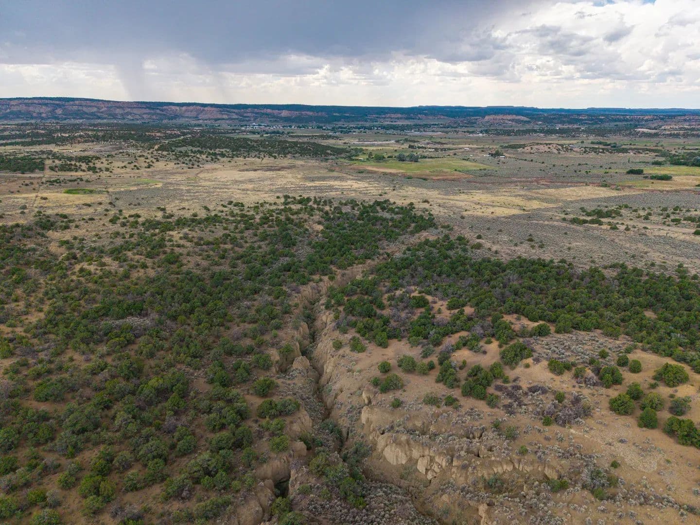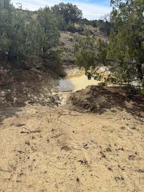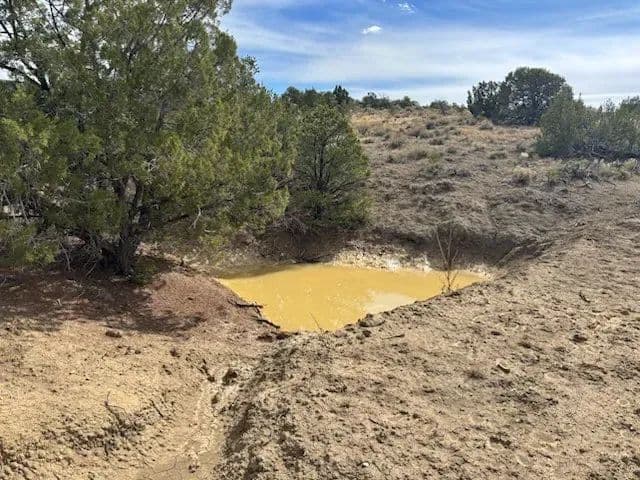 The landscape is primarily covered in healthy piñon-juniper woodland, with a few acres of open pasture near the road. Two narrow arroyos run through the property—one of which includes a newly constructed dirt tank that enhances wildlife habitat and seasonal water collection. Elevation sits at approximately 7,160 feet.