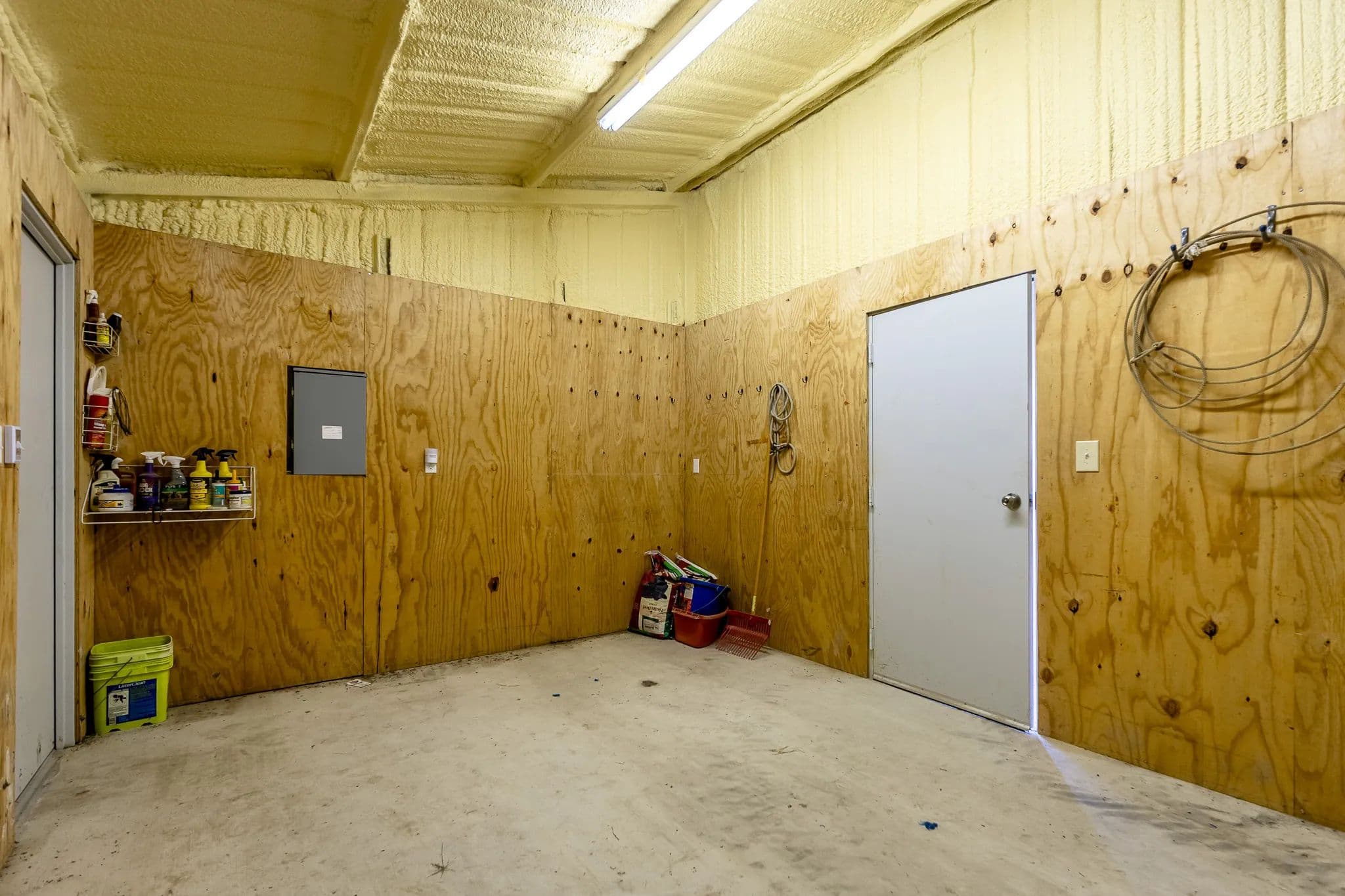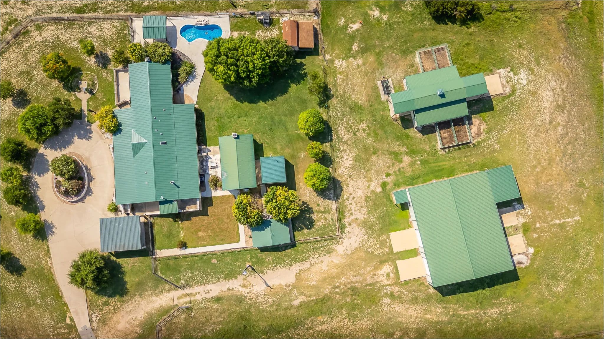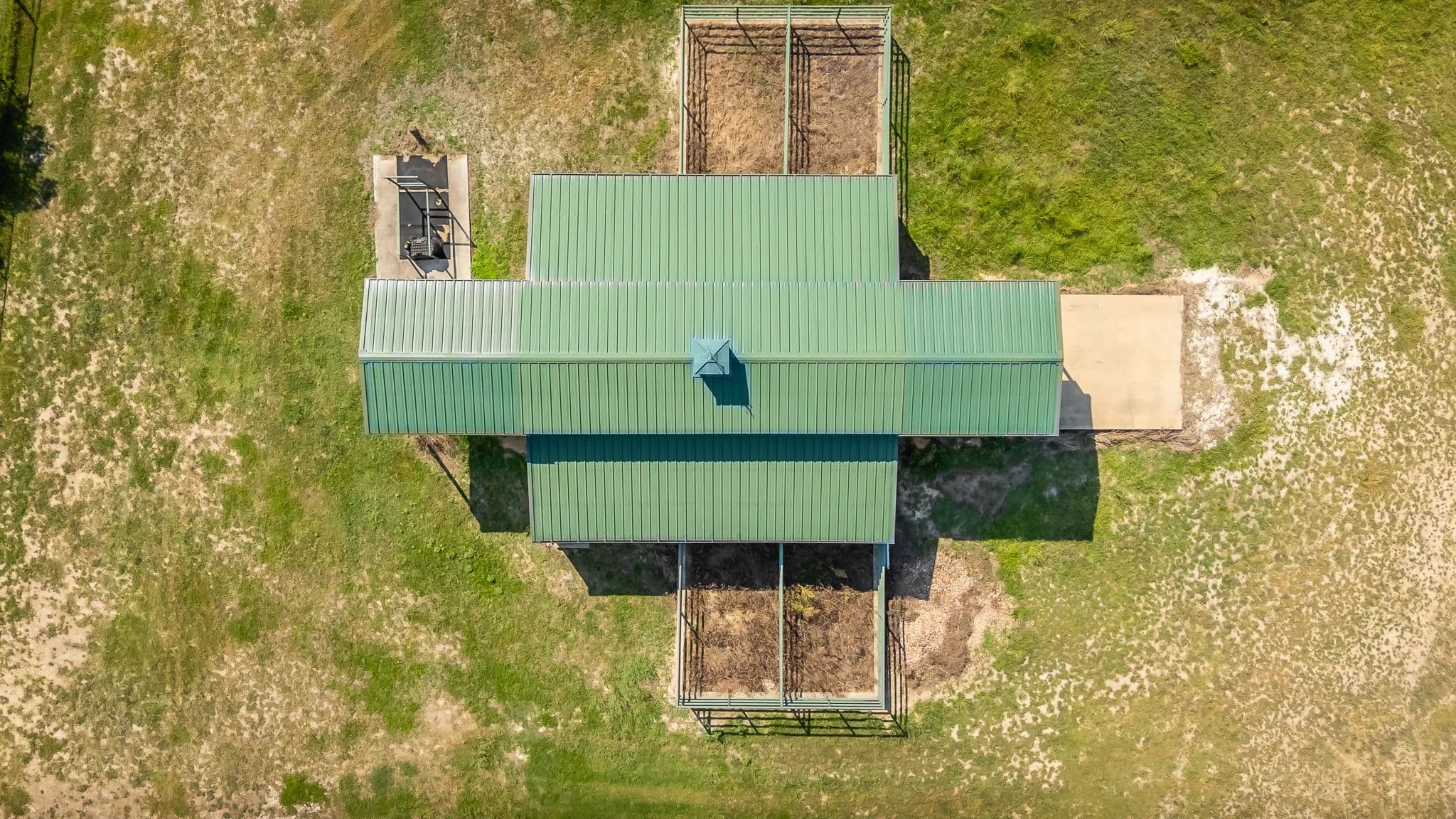 The main residence features three bedrooms, two bathrooms, and an office, along with an enclosed sunroom with a fireplace and an outdoor game room complete with its own fireplace, pool table, and shuffleboard. Recreational amenities include an in-ground pool, an outdoor spa room with a hot tub, and beautifully landscaped outdoor living areas. For equestrian needs, the horse barn is equipped with four stalls, a wash rack, a tack room, and dedicated feed and hay storage. The 75' x 55' equipment barn offers four bay doors, full electrical service, and water and septic hookups. Additional structures include a workshop with office space and a separate storage shed. The property is well-suited for livestock with a dedicated cattle and horse run, secure pipe fencing, and gated access. An underground storm shelter provides added safety.