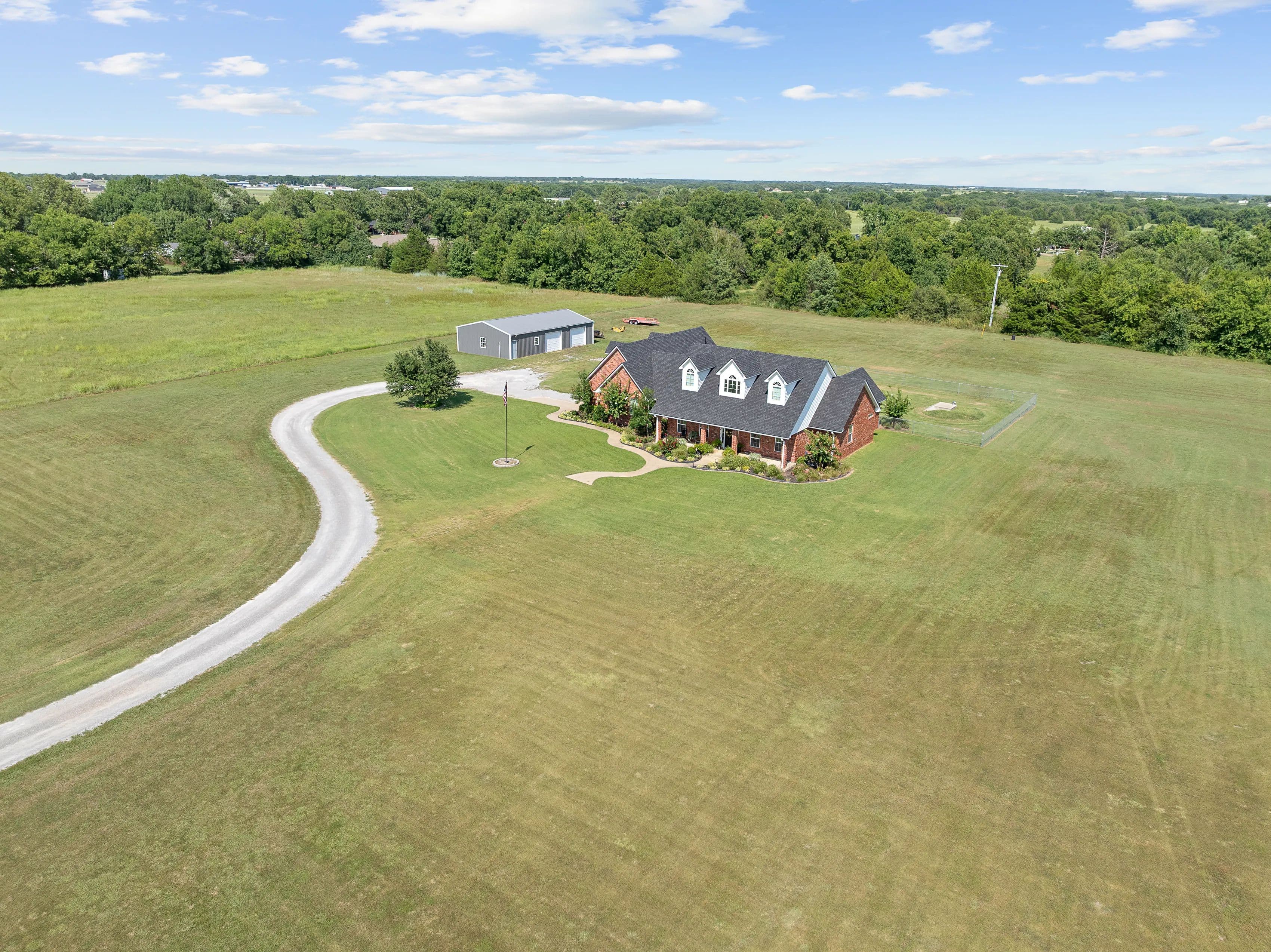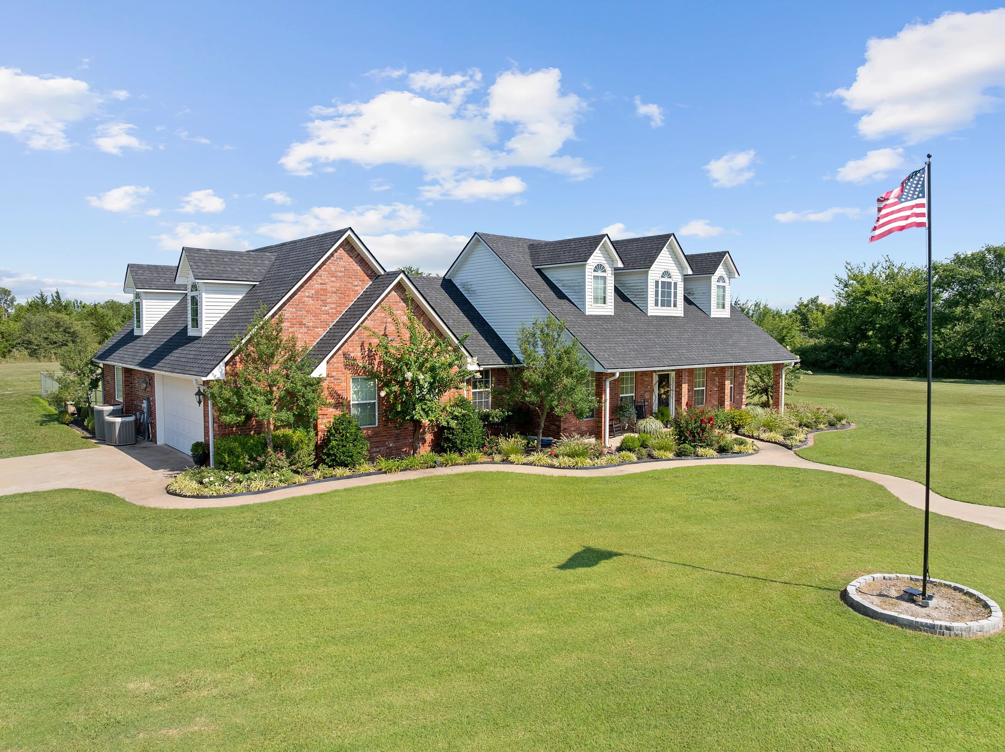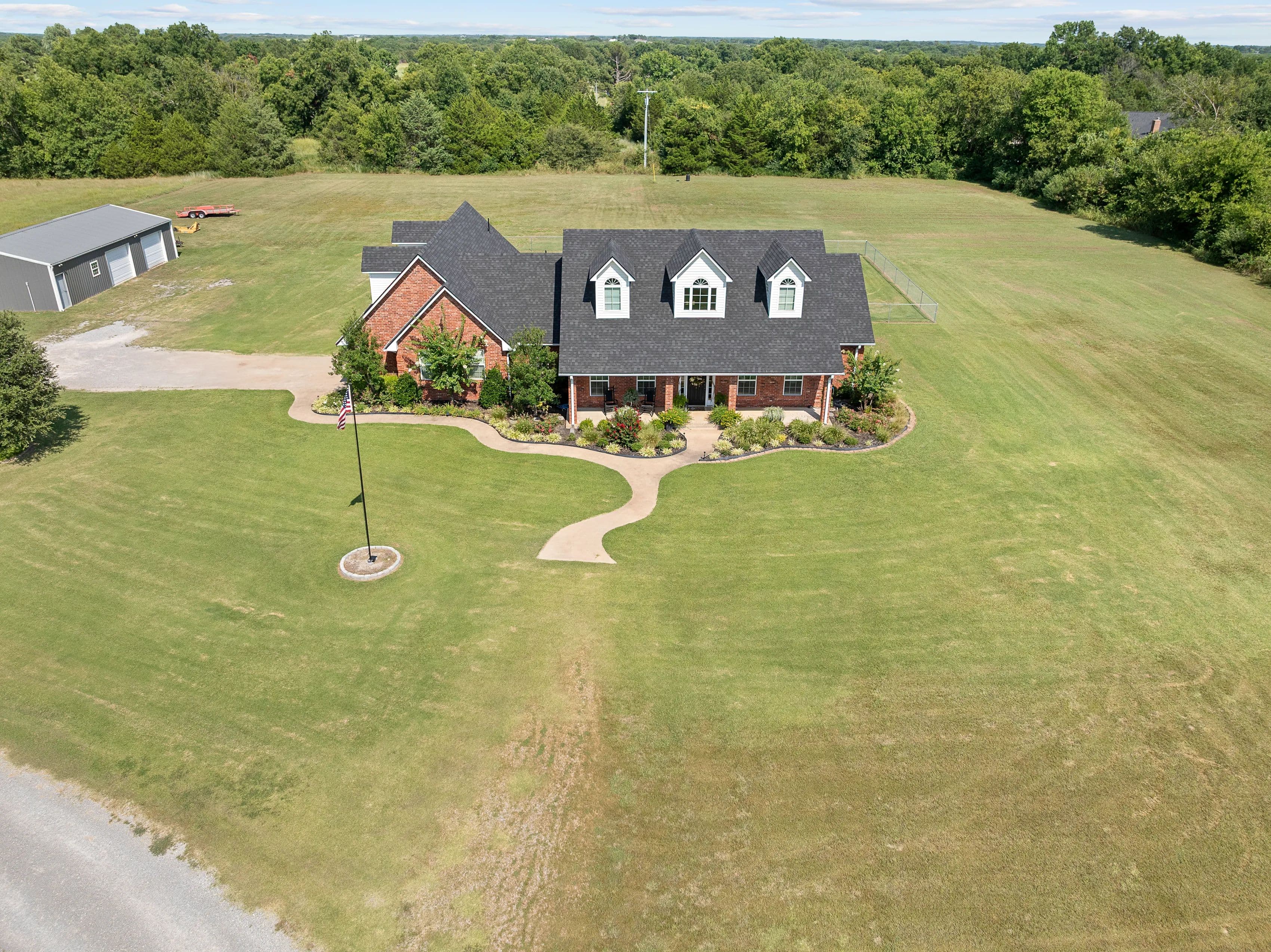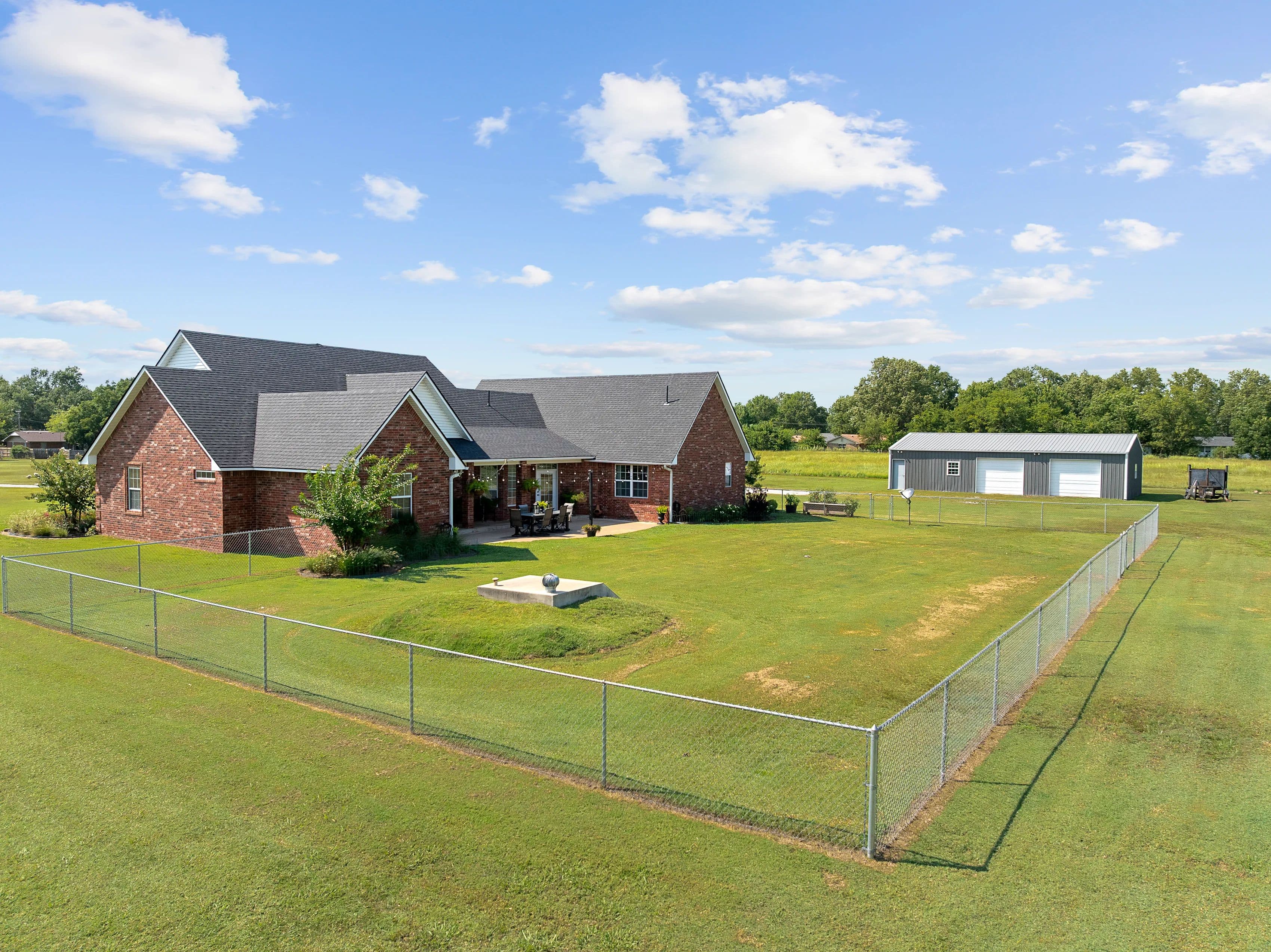 5-bedroom, 2.5-bath home on 10 acres, offering the perfect blend of privacy and convenience. Located just outside city limits but sitting right on the edge of town, the long driveway creates a secluded feel while still providing quick access to amenities. The flexible floor plan includes a 5th bedroom that could serve as an office with double doors opening to the entry hall, plus an upstairs bonus room-style bedroom. The main living area features vaulted ceilings and an open flow between the kitchen, breakfast nook, and living room, with a separate formal dining space for gatherings. The kitchen is equipped with granite countertops, an eat-in island, pantry, and plenty of workspace. The primary suite offers a relaxing en suite bath with a whirlpool tub, separate walk-in shower, and ample closet space. Additional highlights include a large laundry room with storage and sink, a storm shelter, fenced backyard with a concrete patio for outdoor enjoyment, and a new roof. A 30x50 insulated shop with electric, two overhead doors, and one walkthrough door (built in 2012) provides excellent space for hobbies, storage, or work. Utilities include PEC electric and City of Wynnewood water and sewer. This property is ideal for those seeking both comfort and room to spread out, all within minutes of town.