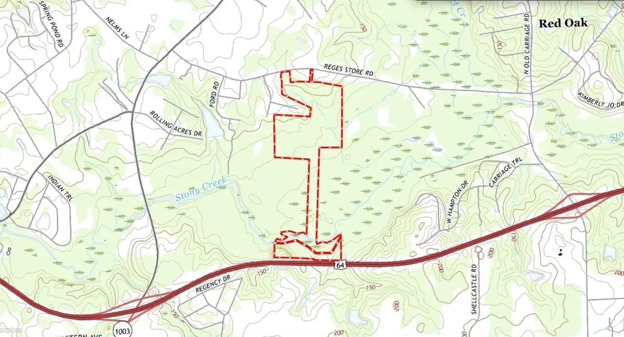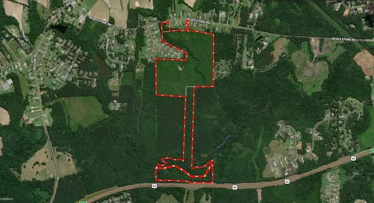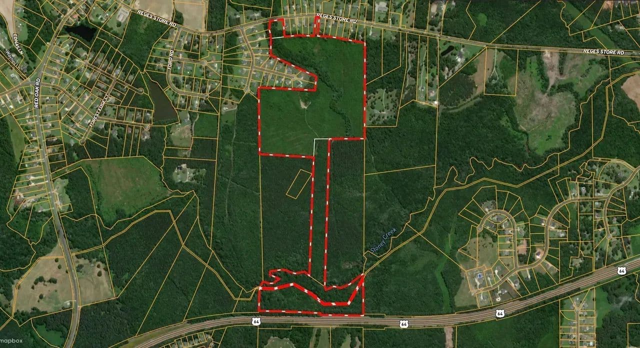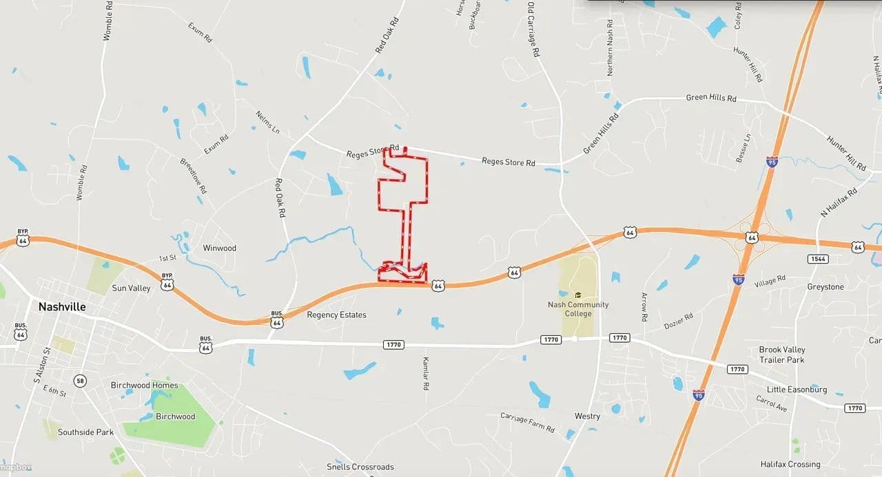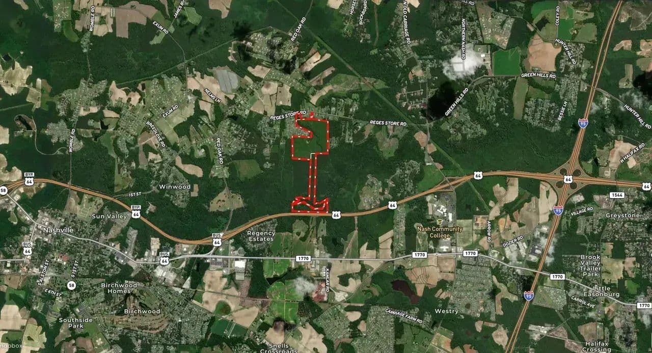 Discover this exceptional 104+/- acre development property, ideally situated just minutes from Nash Community College and I-95. This expansive assemblage consists of four parcels stretching nearly a mile from Reges Store Road to Highway 64. With a prime location and potential for residential development, the property offers access to all utilities. Sewer connection is on site and potentially available with annexation, a county water line is currently under construction along Reges Store Road. A scenic stream winds through the property, leading to floodplain and wetland areas, with about half of the land suitable for development. The listed address has not been assigned and is for location reference only. Conveniently located just outside the Nashville city limits, this property is less than five minutes from I-95, 45 minutes from Raleigh, less than 2 hours to Richmond and 2.5 hours from the North Carolina coast. Don’t miss this prime investment opportunity in a rapidly growing area!