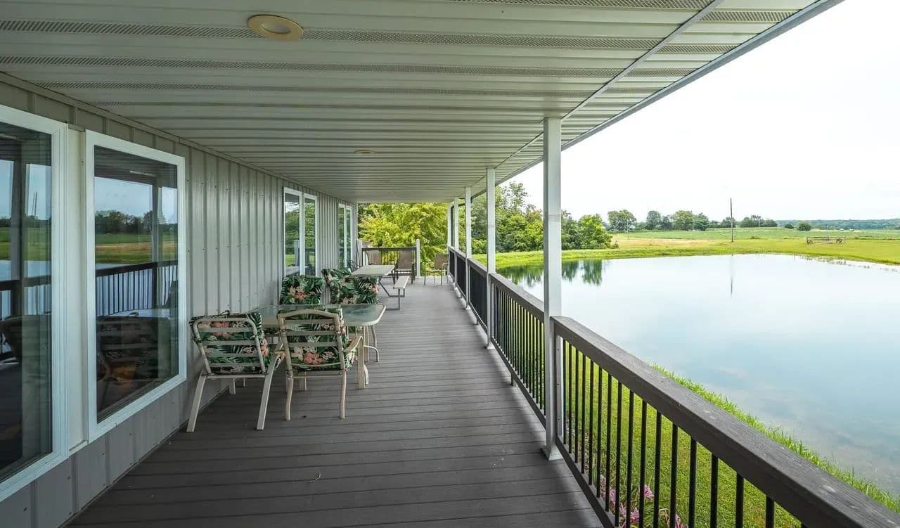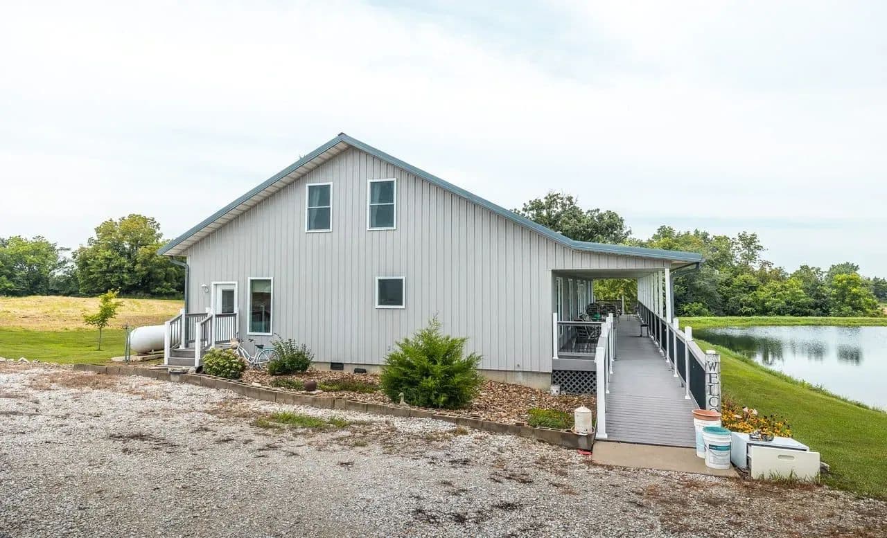 Drive through the gates and follow the lane as it opens to a breathtaking view a beautiful home across the water, perfectly framed by a ¾-acre stocked lake. This 10 acre property offers a harmonious mix of open land and enough timber for hunting. Surrounded by rich agricultural fields, these woods are home to trophy-class North Missouri bucks and abundant wild turkey. The stunning 5-bedroom, 6-bath residence boasts an 80-foot covered front porch overlooking the lake, where you can watch large fish swimming just below the surface. Inside, an open-concept living and dining area with a cozy fireplace flows into a chef’s kitchen featuring custom cabinetry, quartz countertops, and an impressive 6' x 12' island — perfect for gatherings. A large walk-in pantry with ample shelving keeps everything organized, and the master suite includes a whirlpool tub for relaxing after a long day. Previously used as a vacation rental, the home is equally suited as a private retreat or full-time residence. The property also includes two productive garden spots with rich, loamy soil, a pavilion by the lake, a three-car detached garage with workshop, and an additional carport. Located just 8 miles from the Mississippi River and Fenway public access, this property offers both seclusion and convenience — a rare opportunity for those seeking beauty, recreation, and income potential all in one.