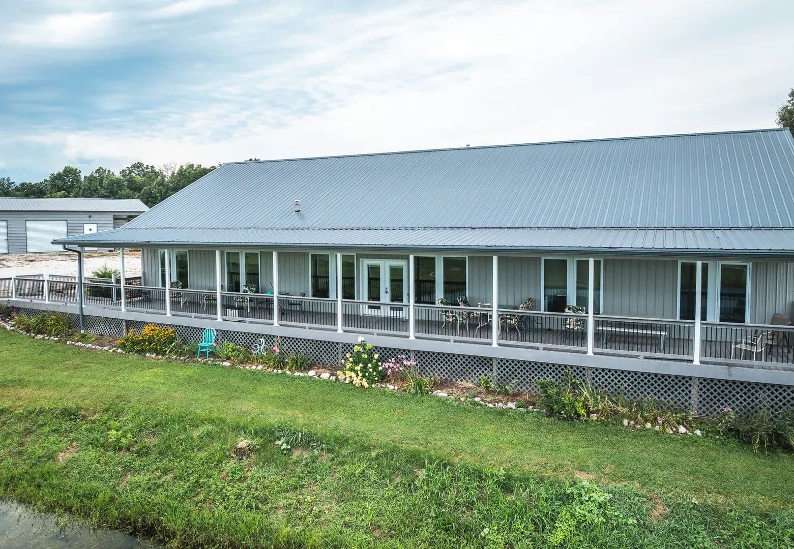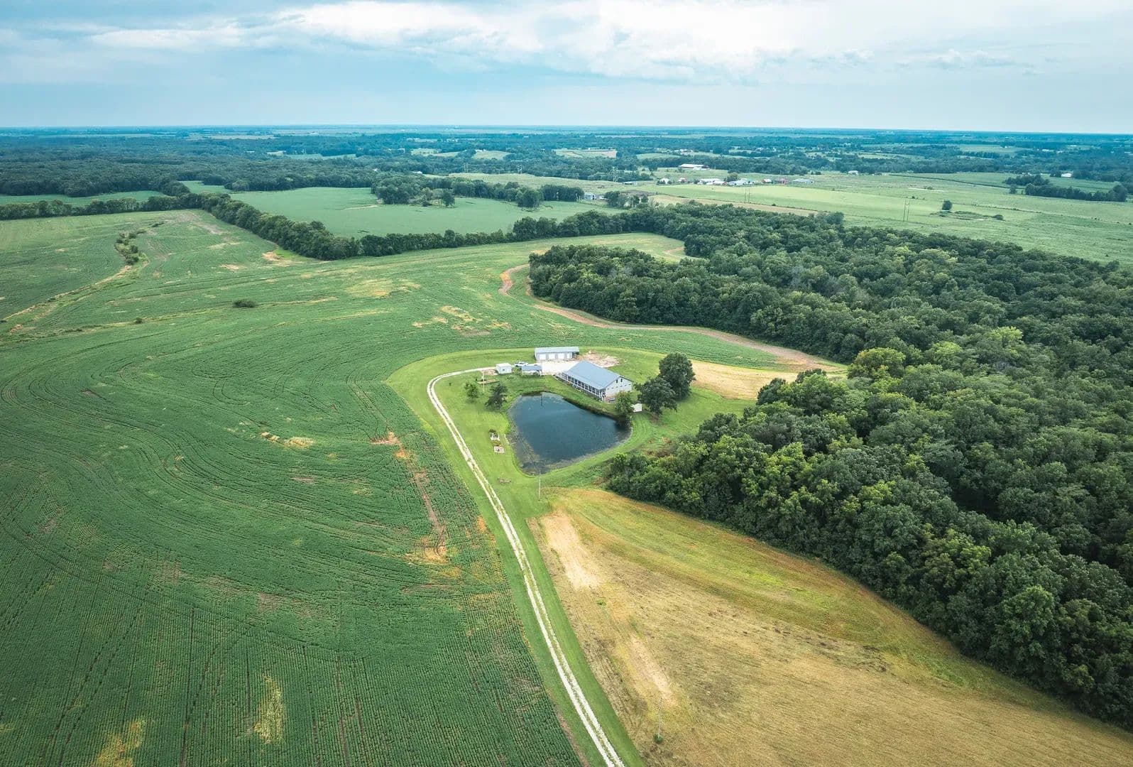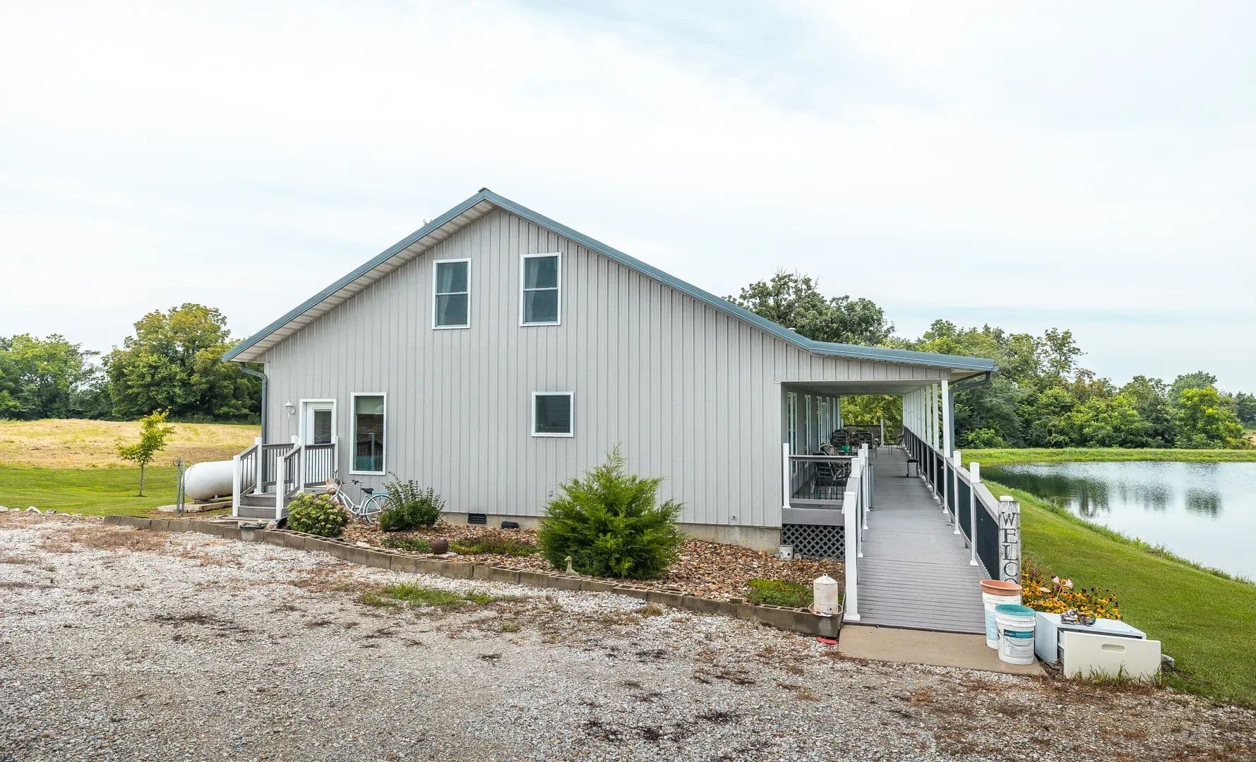 Drive through the gates and follow the lane as it opens to a breathtaking view a beautiful home across the water, perfectly framed by a ¾-acre stocked lake. This 10 acre property offers a harmonious mix of open land and enough timber for hunting. Surrounded by rich agricultural fields, these woods are home to trophy-class North Missouri bucks and abundant wild turkey. The stunning 5-bedroom, 6-bath residence boasts an 80-foot covered front porch overlooking the lake, where you can watch large fish swimming just below the surface. Inside, an open-concept living and dining area with a cozy fireplace flows into a chef’s kitchen featuring custom cabinetry, quartz countertops, and an impressive 6' x 12' island — perfect for gatherings. A large walk-in pantry with ample shelving keeps everything organized, and the master suite includes a whirlpool tub for relaxing after a long day. Previously used as a vacation rental, the home is equally suited as a private retreat or full-time residence. The property also includes two productive garden spots with rich, loamy soil, a pavilion by the lake, a three-car detached garage with workshop, and an additional carport. Located just 8 miles from the Mississippi River and Fenway public access, this property offers both seclusion and convenience — a rare opportunity for those seeking beauty, recreation, and income potential all in one.