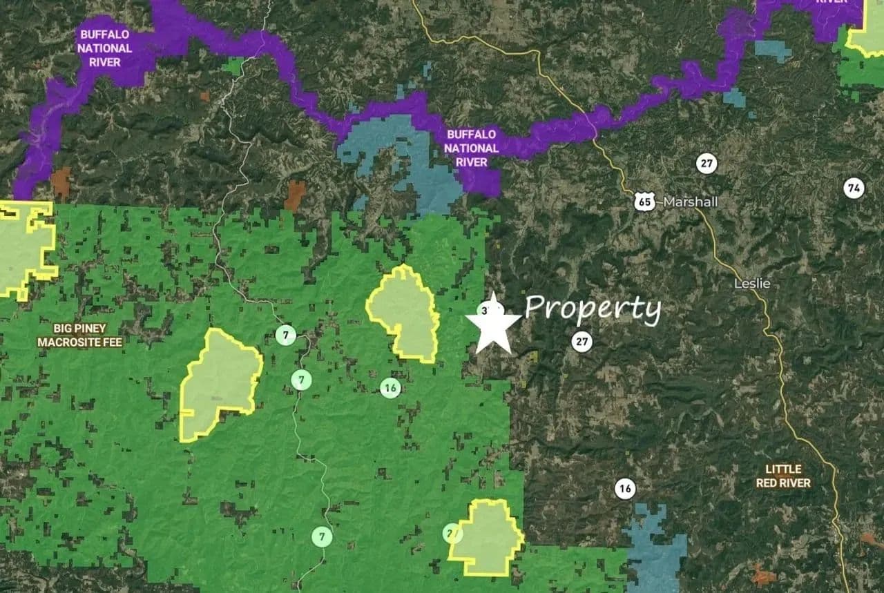 166 acres of prime hunting adjoing Ozark National Forest! Electric is on site and public water is on the entry road, making this a perfect spot to build your weekend getaway or hunting cabin. Pull just through the private gate to a flat clearing that would be a perfect spot to build, or drive a little up the hill to build with amazing views. A spring fed creek runs through the entire northern section of the property and is surrounded by over 100 acres of mature timber and beautiful rock bluffs. The steep terrain along the creek, paired with the roughly 60 acres of cut timber with thick, new growth is a perfect recipe for holding lots of wildlife. Don't forget the direct access to thousands of acres of National Forest ground on the Western property line. Just a quarter mile off the highway, the access can't get much easier to a property loaded with big deer, bear and turkey. Great trail system and newer perimeter fencing on a large portion. Buffalo River and Little Red River are both just a short drive away for floating and fishing!