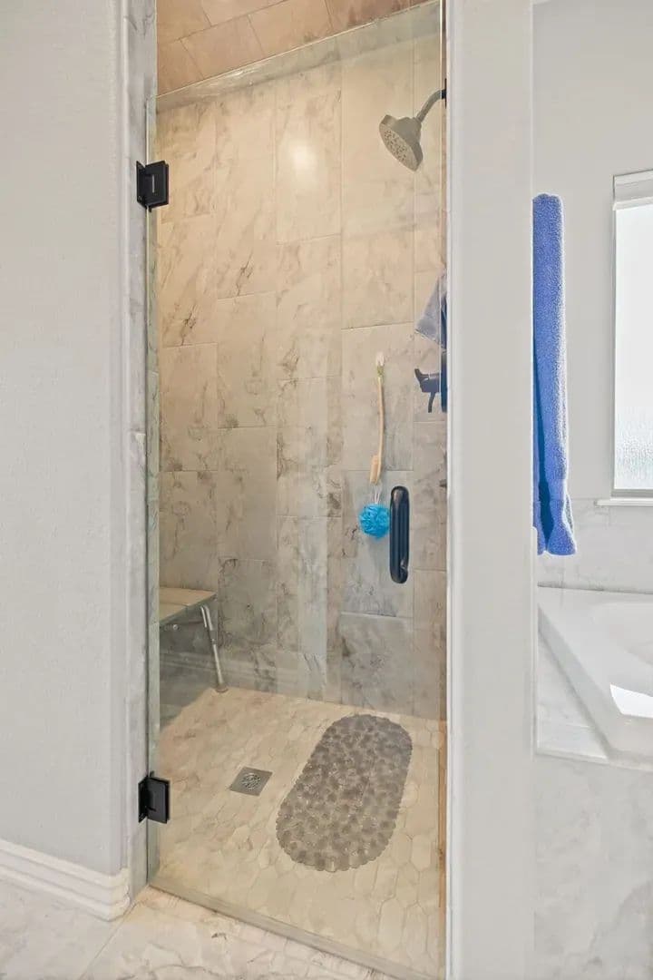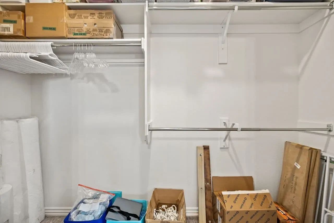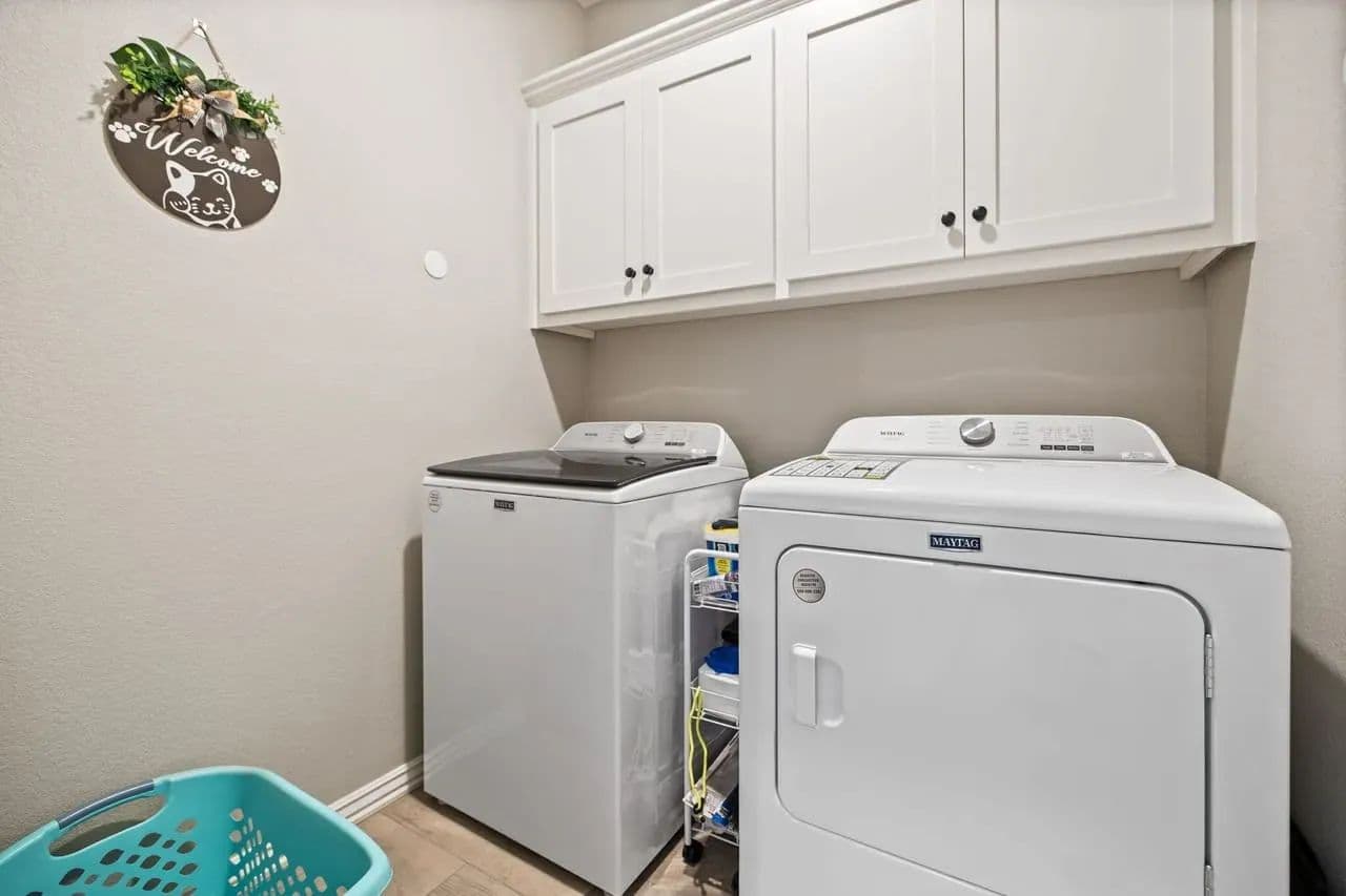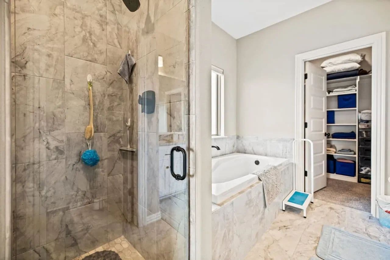 This modern home offers stylish living with beautiful wood-look tile flooring in the main areas, carpet in the bedrooms, and a spacious master suite featuring walk-in closets, an oversized tub, and a tiled shower in the master bath.