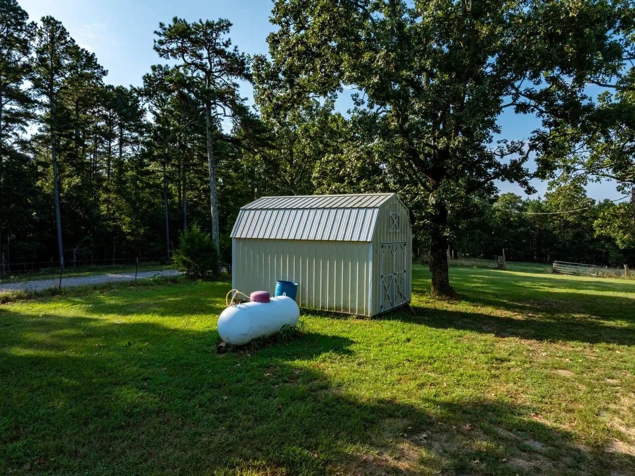 Storage shed, gated entry, and natural tree-lined borders for added privacy