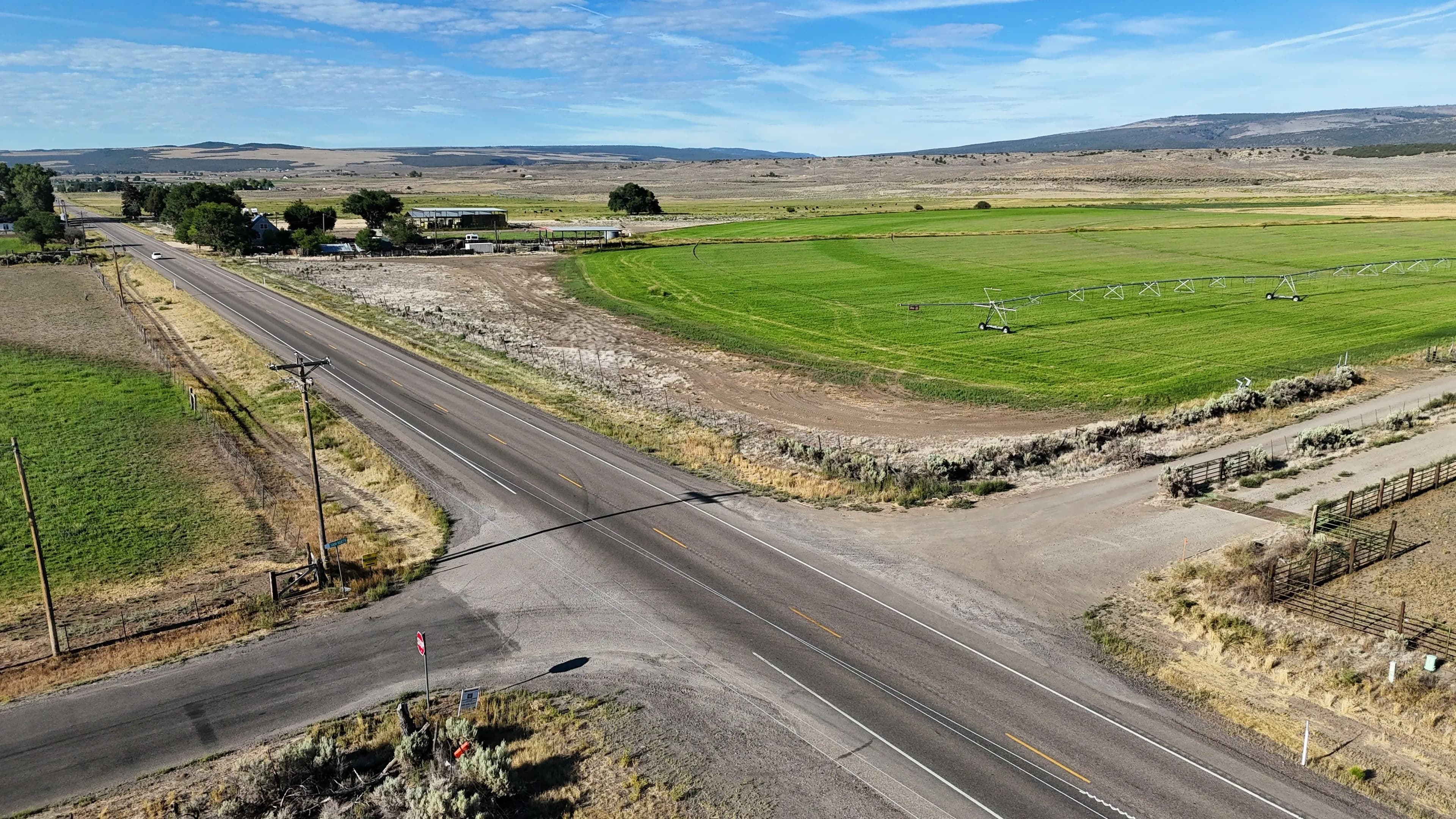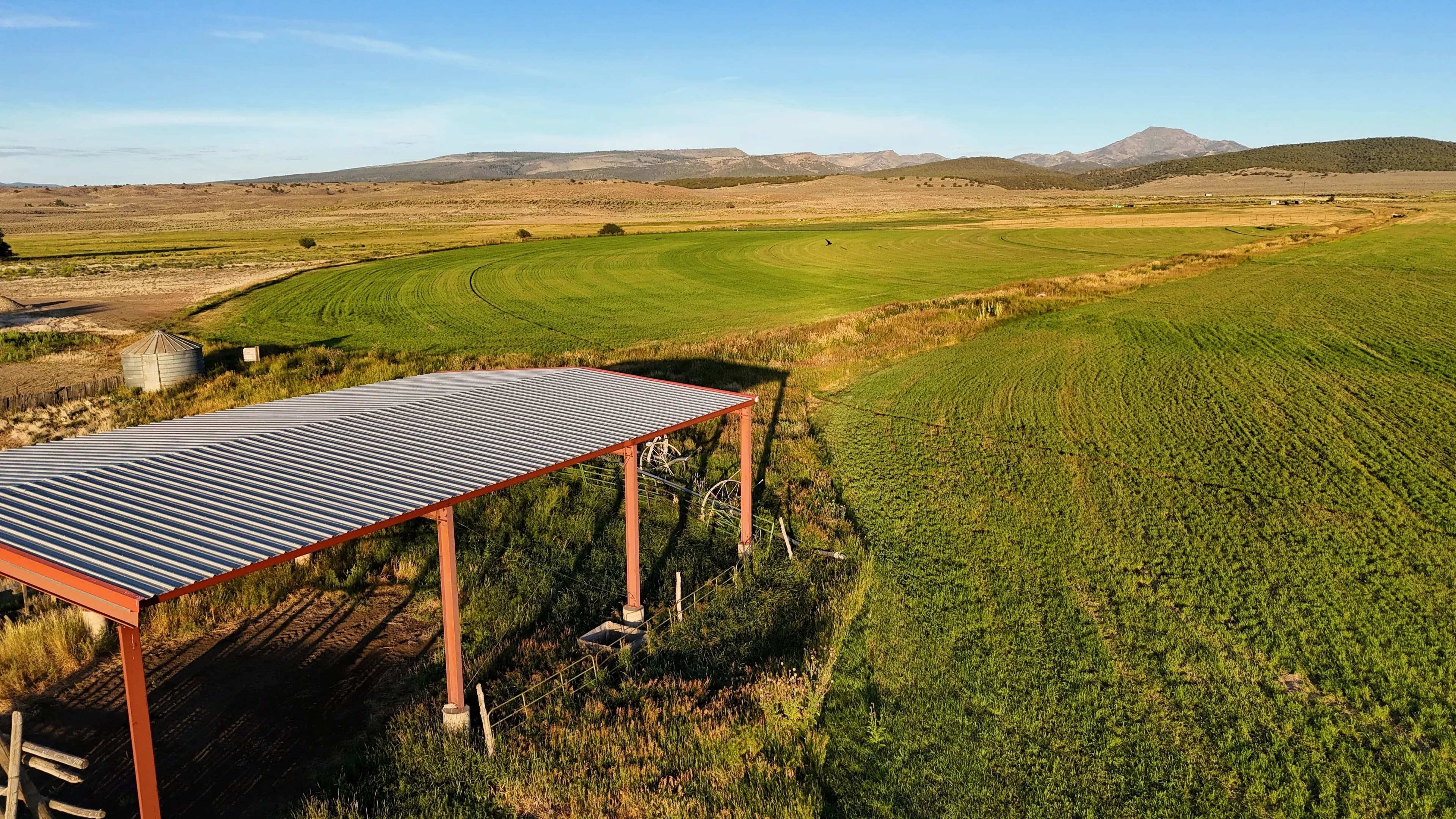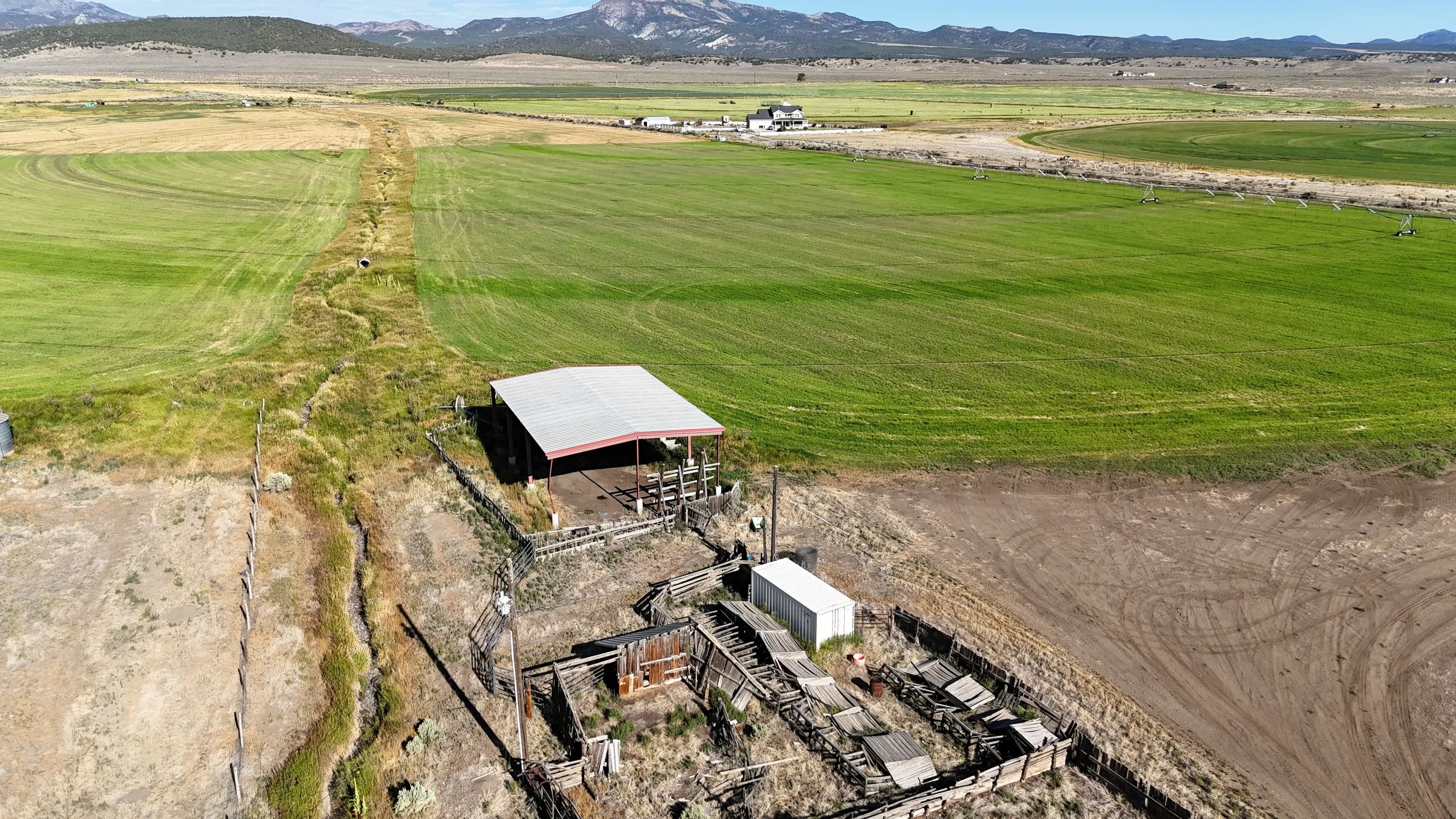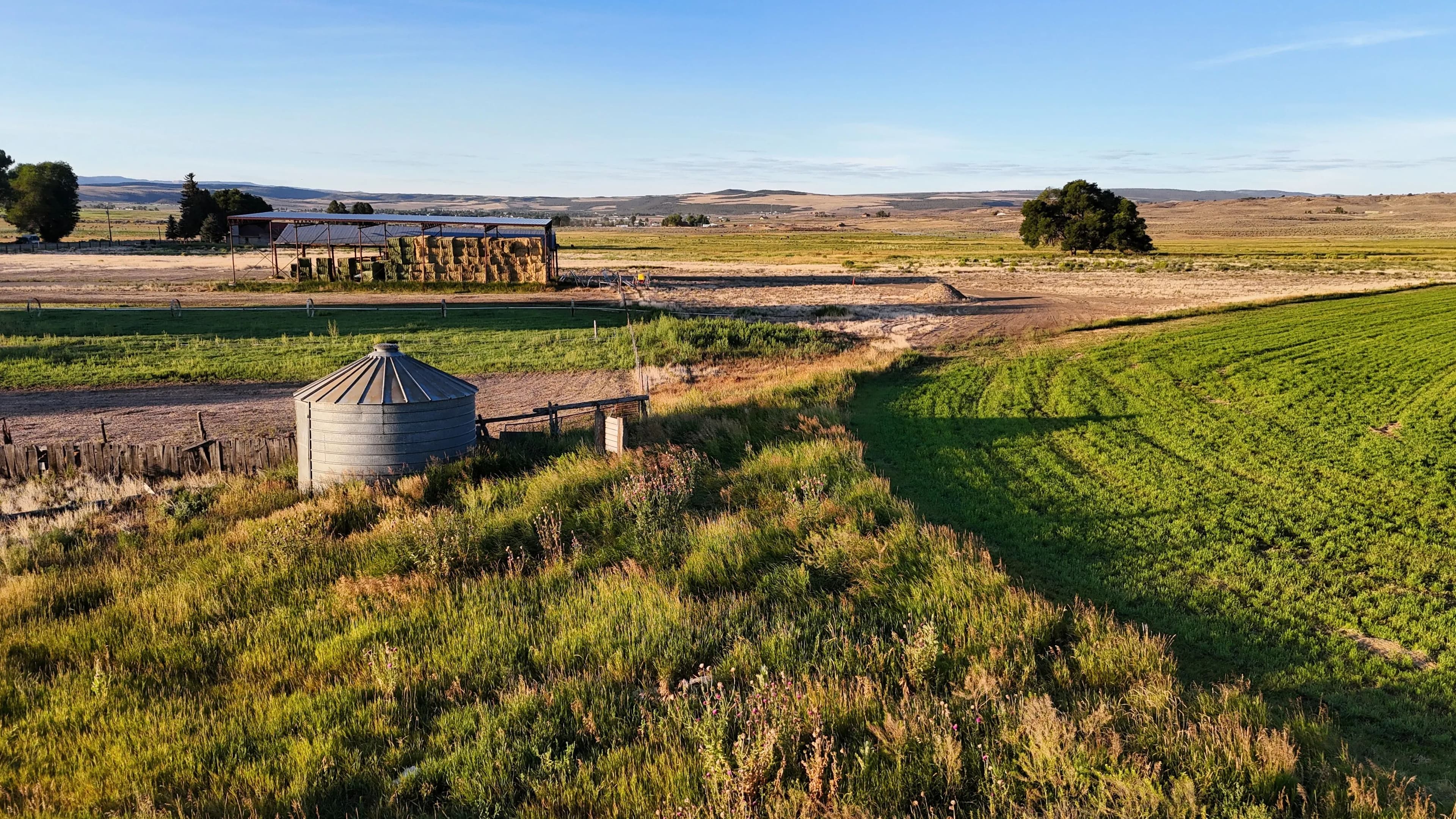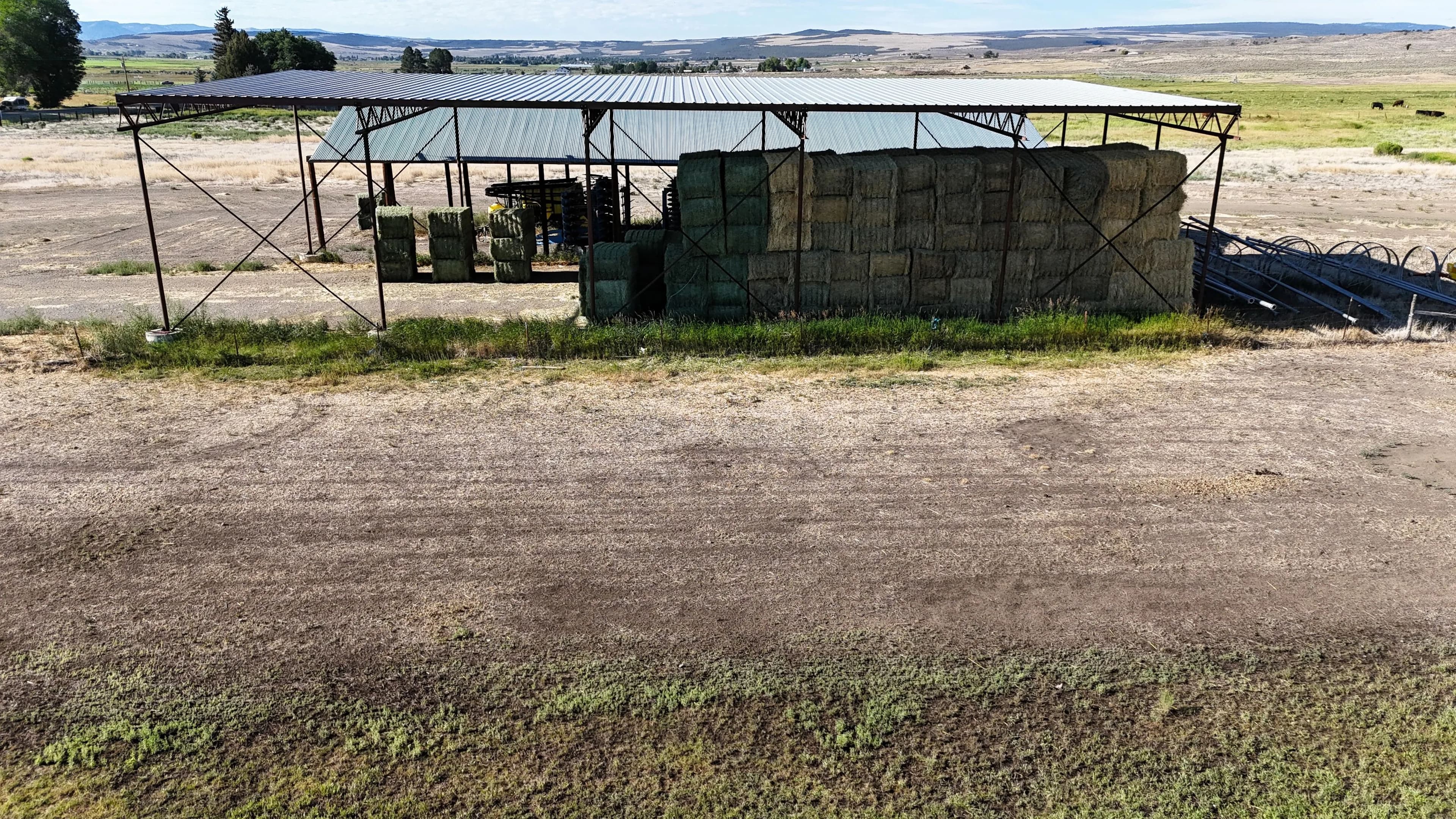 On-site improvements include two hay barns totaling 10,000 square feet of covered storage, perimeter fencing, stock corrals near the highway, and agricultural infrastructure already in place. Well depths in the area range from 80 to 150 feet, offering reliable water access.