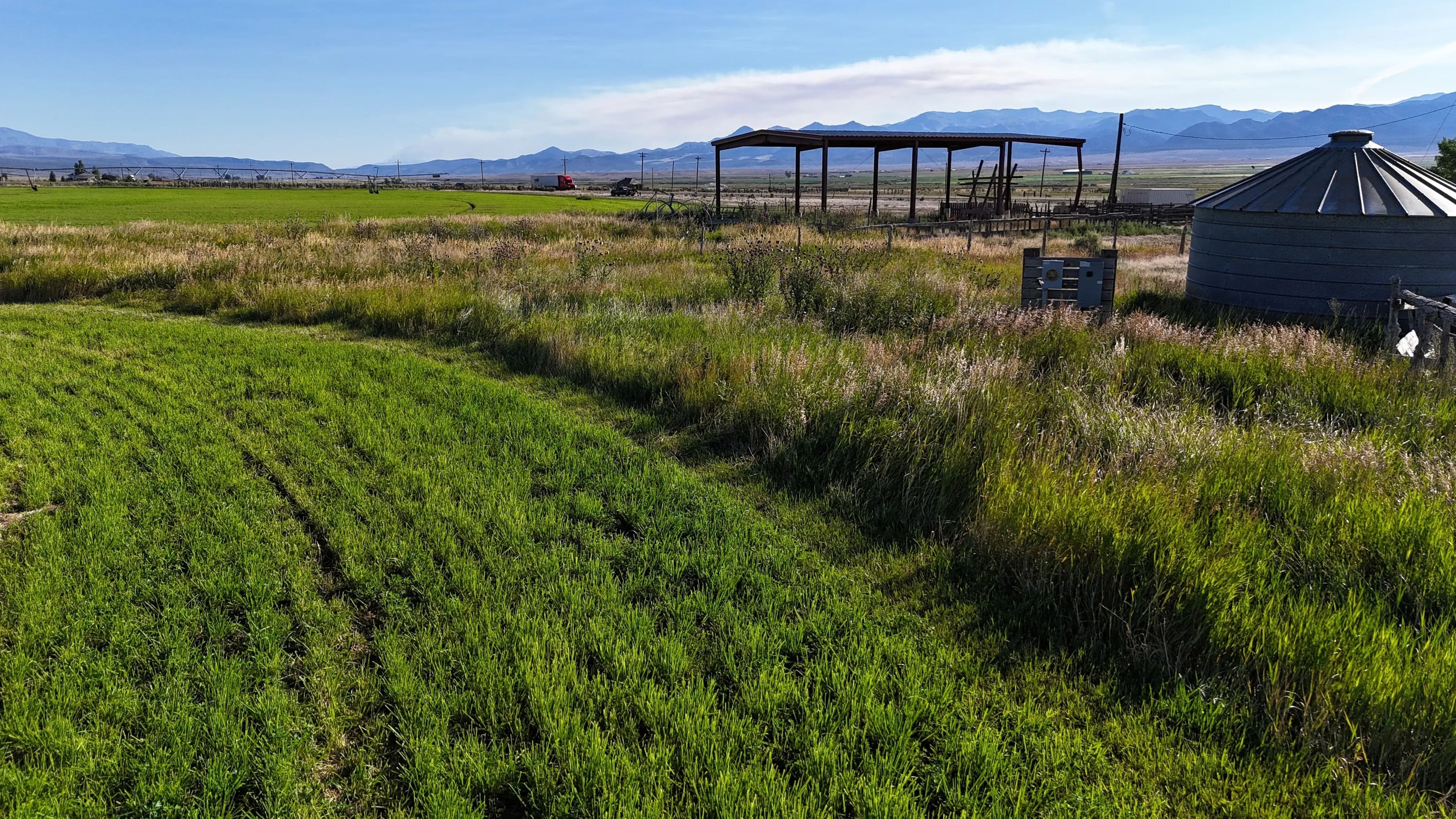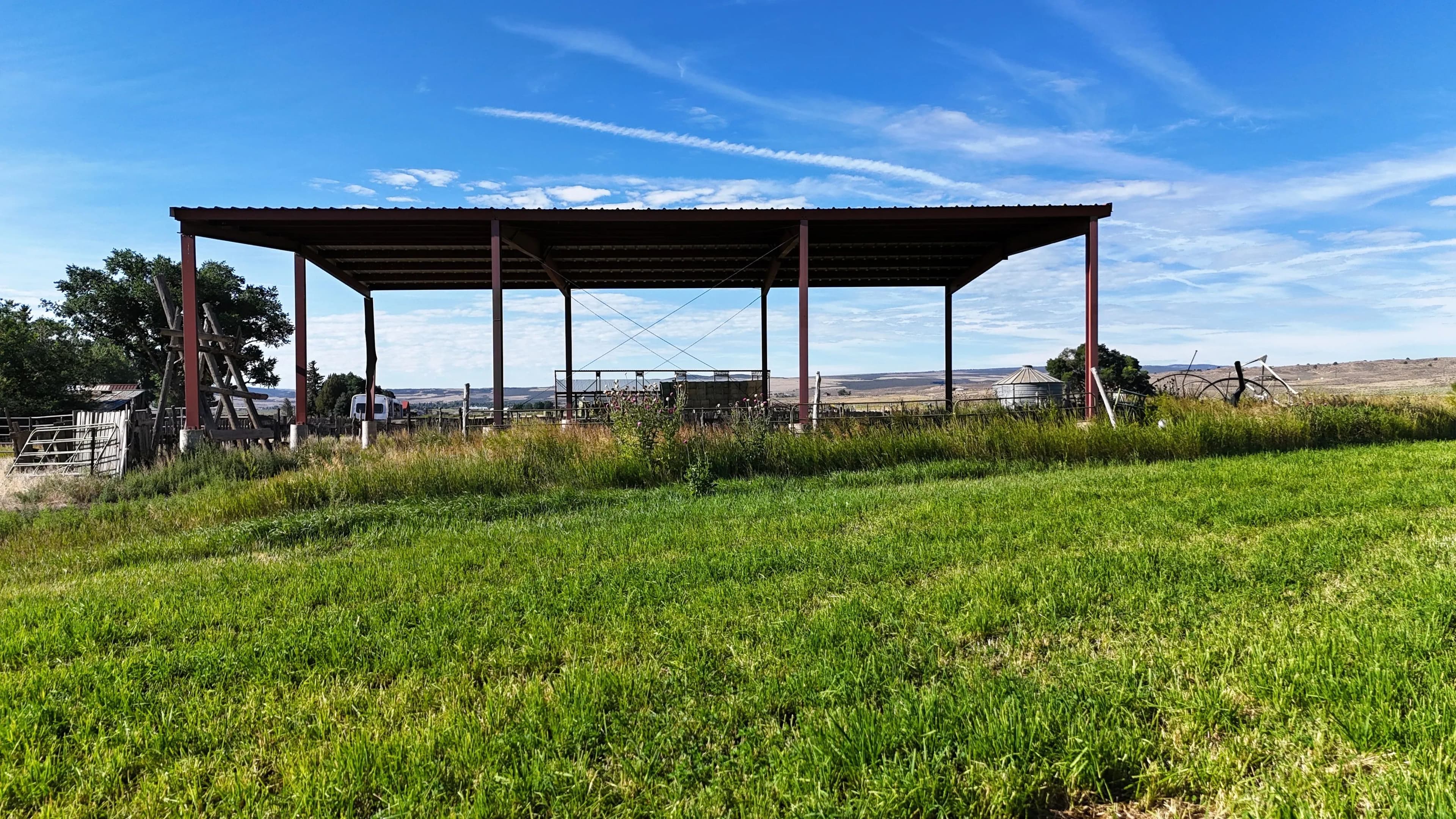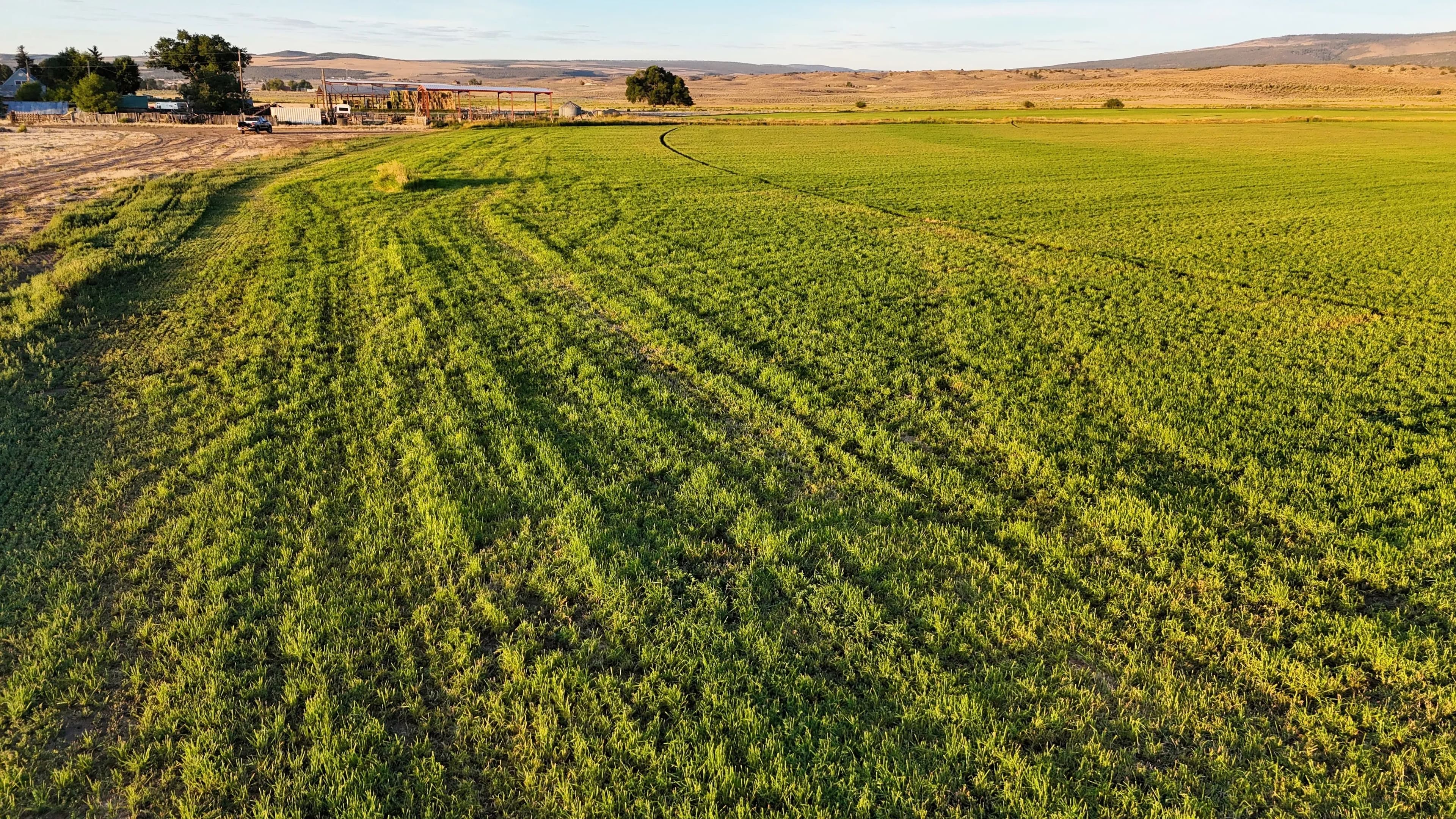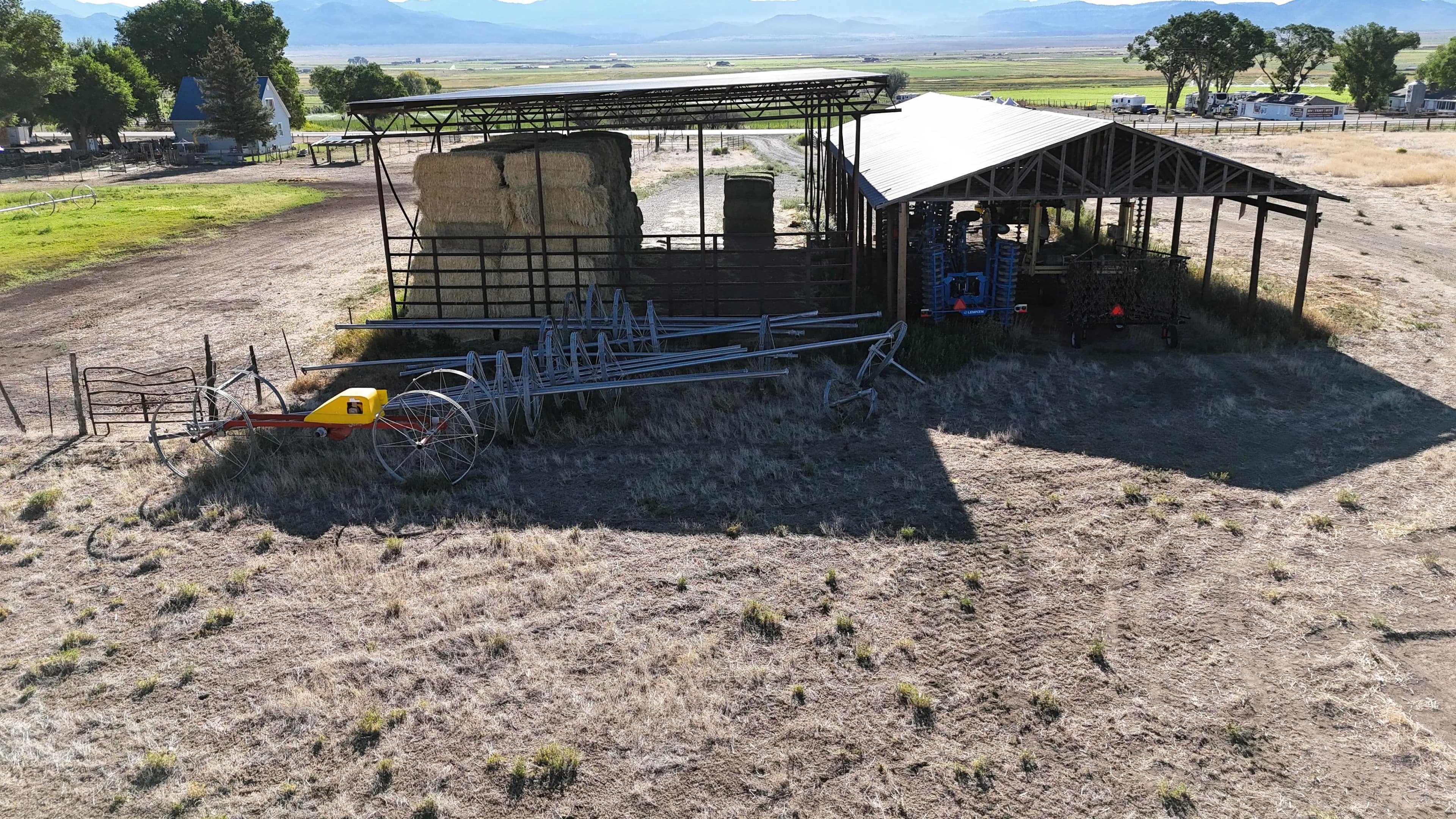 On-site improvements include two hay barns totaling 10,000 square feet of covered storage, perimeter fencing, stock corrals near the highway, and agricultural infrastructure already in place. Well depths in the area range from 80 to 150 feet, offering reliable water access.