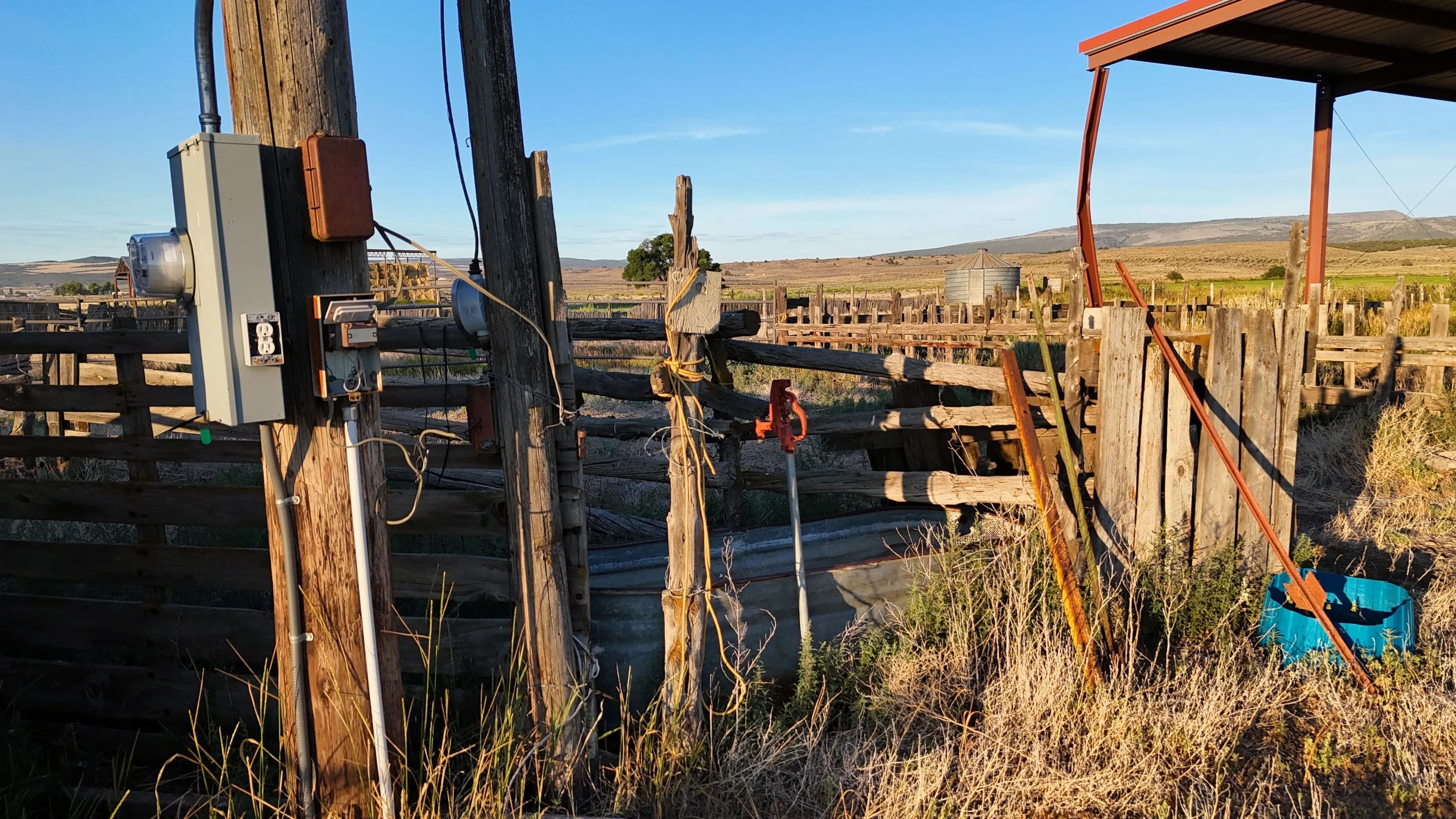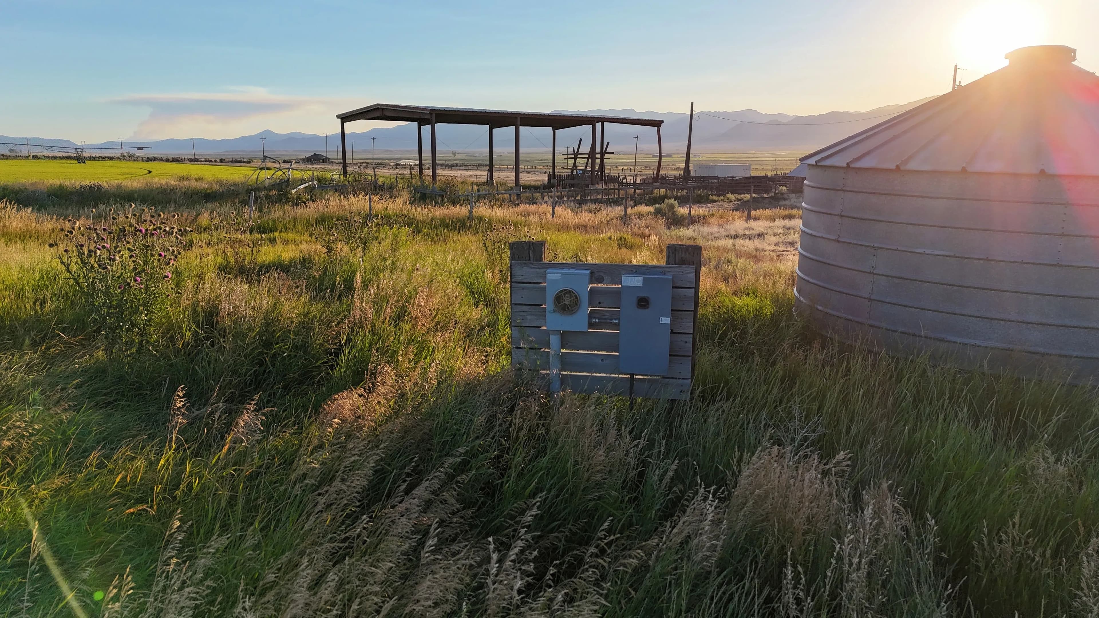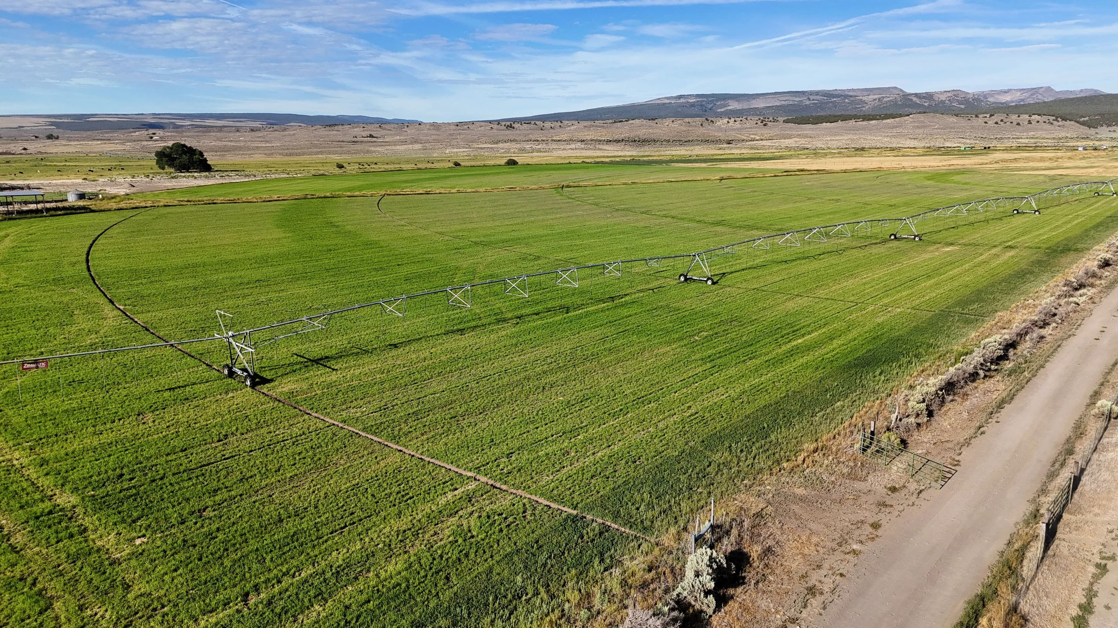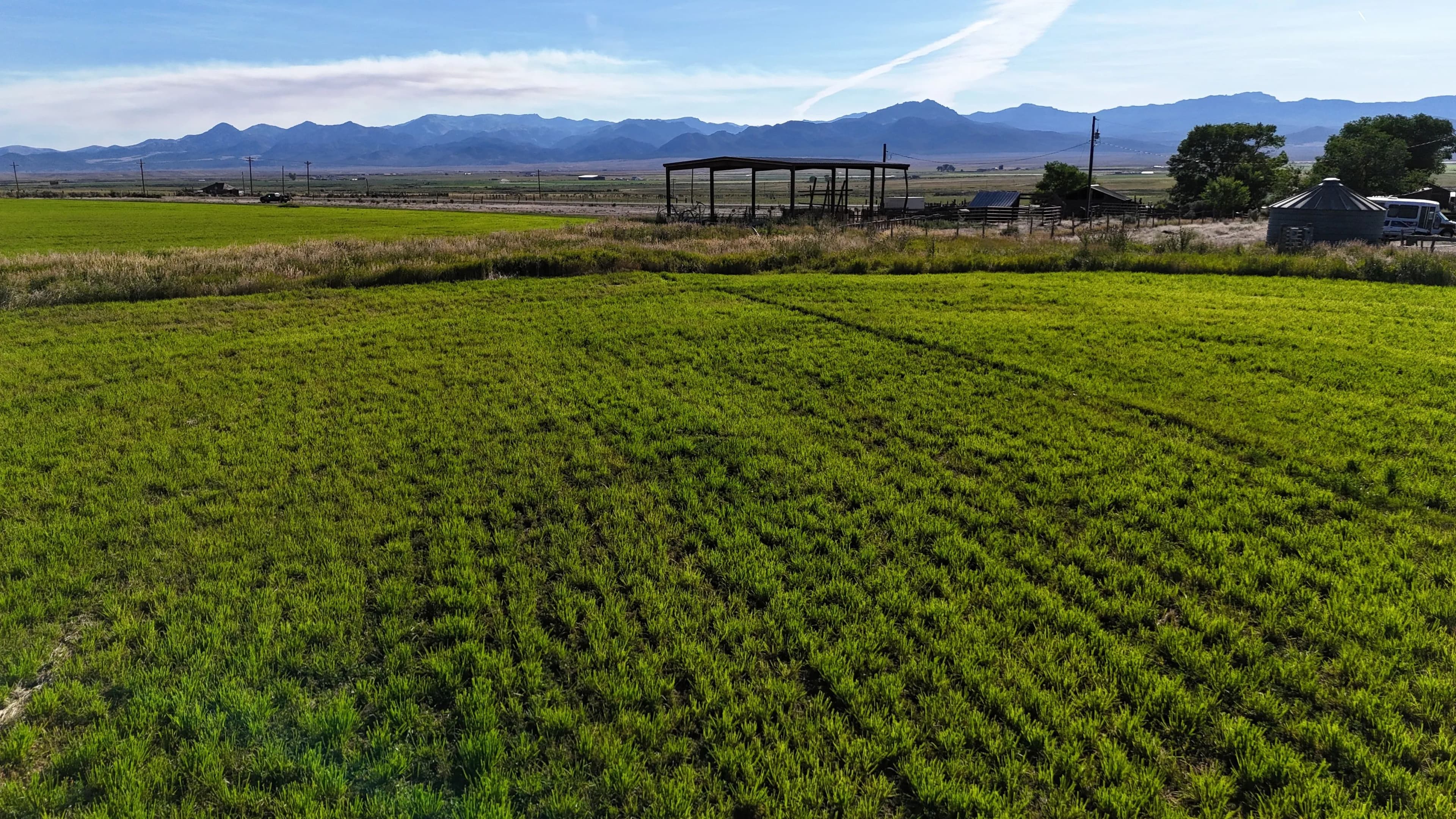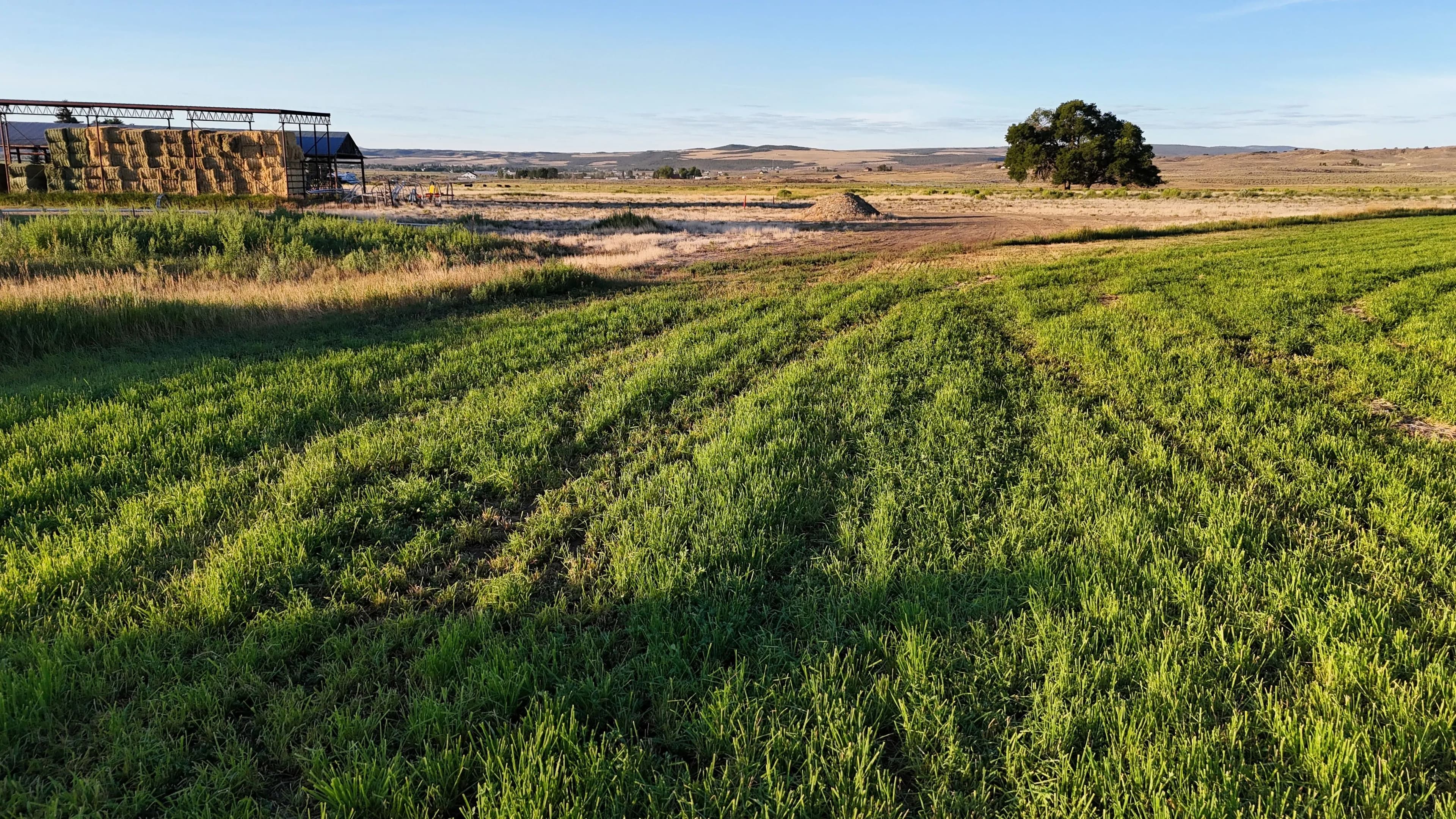 On-site improvements include two hay barns totaling 10,000 square feet of covered storage, perimeter fencing, stock corrals near the highway, and agricultural infrastructure already in place. Well depths in the area range from 80 to 150 feet, offering reliable water access.