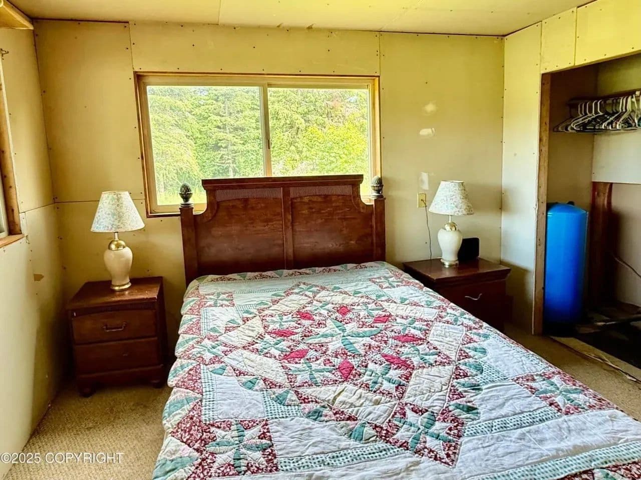 Partial ocean and Mountain View. Almost 8 acres of treed land and the convenience of highway access. Home is one level with oil stove and woodstove. Open concept one level, prefect for a small family or retired couple. Also a 448 sf. Cabin with heat, power and outhouse. Woodshed and big smokehouse as well. Deck does need some TLC. Septic is crib. Sale is as-is. Seller will finance with large down.
