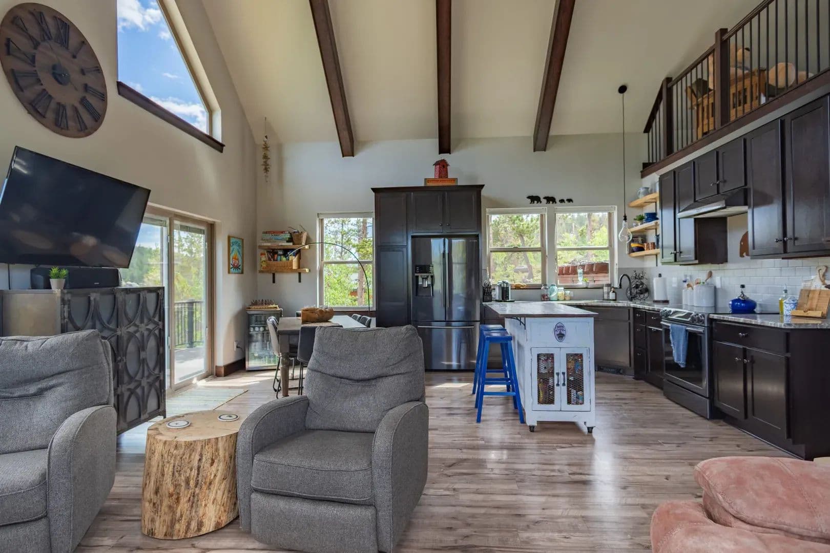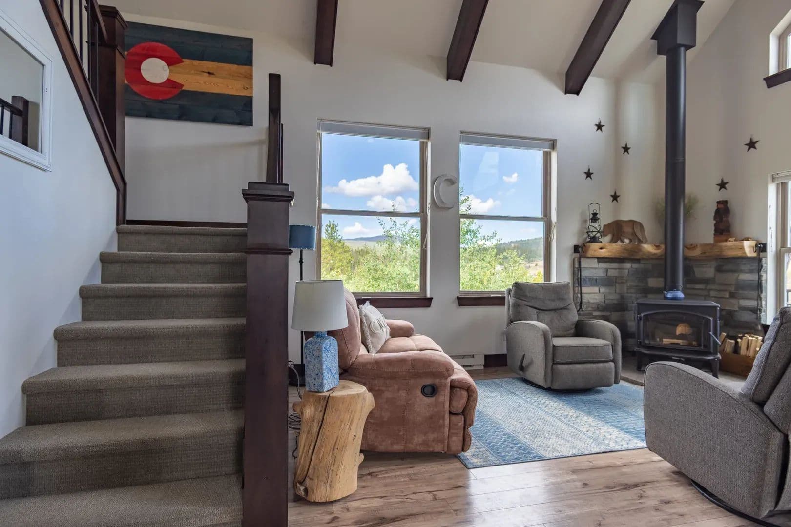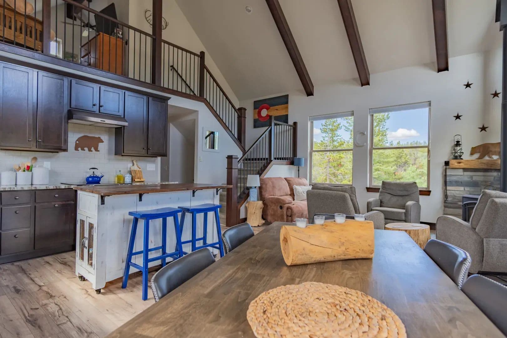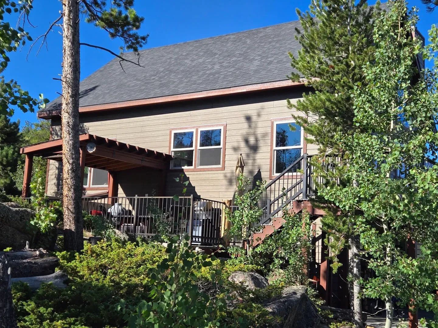 Just over an hour NW of Fort Collins and in the sought after mountain enclave that is Crystal Lakes, this beautiful riverfront mountain home on just under 1.5 acres just might surprise you. With over 2100 sqft of space on 3 levels, this well thought out home brings nature indoors. Positioned perfectly on the property, and with large windows to bring in the views, there is room for family and guests to enjoy the Colorado mountains year round. Land This 1.48 acre parcel is sloped toward the North Fork of the Poudre River, with frontage on both sides, and the home is positioned perfectly to take advantage of the topography and the views. Surrounded by towering pines, mountain views and the sound of the river, you’re transported into a place that gives you respite from the everyday. With satellite available everywhere now, you can still check in with the real world anytime you like, but you probably won’t choose to. The Crystal Lakes community is tight knit, well organized and active if you want to participate. National Forest surrounds you and there is access in a multitude of places for you to enjoy all that has to offer. Even though you’ll feel miles away from civilization, you’re only about 15 minutes from Red Feather where a grocery/hardware store has many essentials. There are even a couple of restaurants and a post office as well.