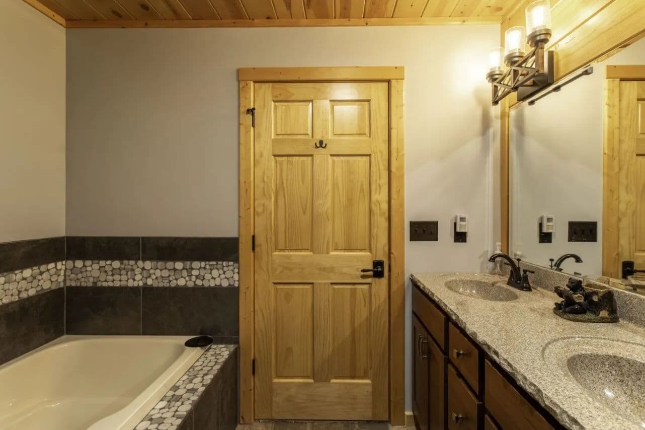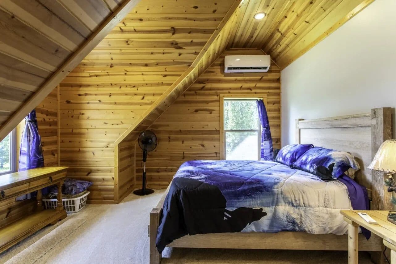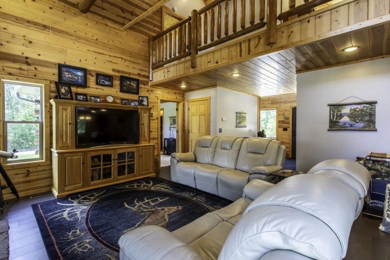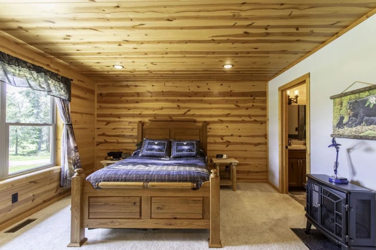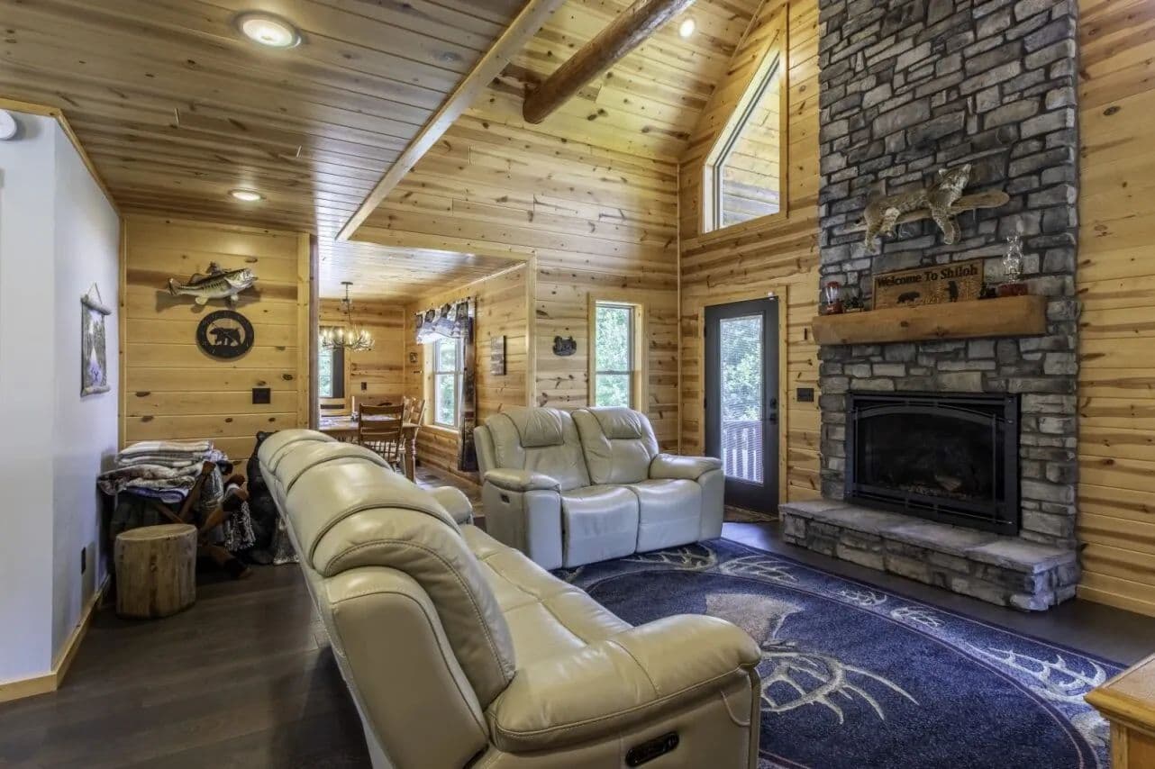 Inside, enjoy the warmth of white pine tongue-and-groove walls, a vaulted ceiling, and a dramatic stone fireplace in the living room. The open-concept kitchen is fully equipped with all appliances, quartz countertops, a center island, and a walk-in pantry — perfect for home cooks or entertaining guests.