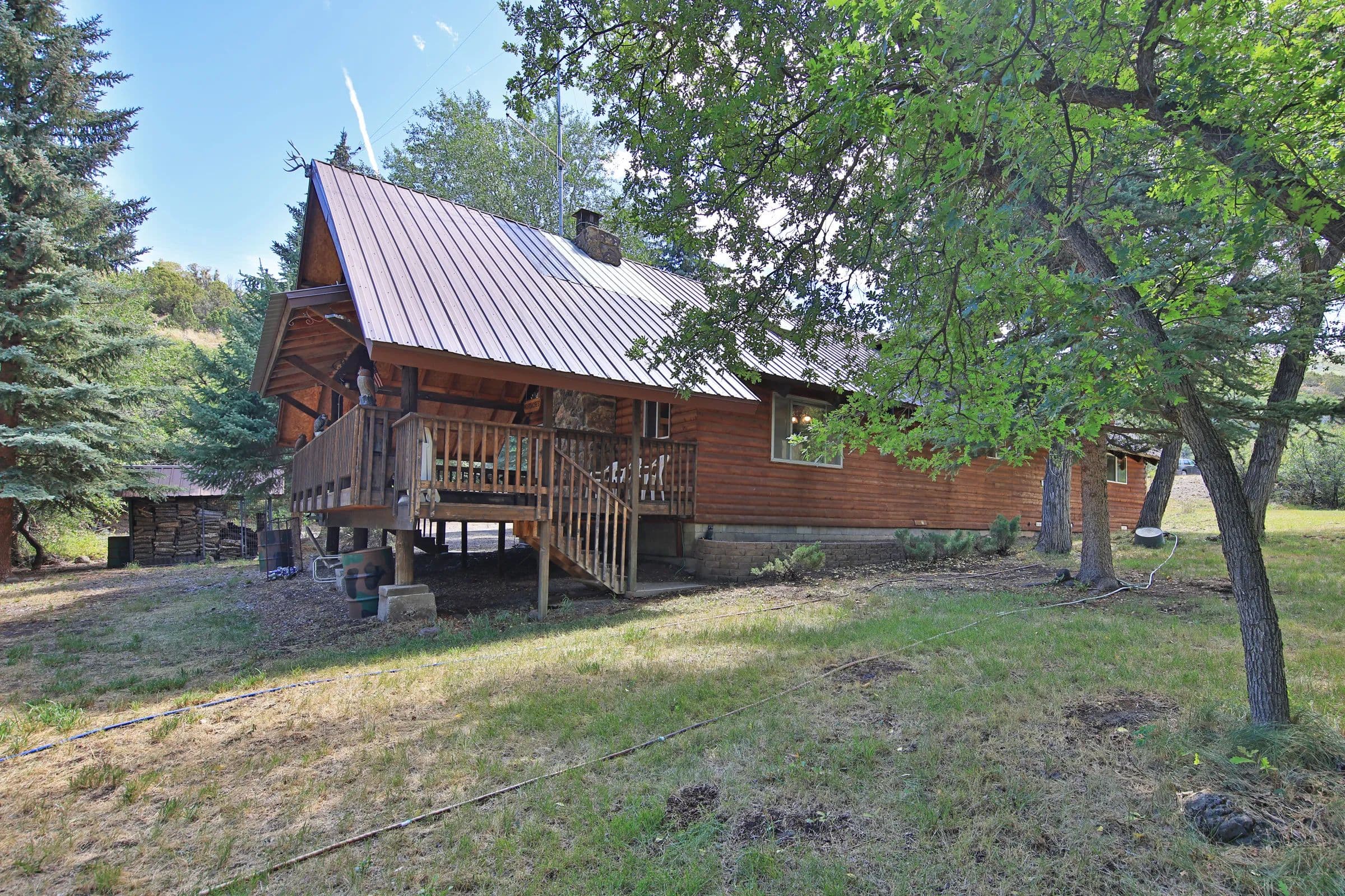 Drive scenic country roads to this Colorado mountain log home nestled in a private valley, surrounded by mature pine and shade trees. This 36.33-acre parcel is fully fenced, with year-round Cottonwood Creek running through it. The 1½-story, 4-bedroom, 2-bath log cabin sits along the peaceful rock lined creek and features a large, covered deck. Inside, you’ll find an open concept kitchen, dining, and living area under high vaulted wood ceilings. A wood stove insert in the stone fireplace provides warmth for chilly mountain days and nights, with a propane gas stove offering additional heat throughout the home. A secondary entrance opens to a foyer with a full walk-through bath that connects to the spacious primary bedroom. The conveniently located laundry room features a stackable washer/dryer, utility sink, counter space, cupboards, and extra storage. Down the hall, you’ll find a closet for additional storage, a second full bathroom, and two bedrooms. Wood stairs lead upstairs to a spacious loft with two rooms. One offers a sitting or sleeping area with a private balcony and an efficient kitchen with cabinets, mini fridge, and microwave. The second room overlooks the main level and can be used for guests or additional living space. Outside, there is a 16x13 metal shed with a concrete floor for storage. Enjoy abundant wildlife and year-round outdoor activities from this Colorado country log home, conveniently located about 30 minutes from Mesa and Collbran, and roughly an hour from I-70.
