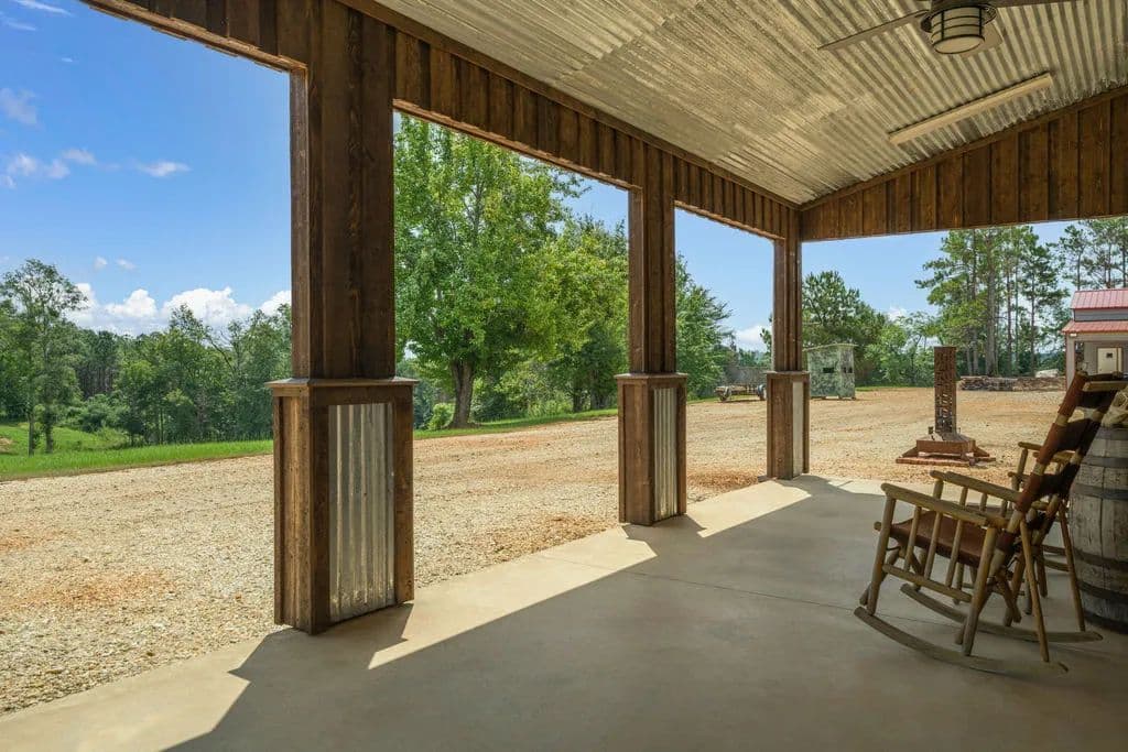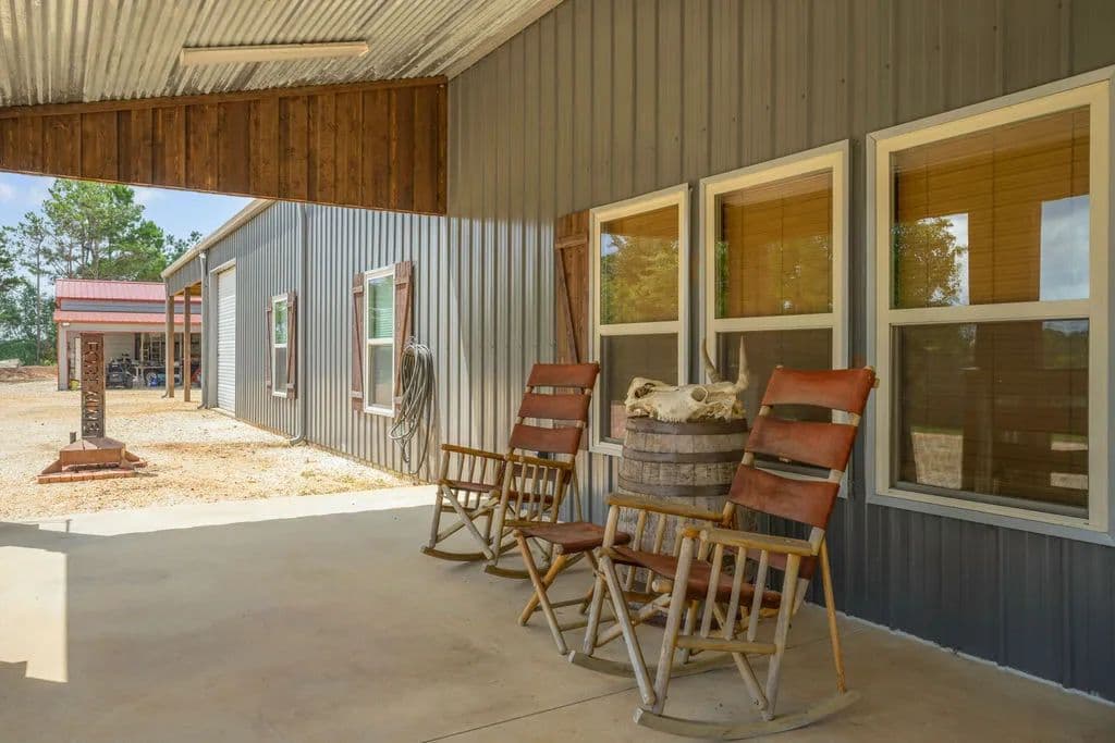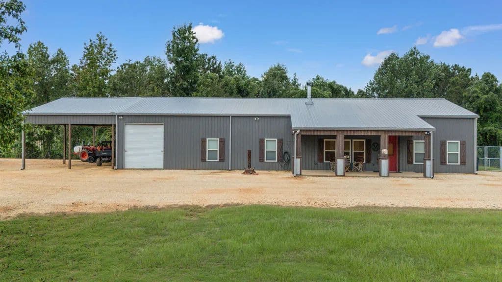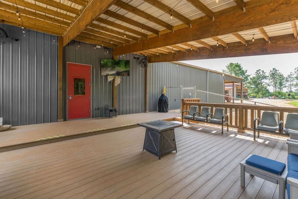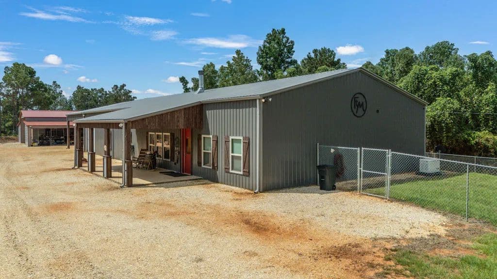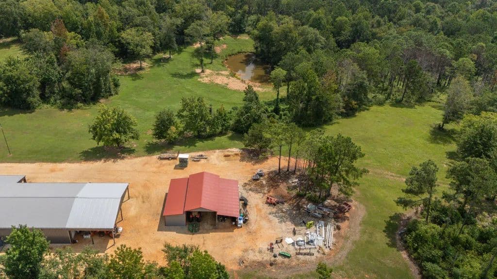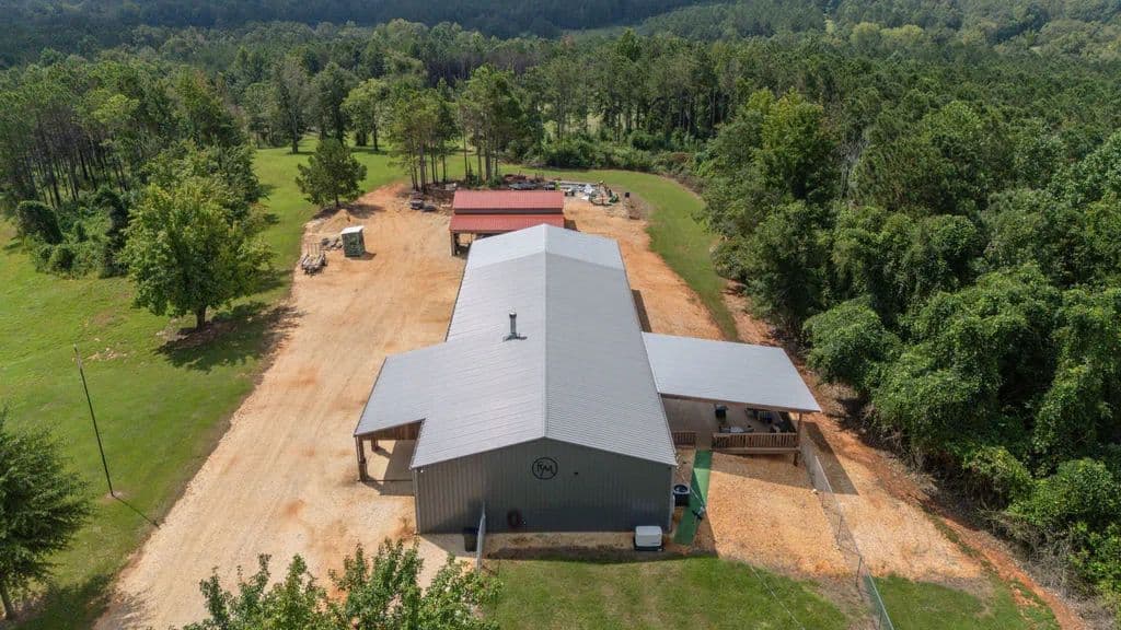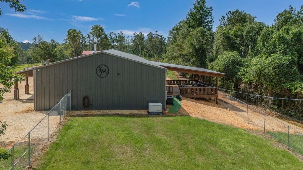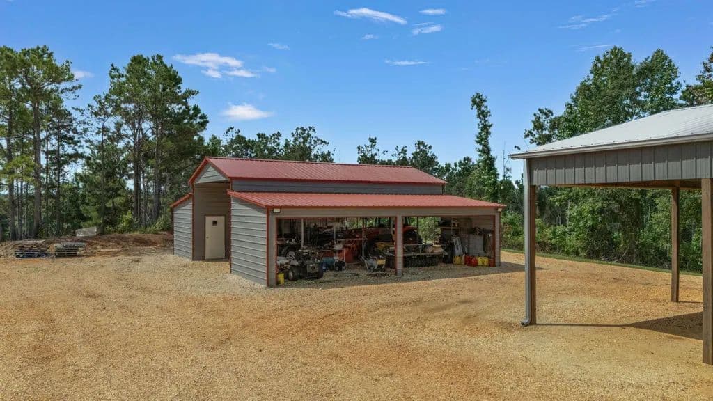 A fully furnished 3,600 sq. ft. 4 Bedroom 2.5 Bathroom Barndominium serves as a comfortable hunting lodge with an open floor plan, large 26′ x 28′ back porch, and Generac generator for backup power. Multiple sheds provide ample storage for equipment and vehicles, including a 30′ x 40′ attached shed and a 35′ x 42′ equipment shed.
