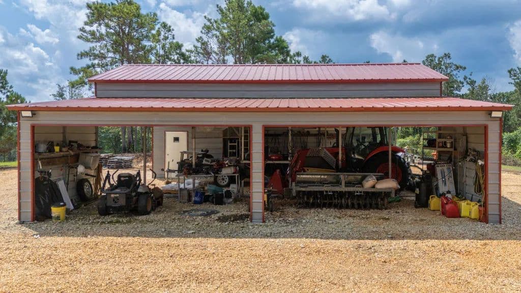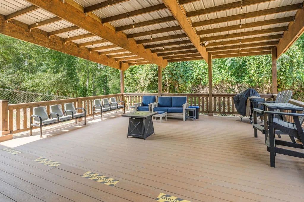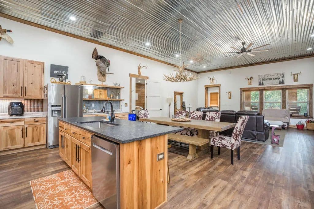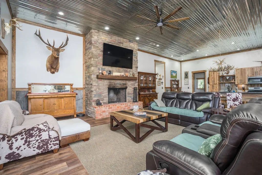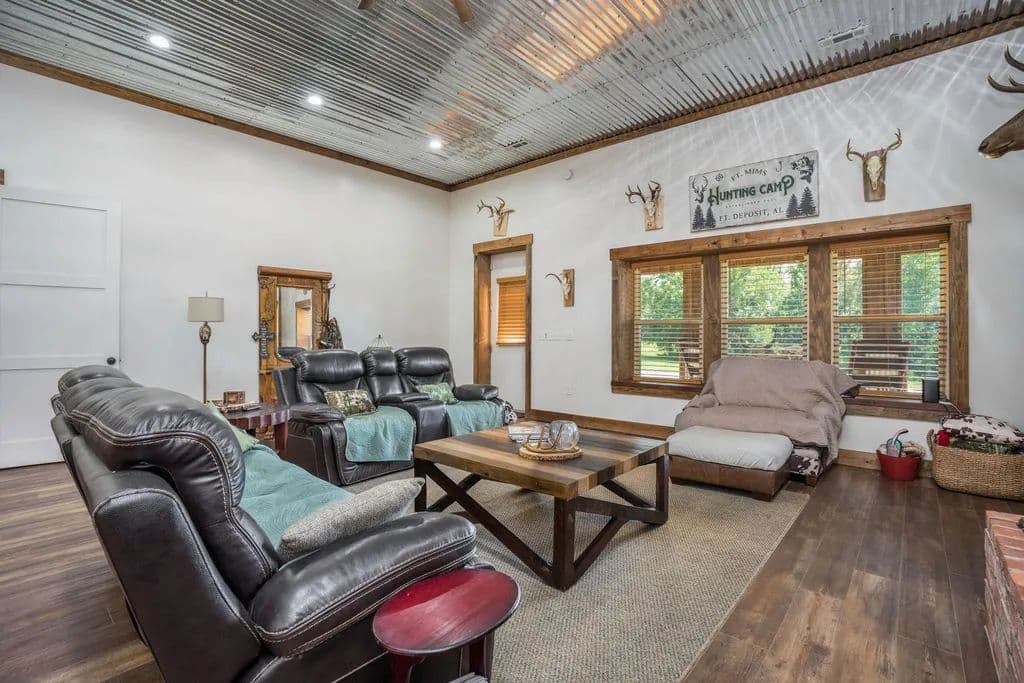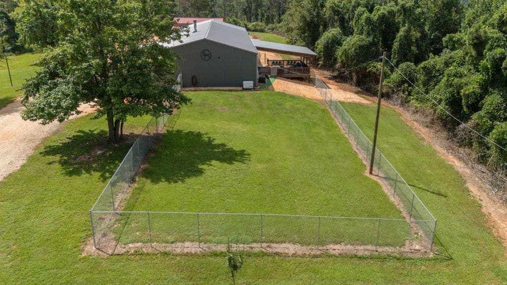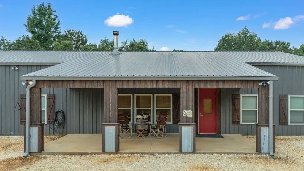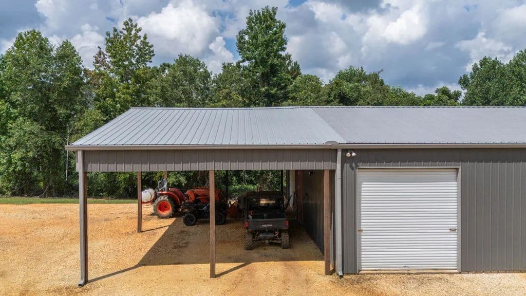 A fully furnished 3,600 sq. ft. 4 Bedroom 2.5 Bathroom Barndominium serves as a comfortable hunting lodge with an open floor plan, large 26′ x 28′ back porch, and Generac generator for backup power. Multiple sheds provide ample storage for equipment and vehicles, including a 30′ x 40′ attached shed and a 35′ x 42′ equipment shed.