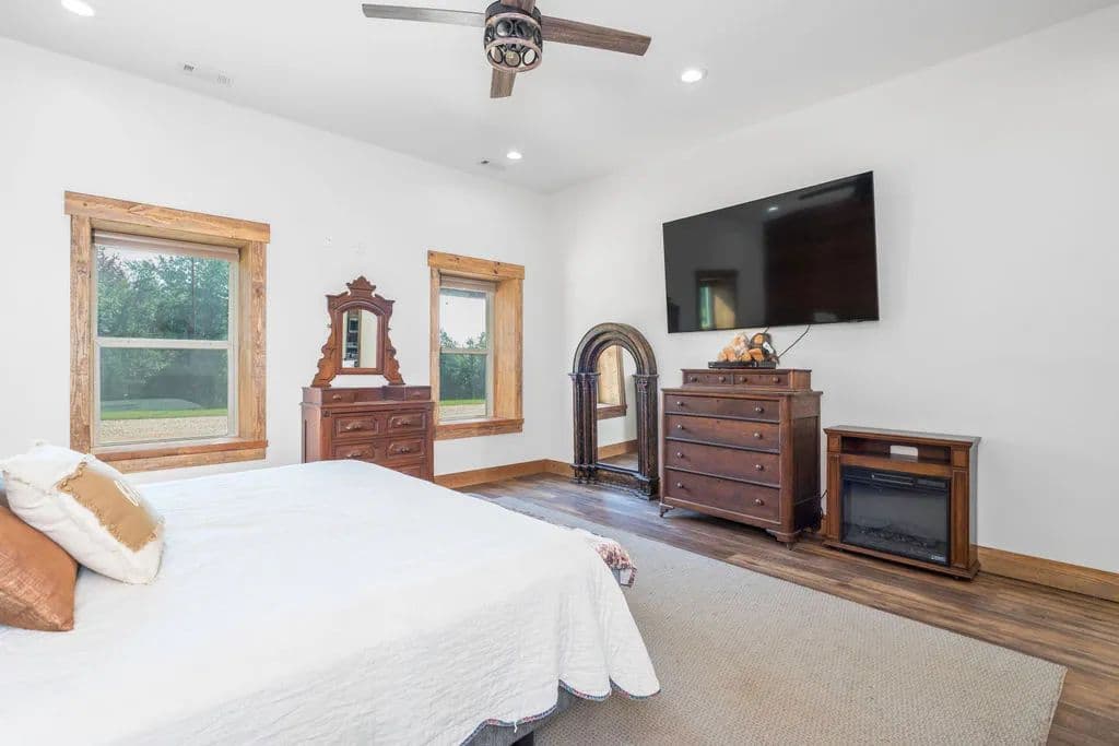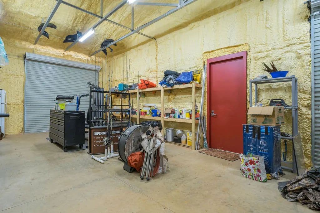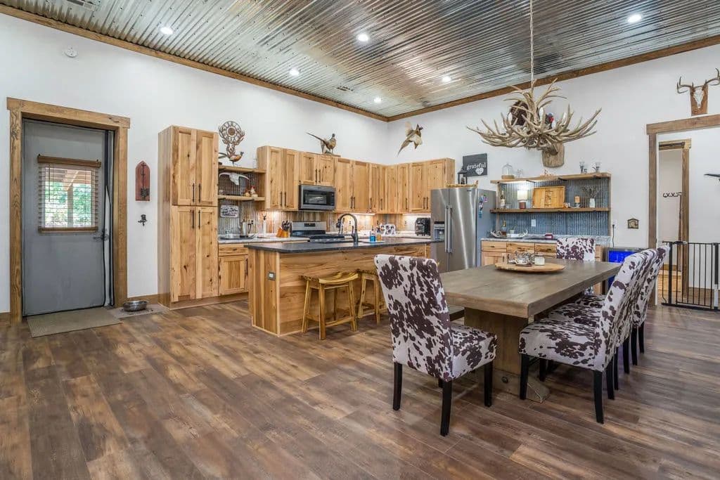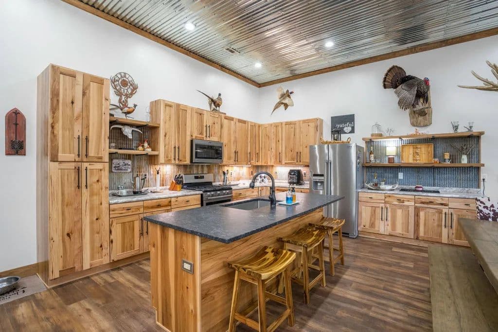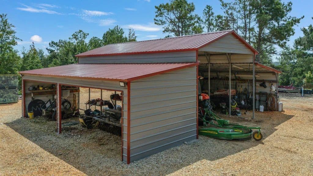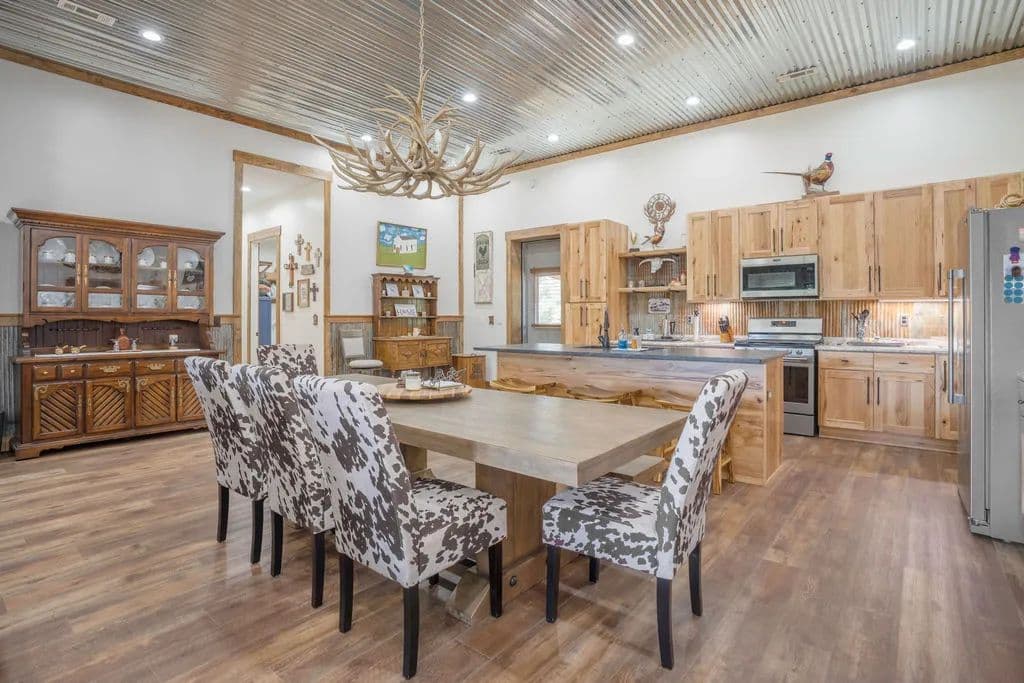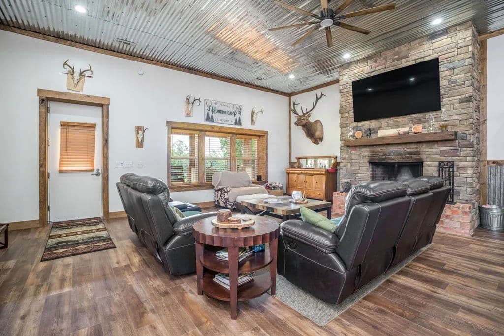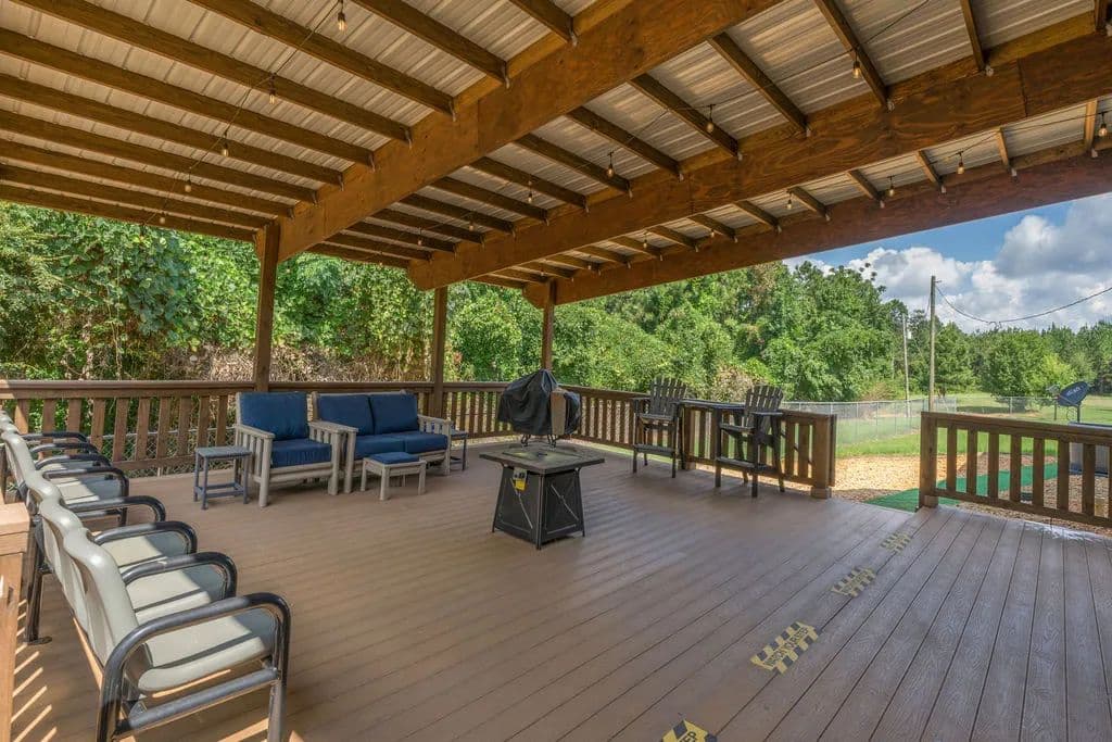 A fully furnished 3,600 sq. ft. 4 Bedroom 2.5 Bathroom Barndominium serves as a comfortable hunting lodge with an open floor plan, large 26′ x 28′ back porch, and Generac generator for backup power. Multiple sheds provide ample storage for equipment and vehicles, including a 30′ x 40′ attached shed and a 35′ x 42′ equipment shed.