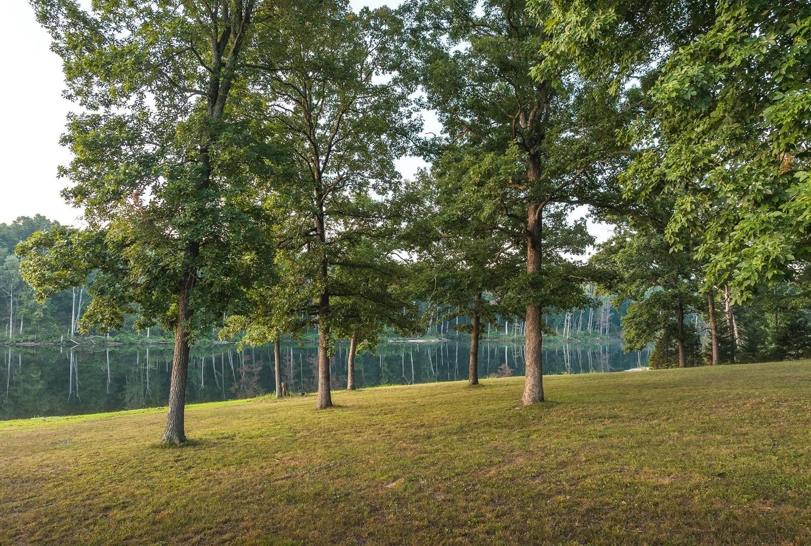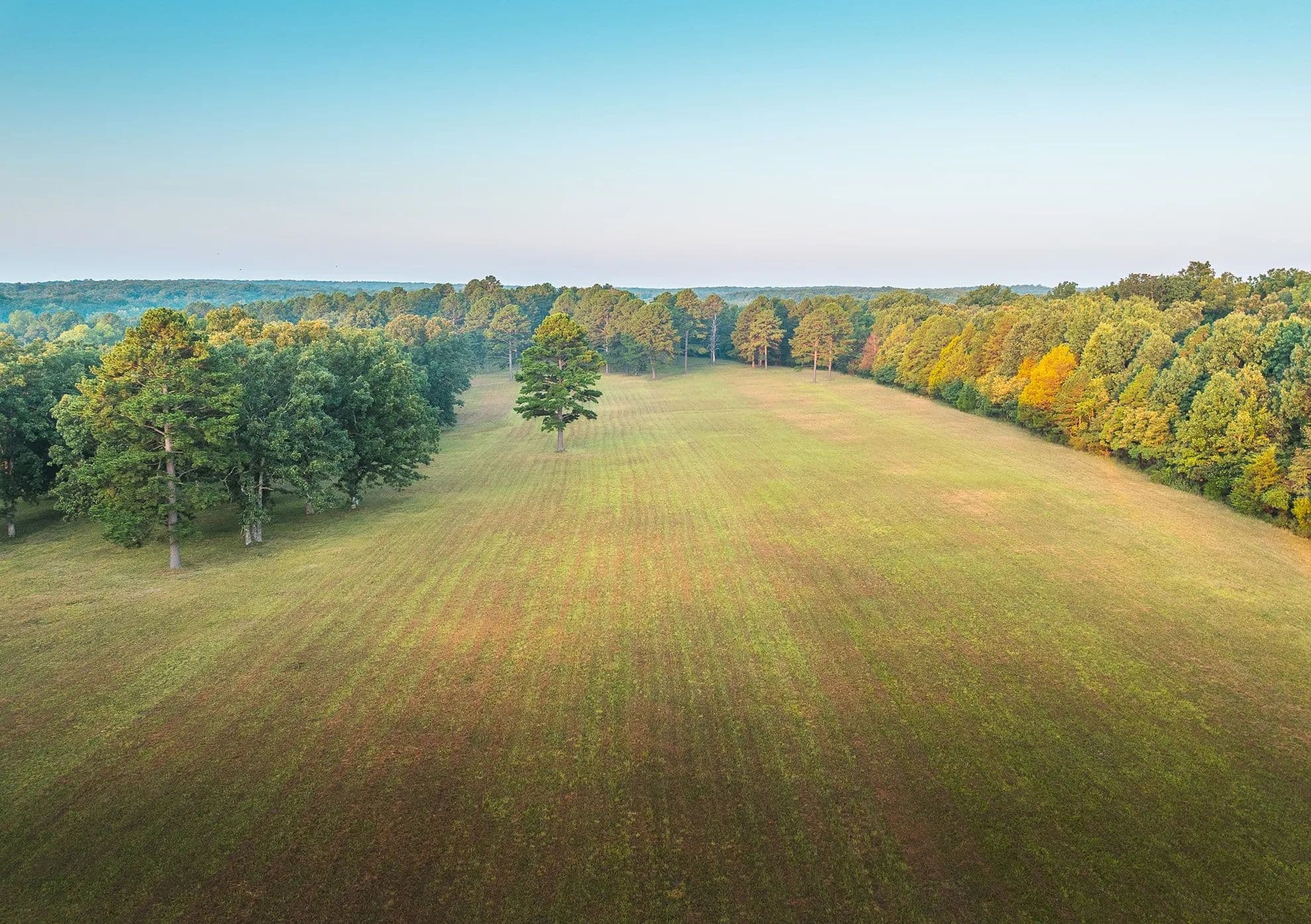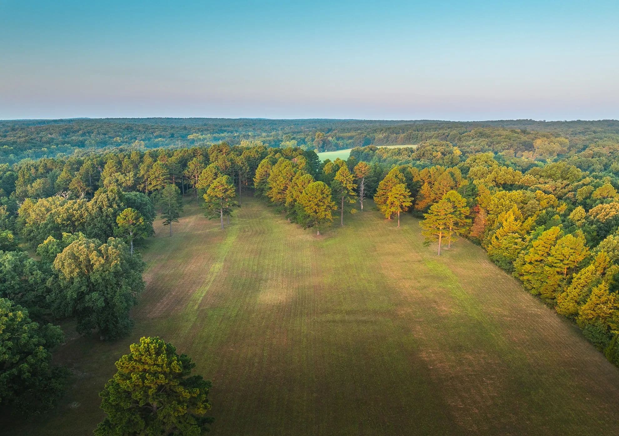 Coming in a close second to the lake is the expansive 160+/- acres of land. A gravel drive leads to the pavilion, with neatly cut grass guiding the way. The property offers a diverse landscape, ranging from flat hilltop fields overlooking the lake to wooded trails accessible via a short side-by-side ride. Nestled at the end of a cut field are majestic pine trees, offering another serene spot to unwind. Scattered throughout the property are mature hardwoods, adding to its natural beauty.