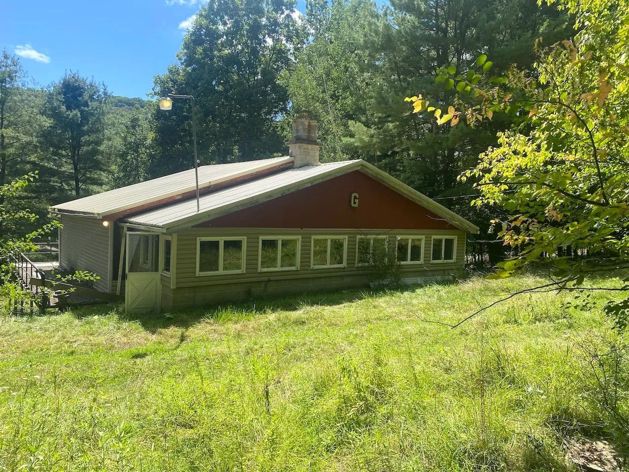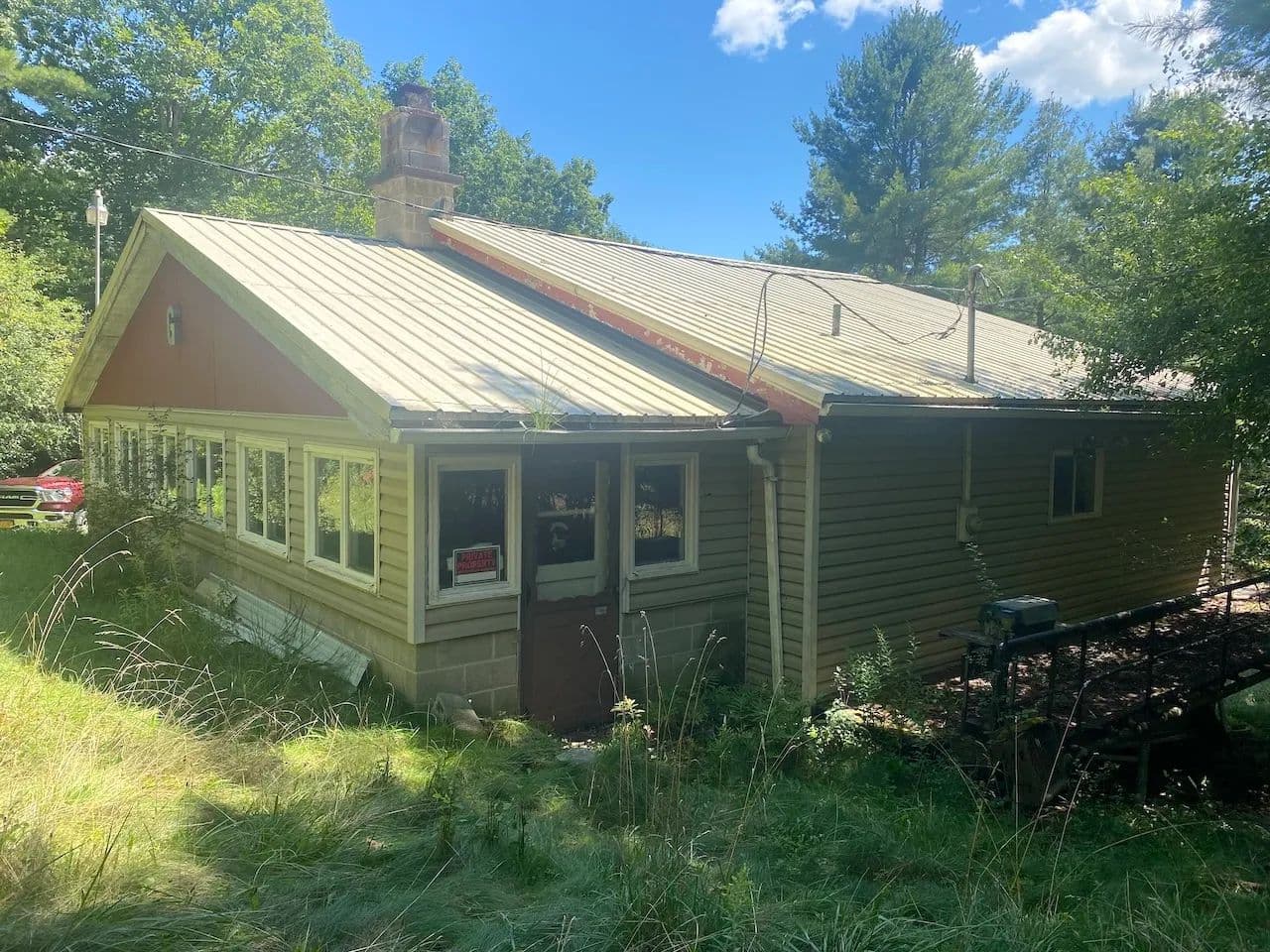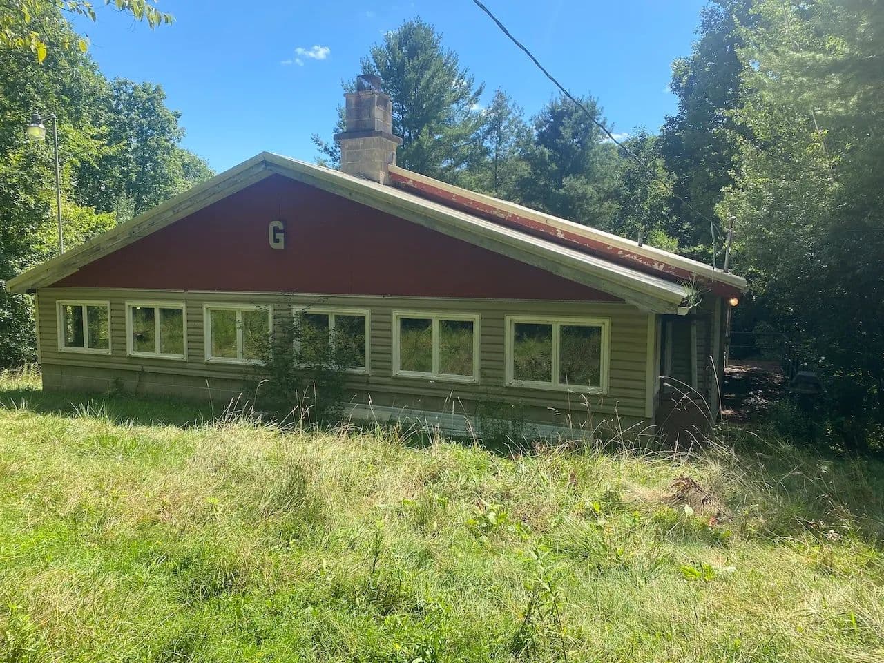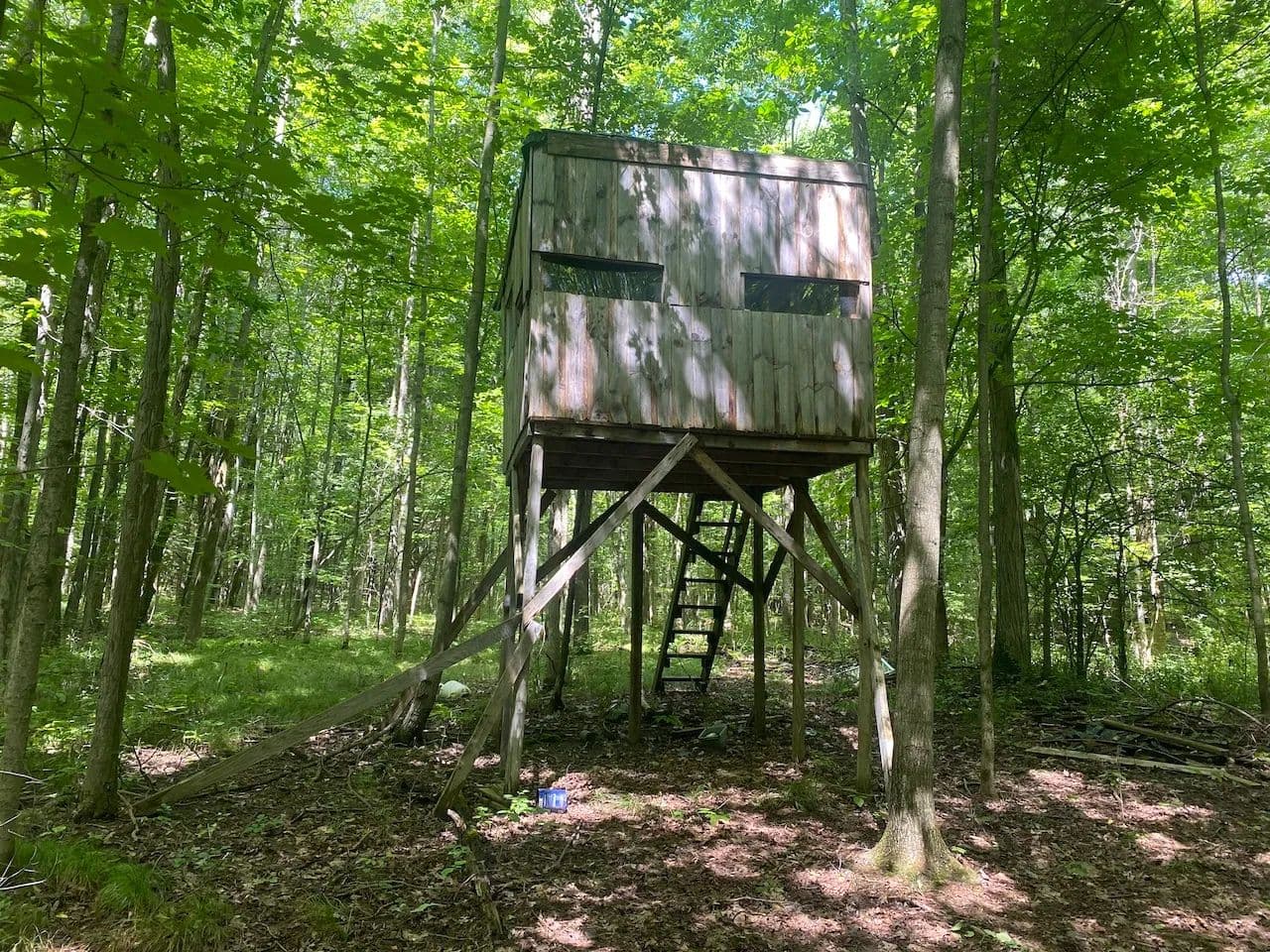 Outdoors, a wrap-around porch offers the perfect place to relax and enjoy the views. A separate party shack adds extra space for gatherings though it will need some work to shine again. The land itself is a true highlight, nearly 48 acres of mixed hardwoods and softwoods, including mature oak trees, with ample whitetail deer sign making it an excellent hunting property. There is even an enclosed tree blind already in place. Also, there is a spring-fed pond. Beyond hunting, the property has potential for hiking, exploring, and simply enjoying the great outdoors. Surface rights convey.