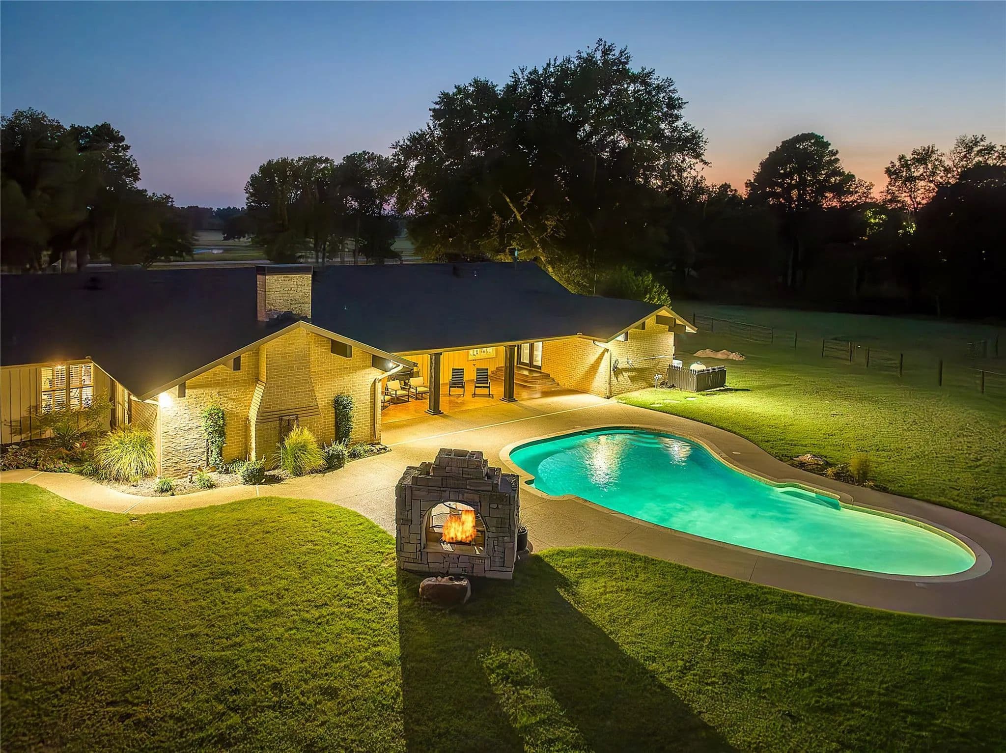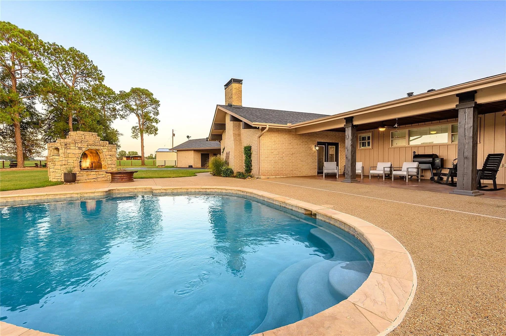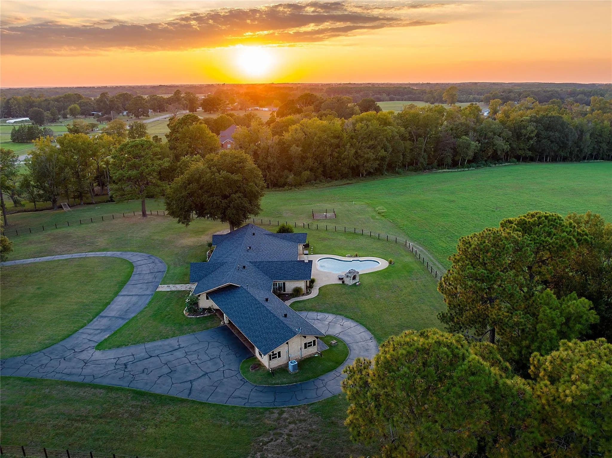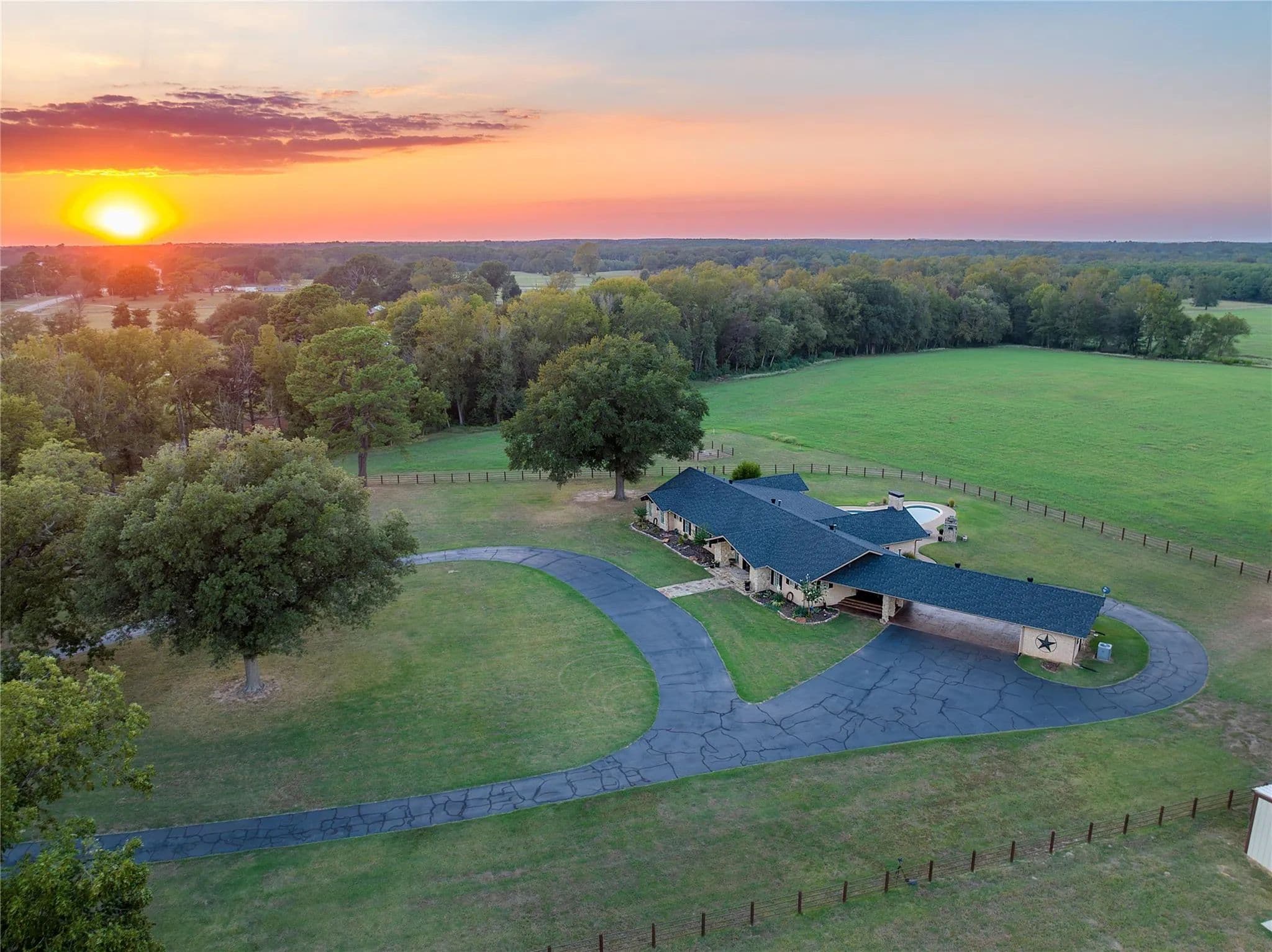 Escape to your own piece of paradise in the heart of East Texas with this luxurious ranch retreat in Pittsburg. Situated on a sprawling 20-acre canvas just two hours east of DFW, this modern masterpiece boasts 4,272 sq ft of comfortable living space. Step into the spacious kitchen that features granite countertops and custom stonework. With 4 bedrooms and 3 full bathrooms, there's ample space for family and guests to unwind. The home office provides more than enough space for two or more professionals working from home. Step down into the living area and enjoy vaulted ceilings, custom mantle, and fireplace. This retreat includes two water wells, ensuring a reliable and sustainable water source. A newly built 40x60 shop provides space for equipment & storage. The custom gated entry sets the tone for the exclusivity and privacy that this property affords. The property is fenced with Priefert Continuous Fence adding a timeless design.