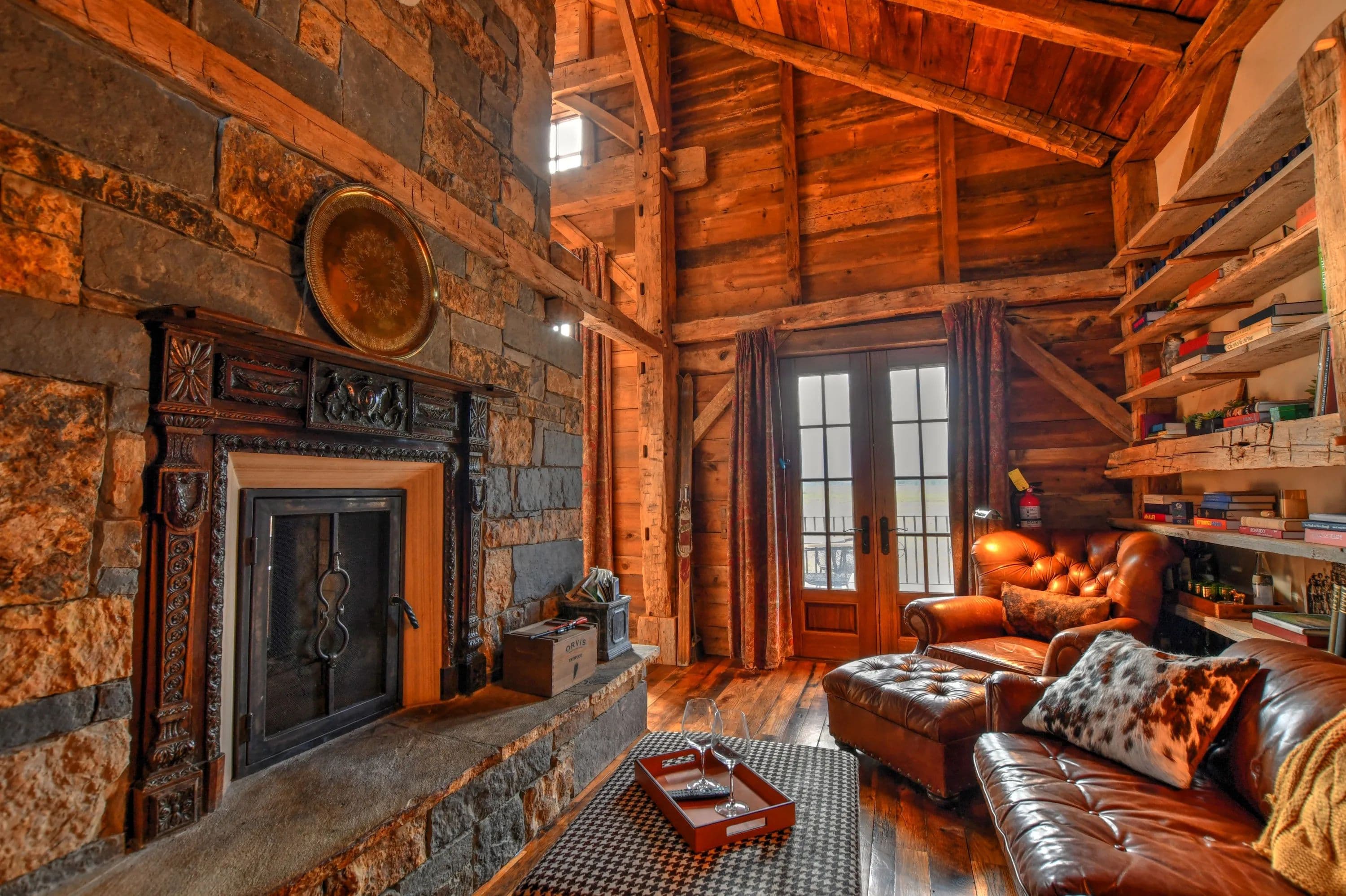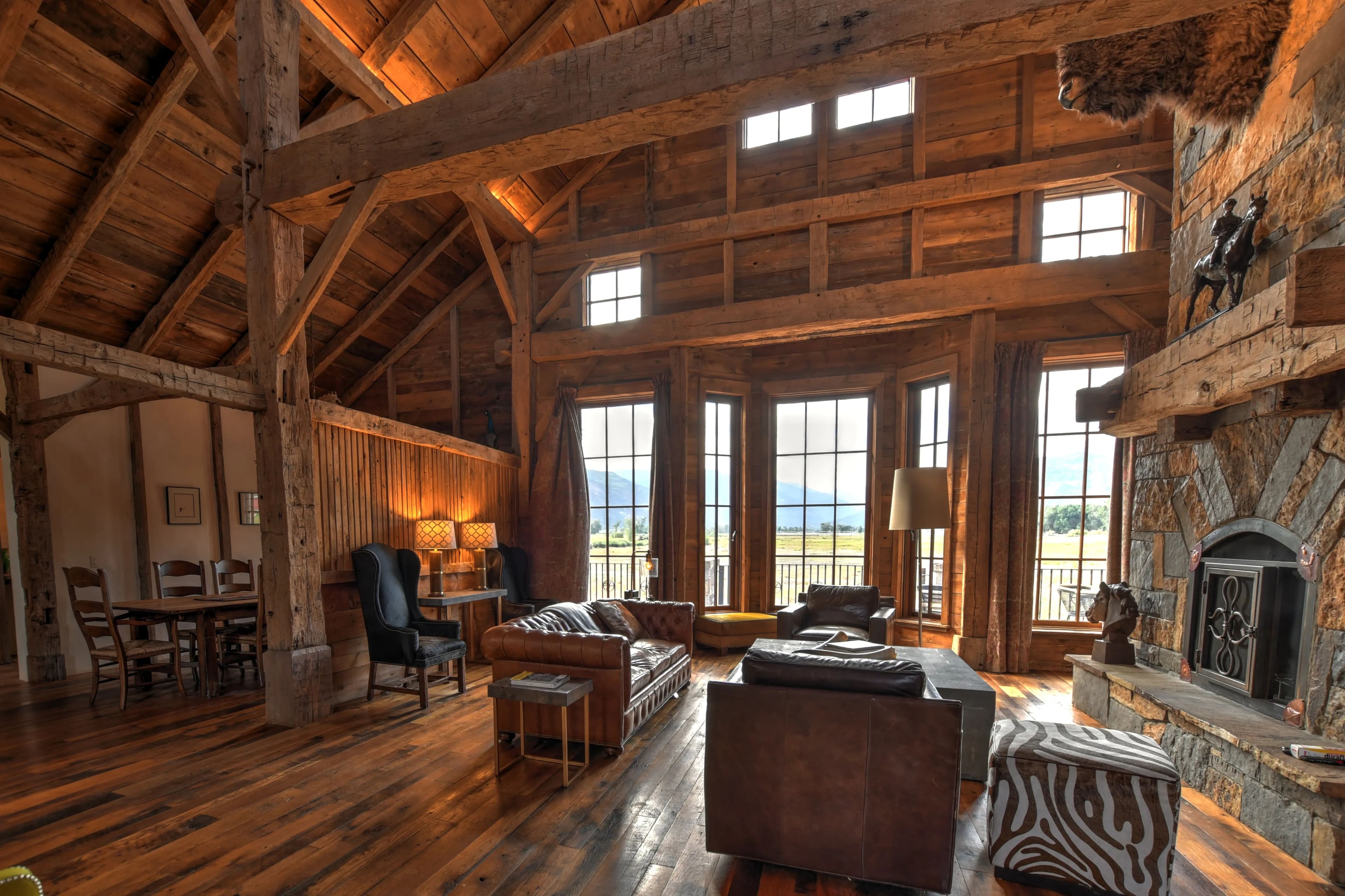 Rustic interior with reclaimed barn wood, vaulted ceilings, stone fireplaces, and luxury finishes throughout