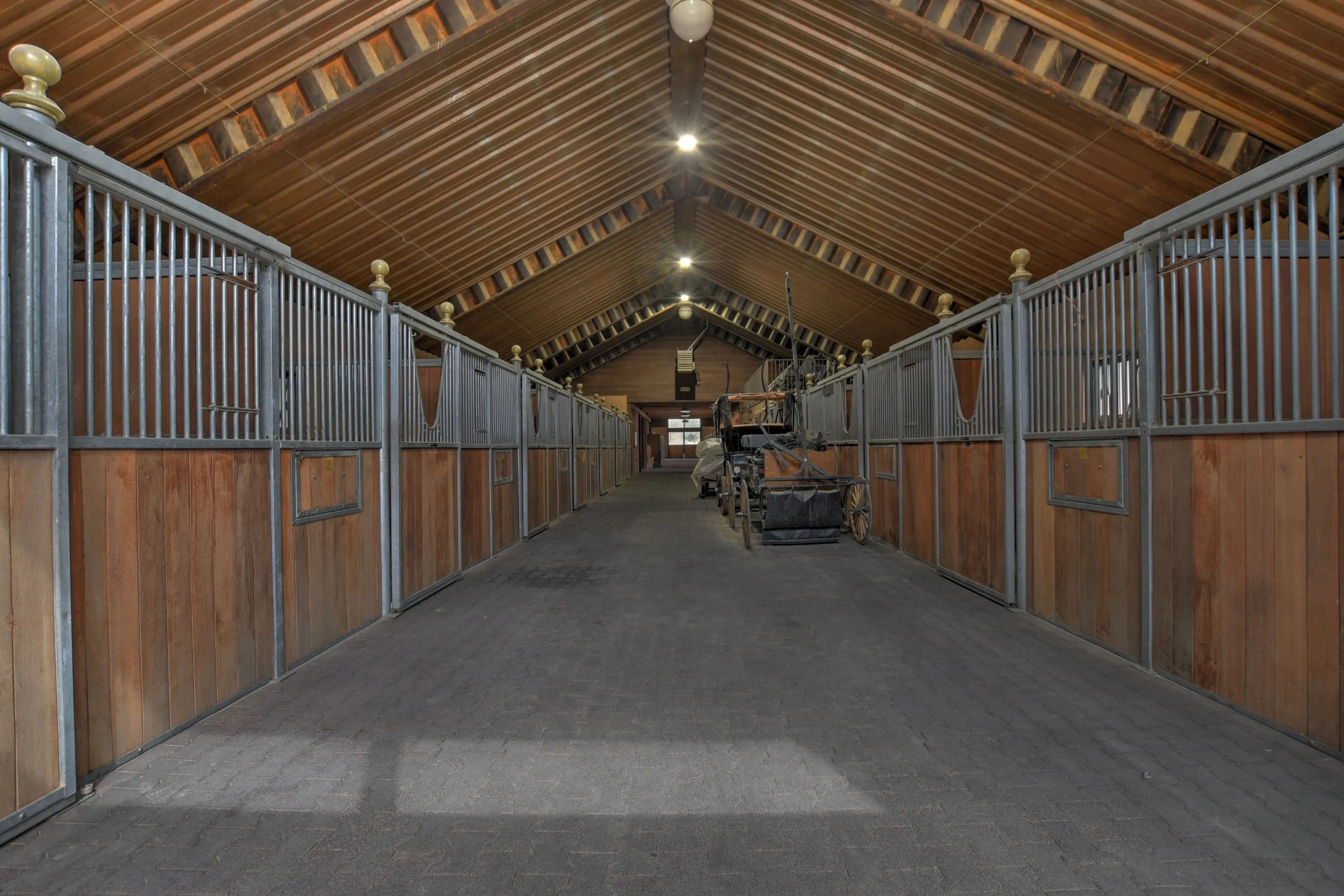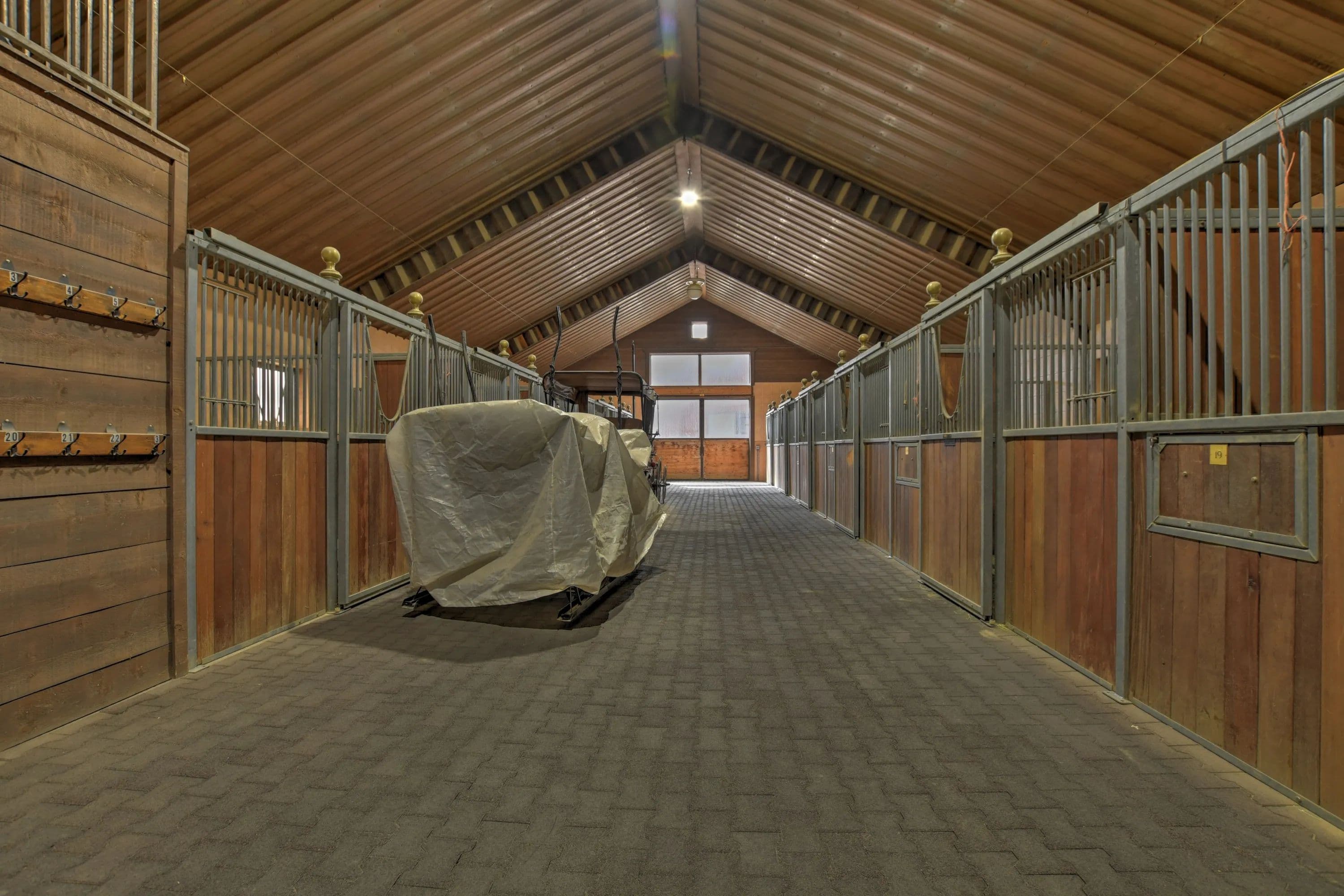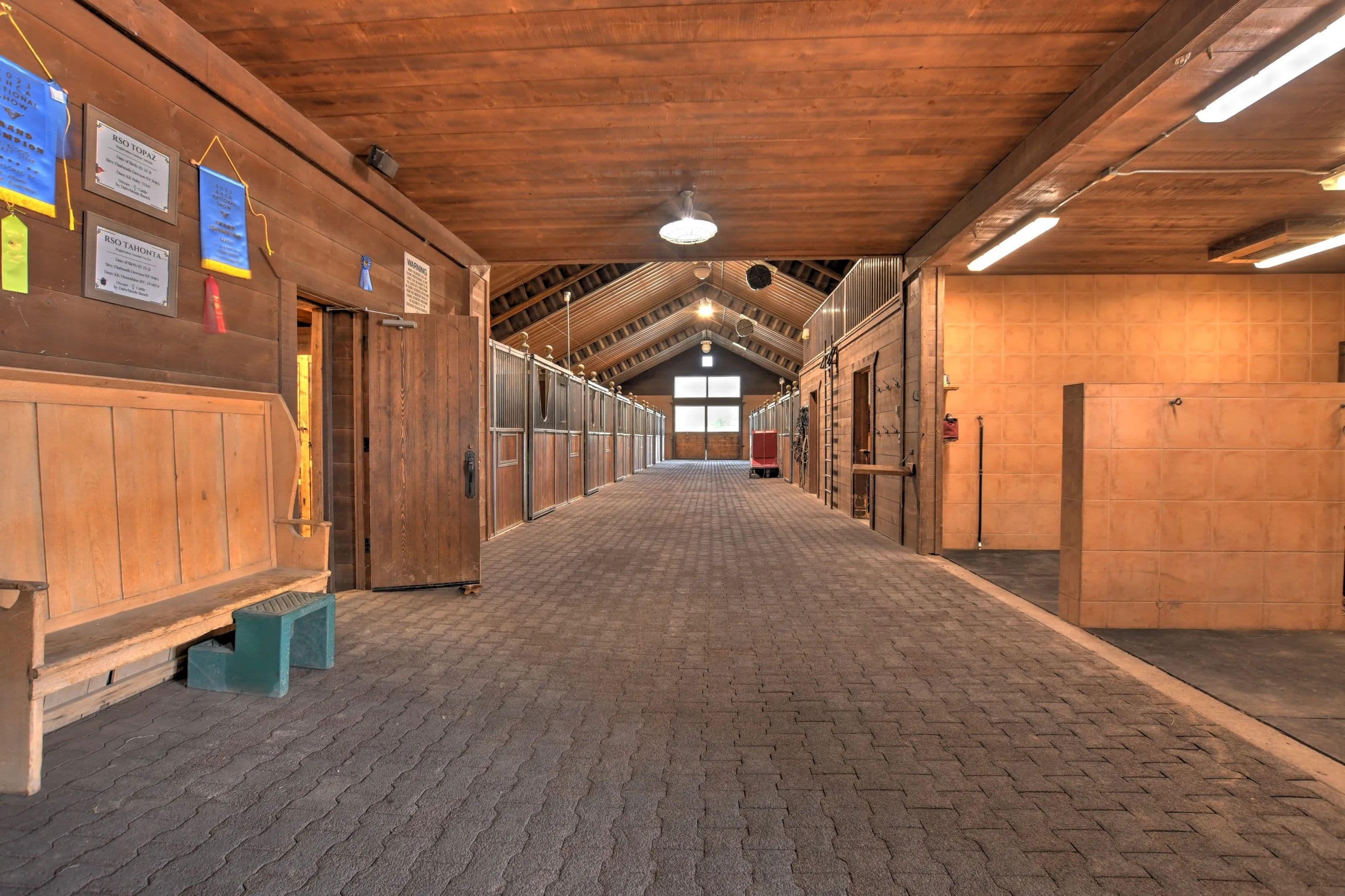 25,000 sq ft stables with 24 horse stalls, 4 hot-water wash bays, tack room, and saloon-style lounge.