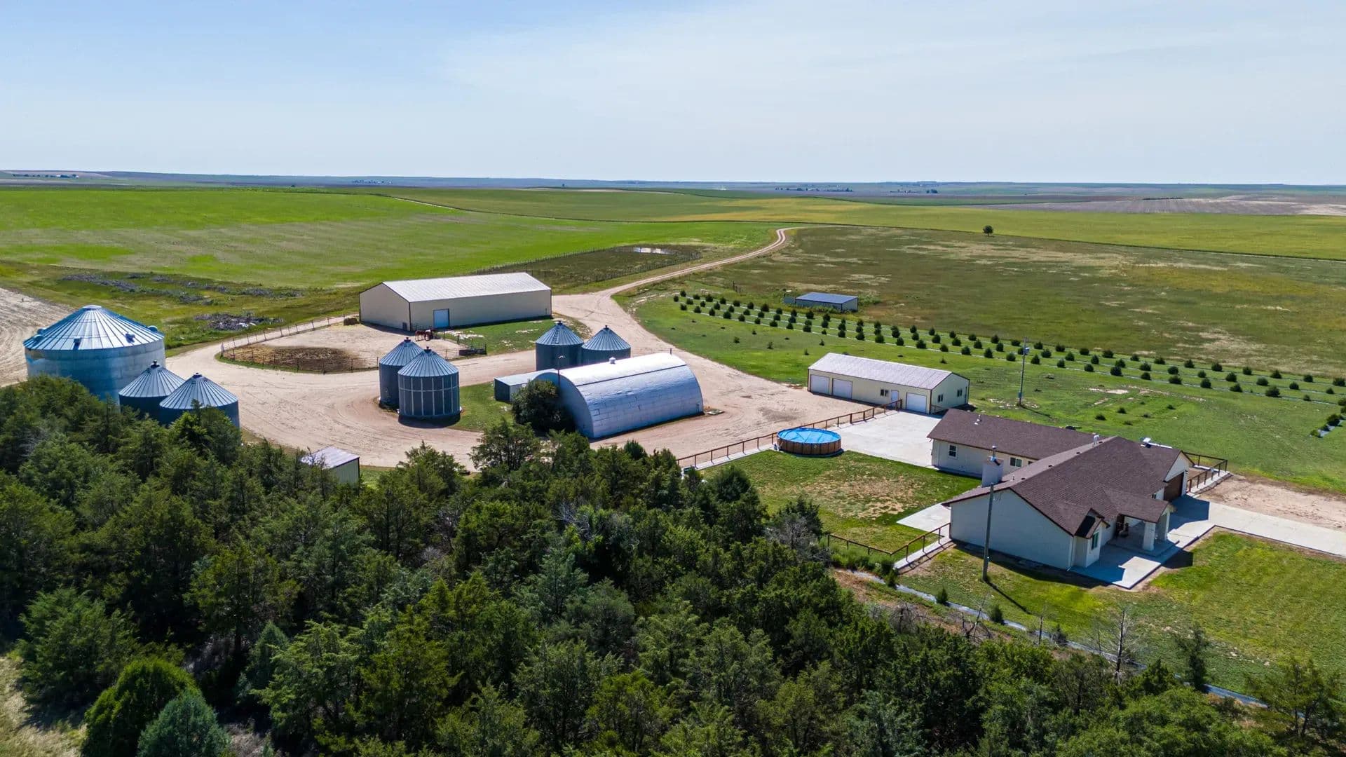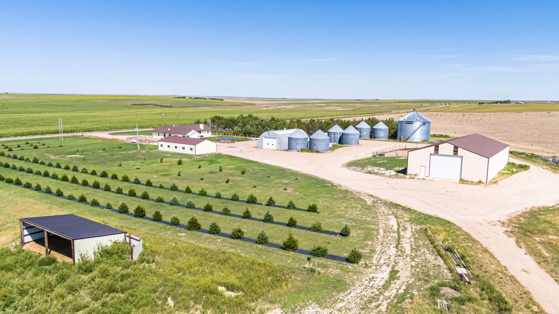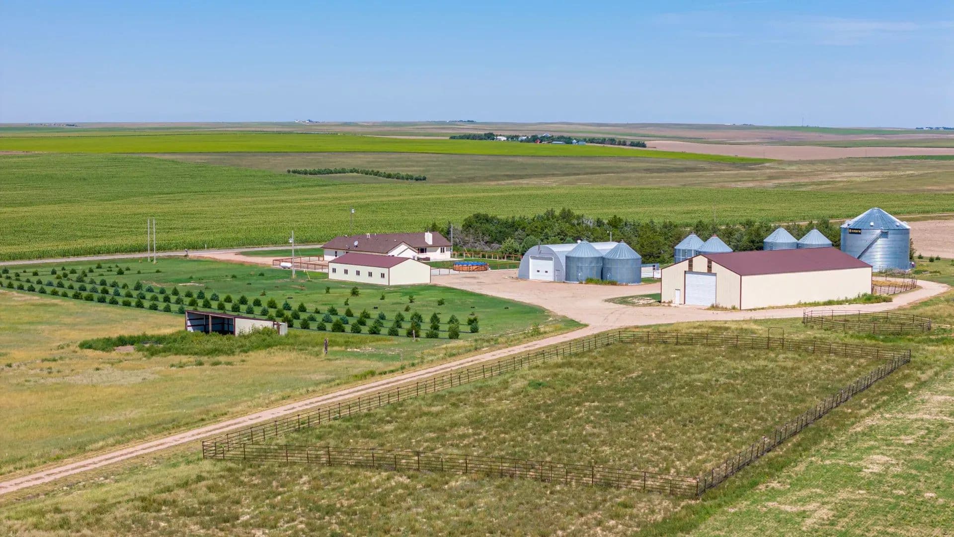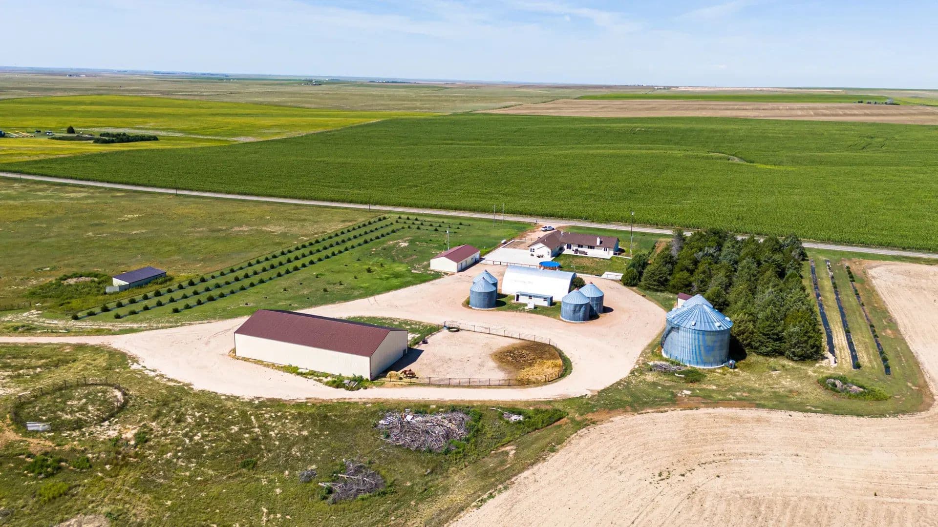 The Jones Farm offers 160± acres with a 4,620 sq ft custom home, guest house, multiple outbuildings, and 7 grain bins. Located 17 mi N of Otis and 20 mi SE of Sterling, CO, this turnkey farm features top-tier improvements, open farmland, and a private, treed homesite. Ideal for farming, livestock, or a rural family headquarters in Colorado’s productive Eastern Plains. Land Covering 160± acres, The Jones Farm offers a balance of production, privacy, and rural lifestyle in a scenic country setting. The homesite is thoughtfully positioned amid mature tree rows on the north and south, offering protection from prevailing winds and enhancing the sense of privacy and seclusion. The land itself is gently rolling and highly functional, suitable for continued farming, grazing, and rural living. A large, fenced concrete patio and yard area surround the main residence, creating an ideal space for recreation, entertaining, or pets. With plenty of room to grow and expand, the land serves as a well-rounded base for a wide range of agricultural pursuits.