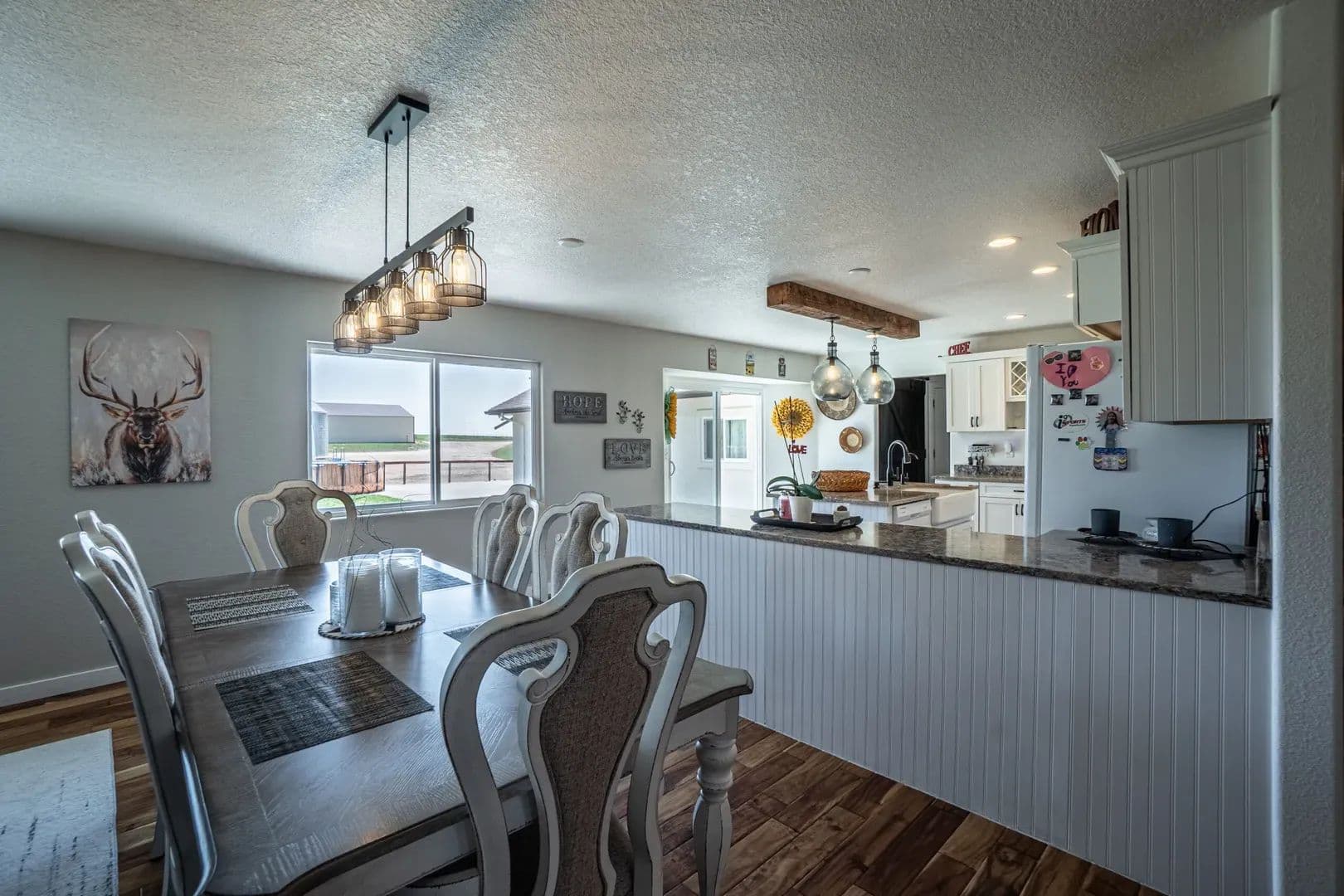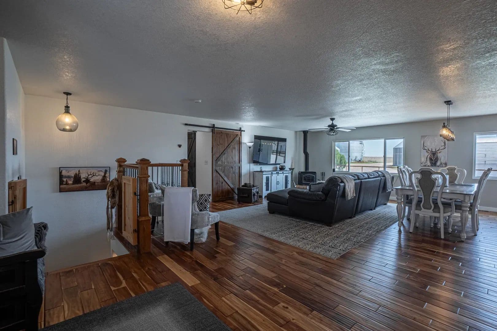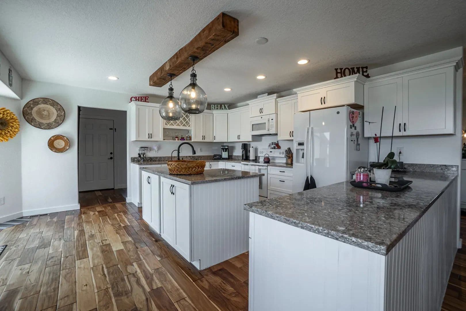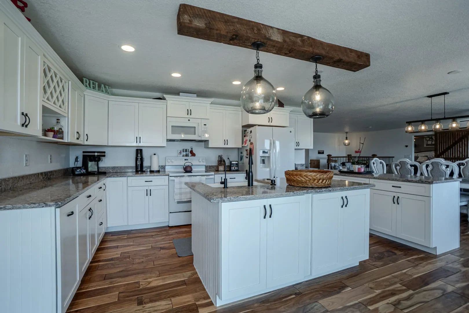 Improvements The primary residence is a well-designed, custom-built, ranch styled home constructed in 2015, offering 4,620 square feet of finished living space across two levels. The main floor has an open-concept layout with hardwood flooring throughout, highlighted by a spacious country kitchen complete with granite countertops, white cabinetry, and a large center island. This chef’s kitchen flows seamlessly into the dining and living areas, making it ideal for hosting family and friends. The master suite is located on the main level and features a luxurious five-piece bath, including a soaking tub, dual vanities, and an oversized walk-in tile shower. An additional bedroom and full bathroom are also found on the main floor.