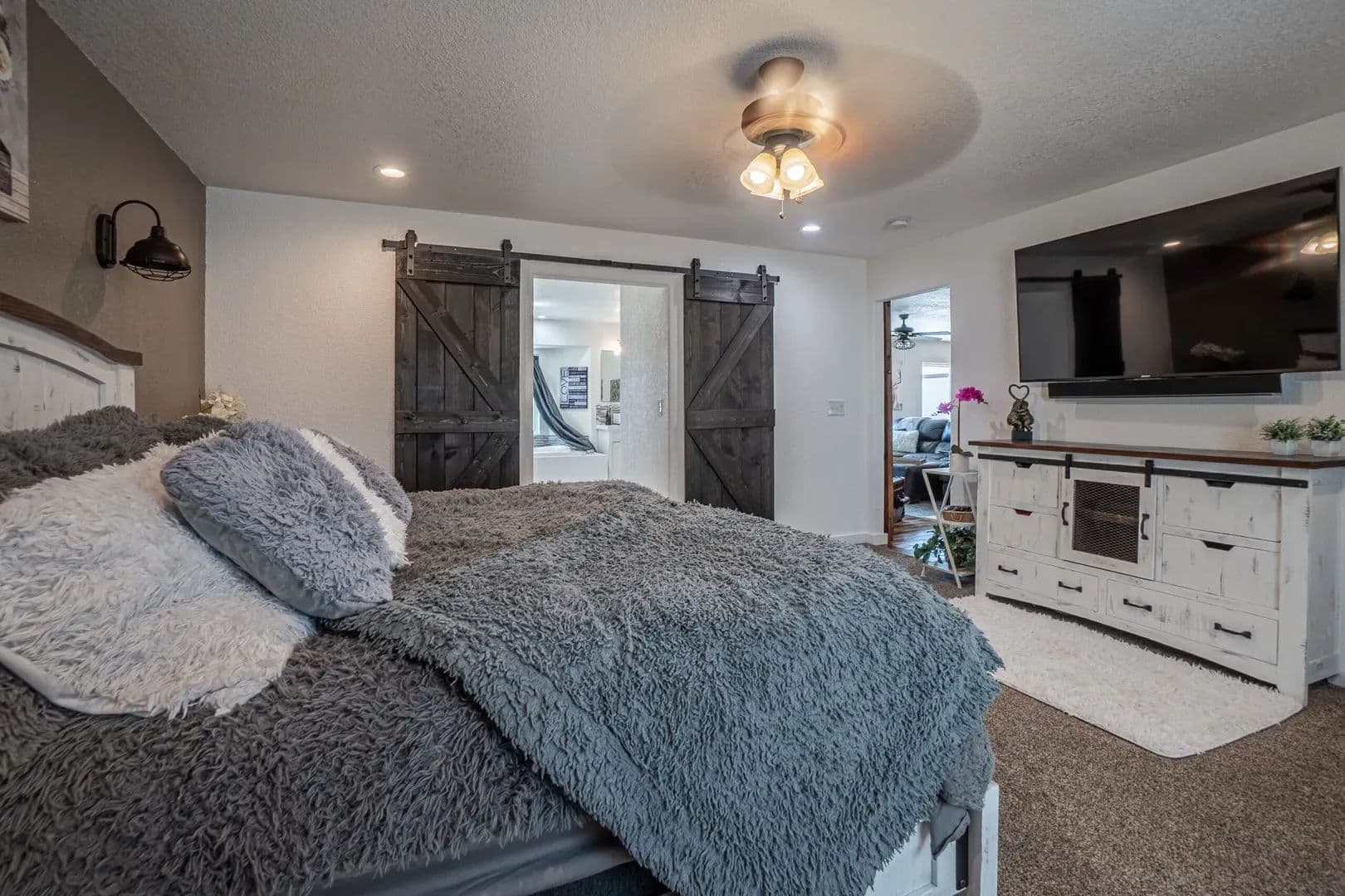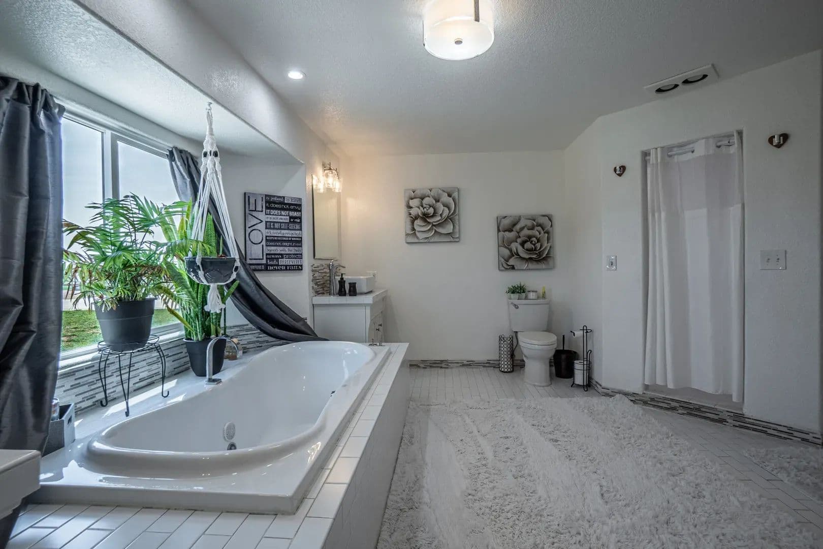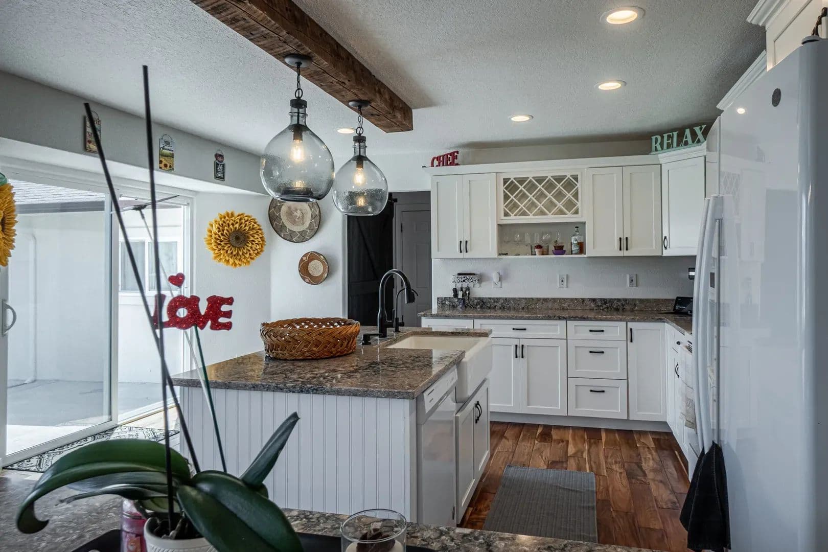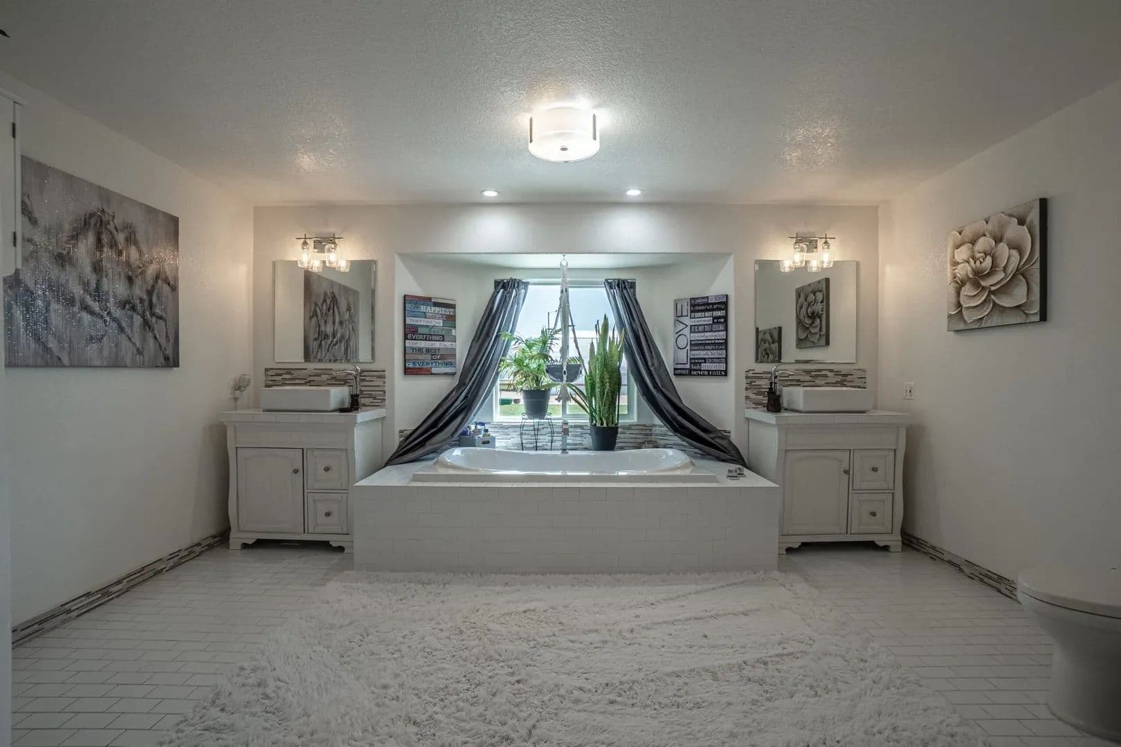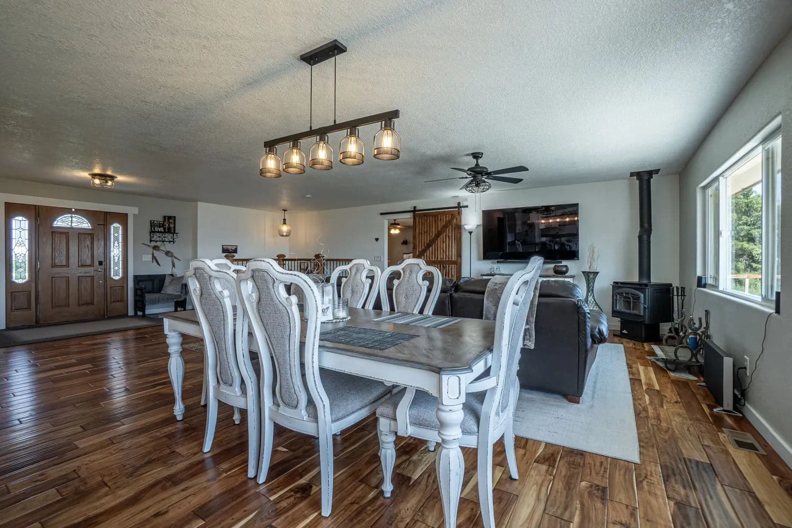 Improvements The primary residence is a well-designed, custom-built, ranch styled home constructed in 2015, offering 4,620 square feet of finished living space across two levels. The main floor has an open-concept layout with hardwood flooring throughout, highlighted by a spacious country kitchen complete with granite countertops, white cabinetry, and a large center island. This chef’s kitchen flows seamlessly into the dining and living areas, making it ideal for hosting family and friends. The master suite is located on the main level and features a luxurious five-piece bath, including a soaking tub, dual vanities, and an oversized walk-in tile shower. An additional bedroom and full bathroom are also found on the main floor.