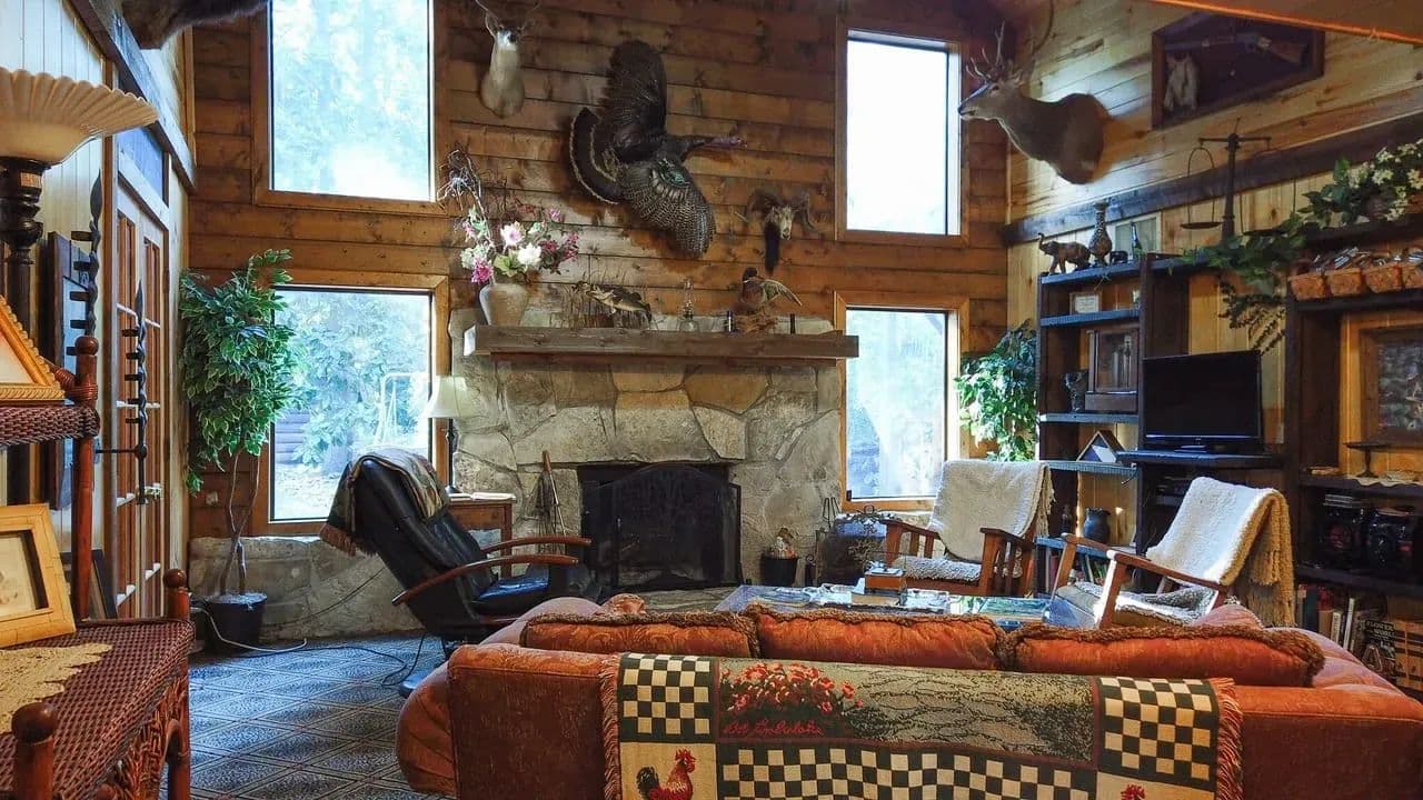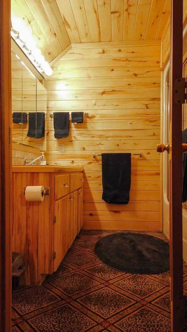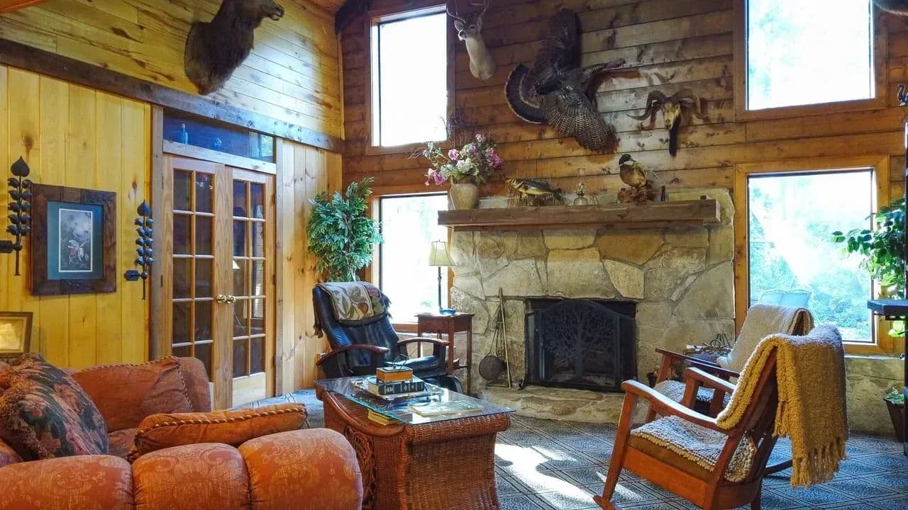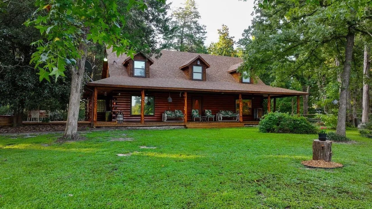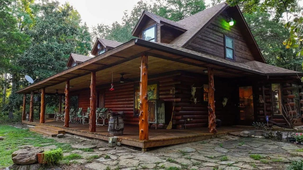 3,804 sq ft log cabin 4 bed, 2 bath Primary suite downstairs Expansive windows & lake views