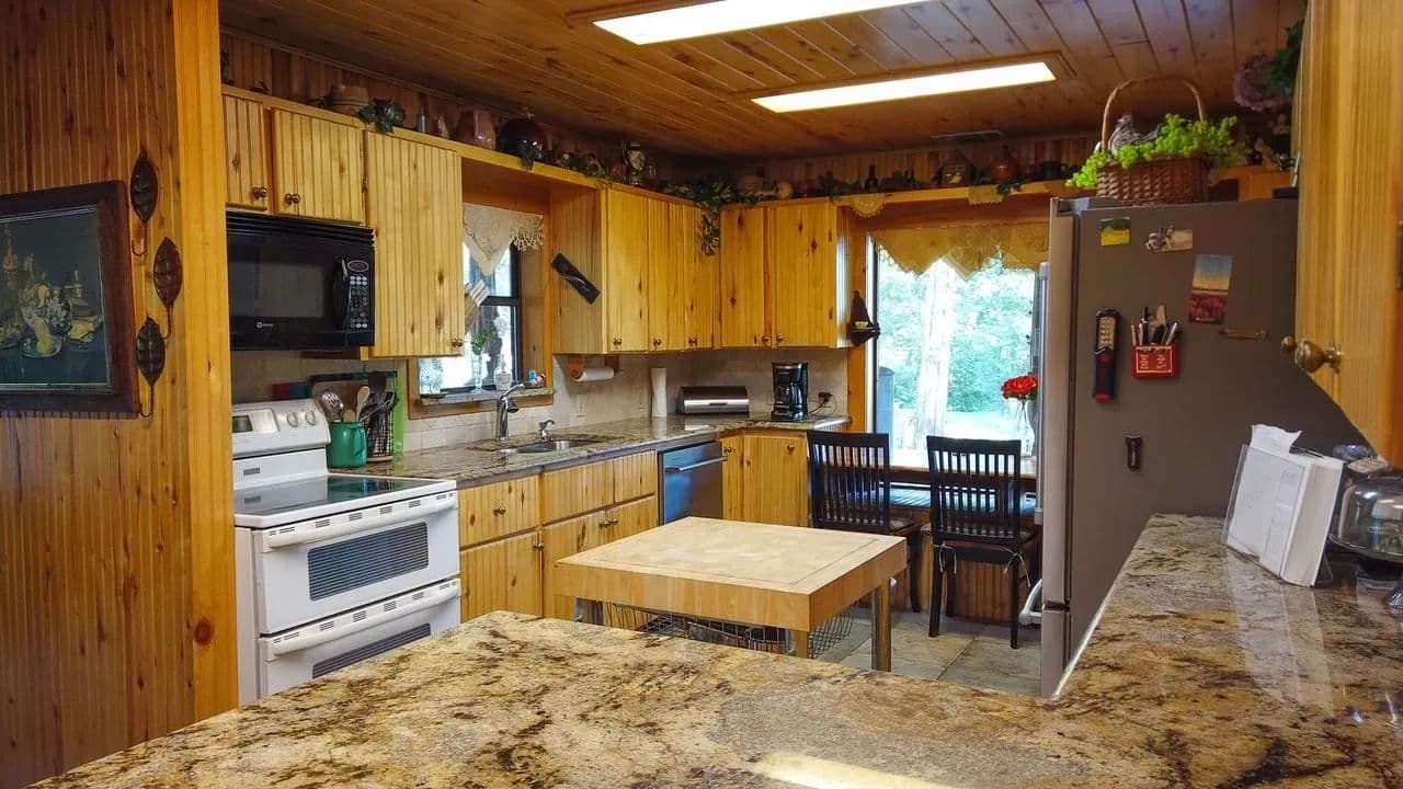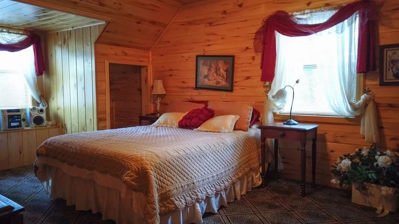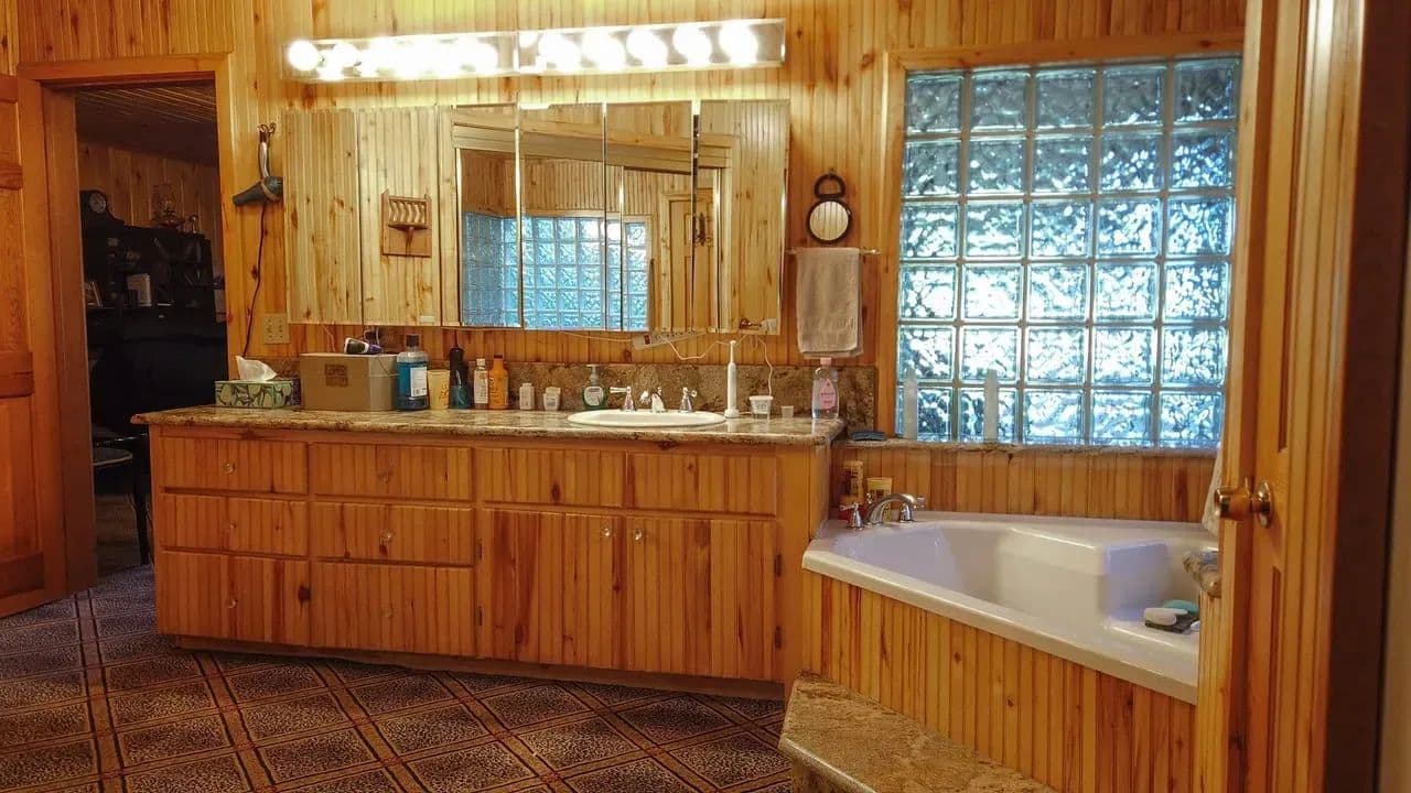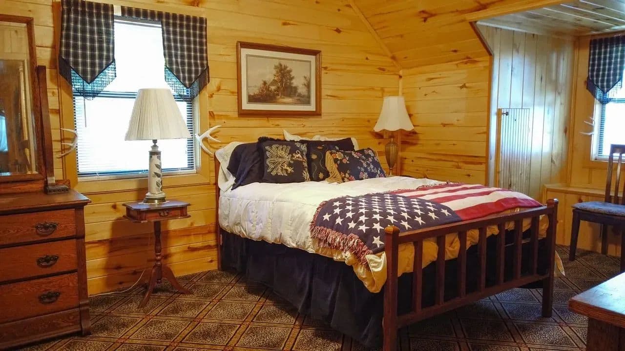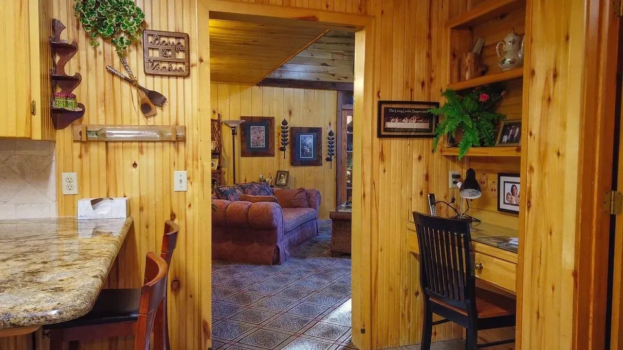 3,804 sq ft log cabin 4 bed, 2 bath Primary suite downstairs Expansive windows & lake views