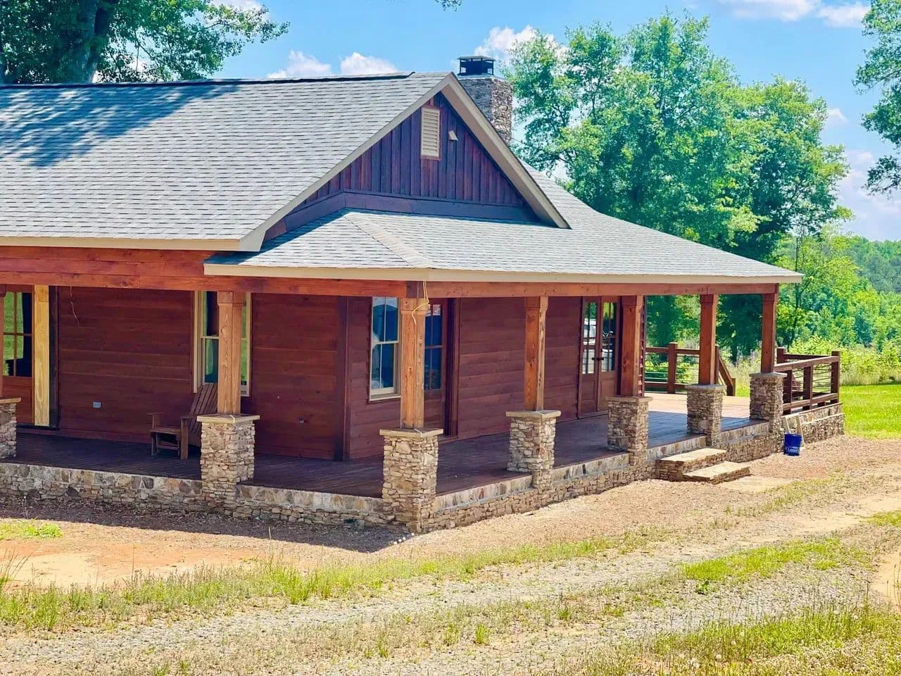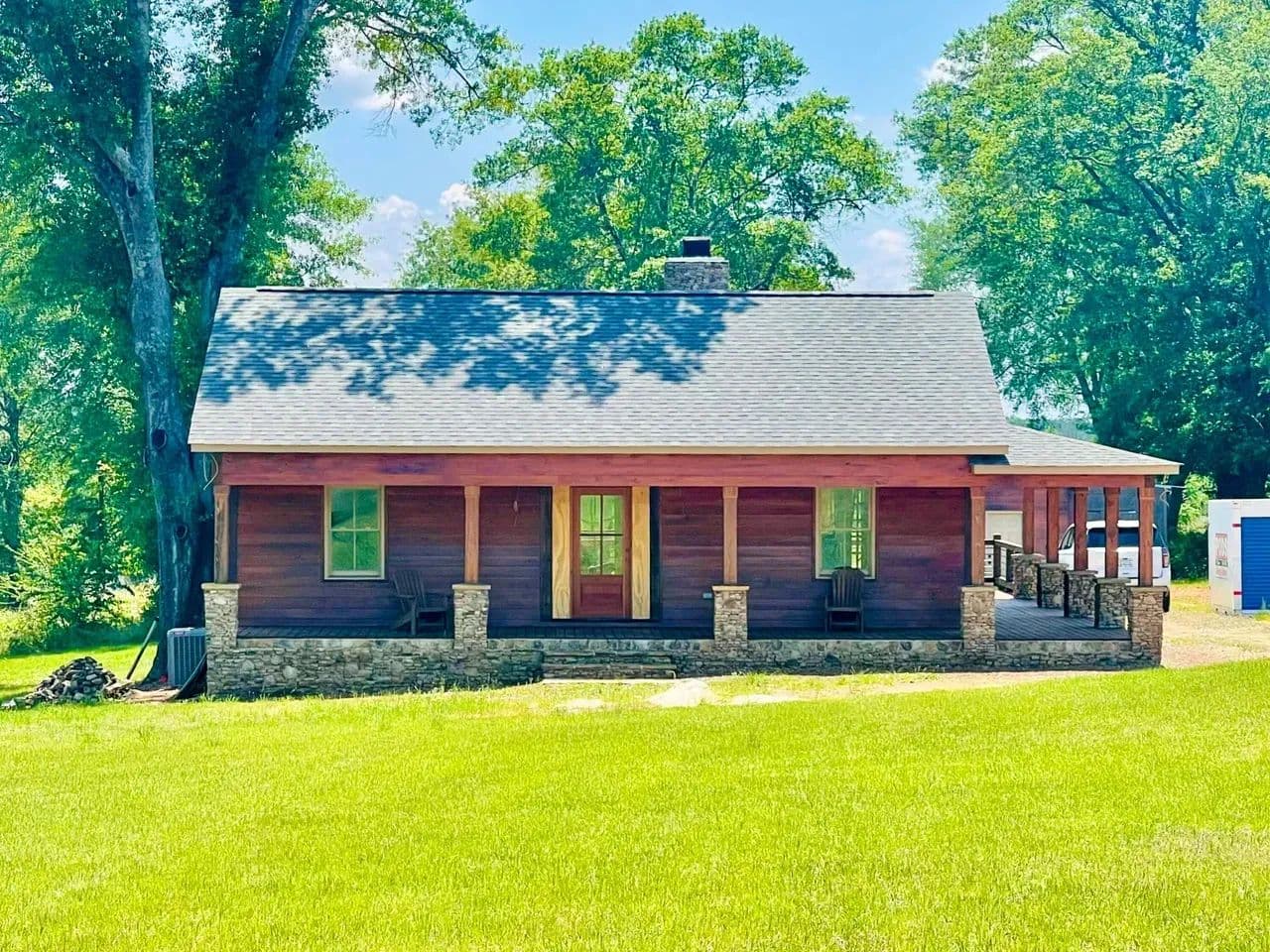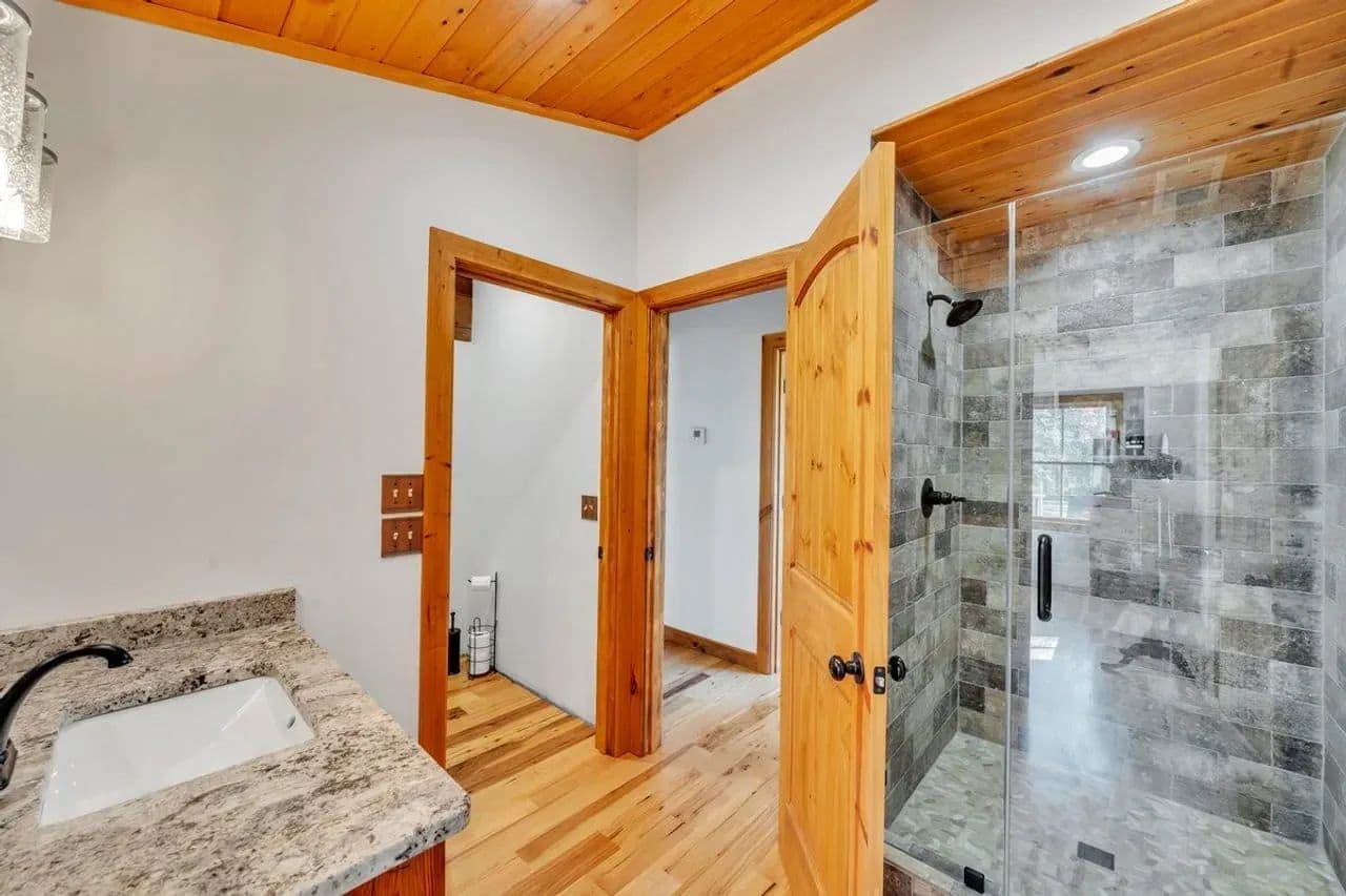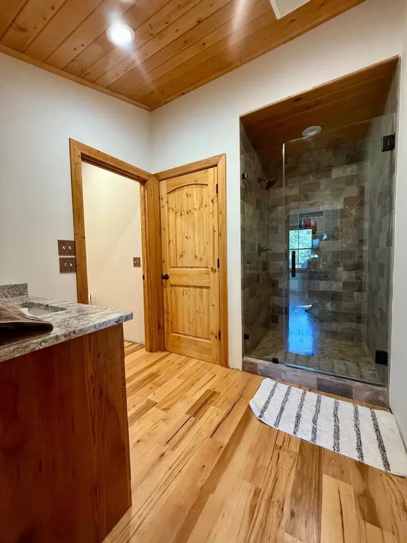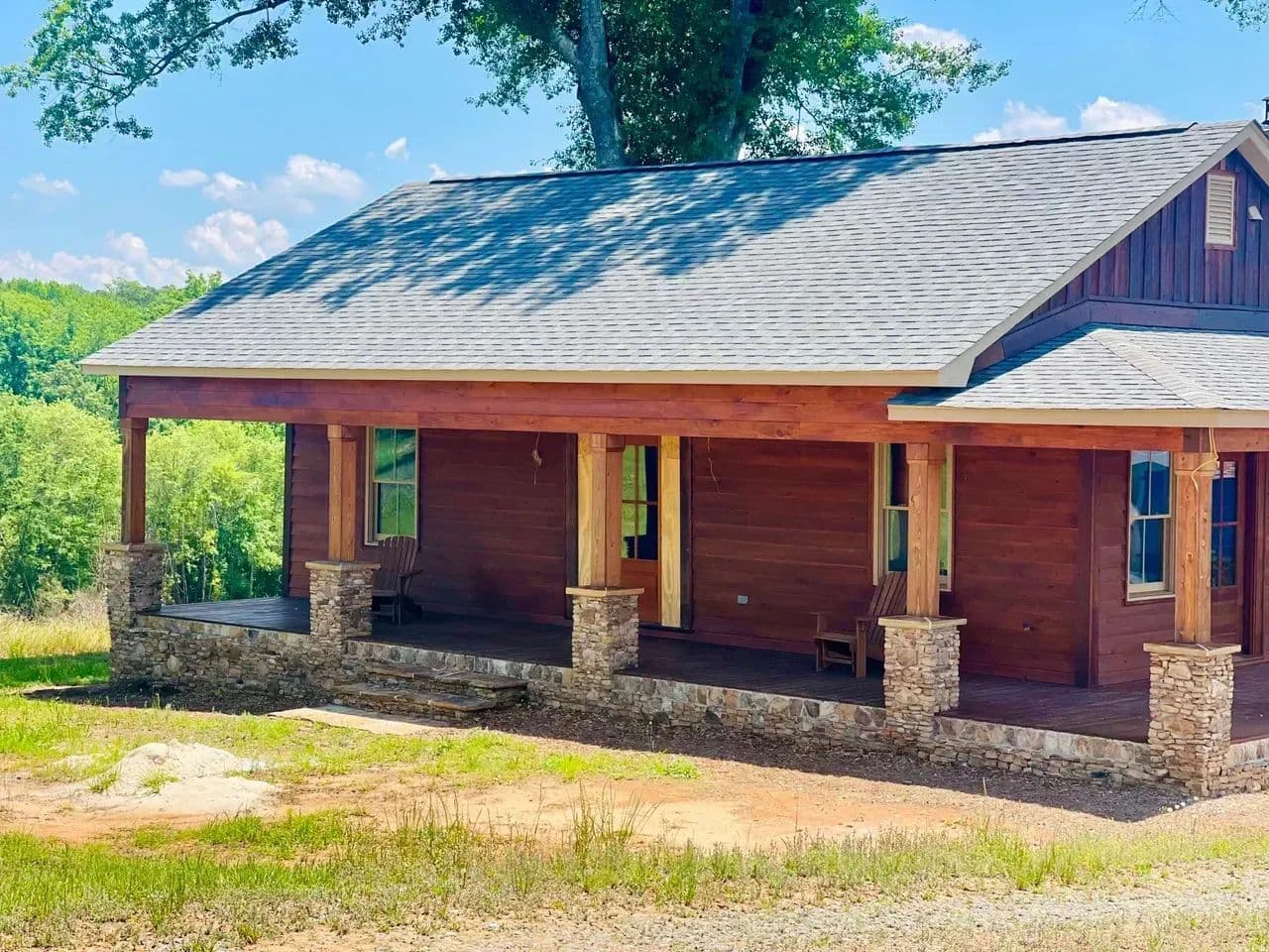 2br 2ba 1295 sq ft beautiful custom wood cabin. Cypress siding and ceilings, hickory floors, granite countertops, heart pine cabinets, 2.5 ton heat pump, LP gas, tankless water heater Rinnai unit, gas fireplace, and gas stovetop.