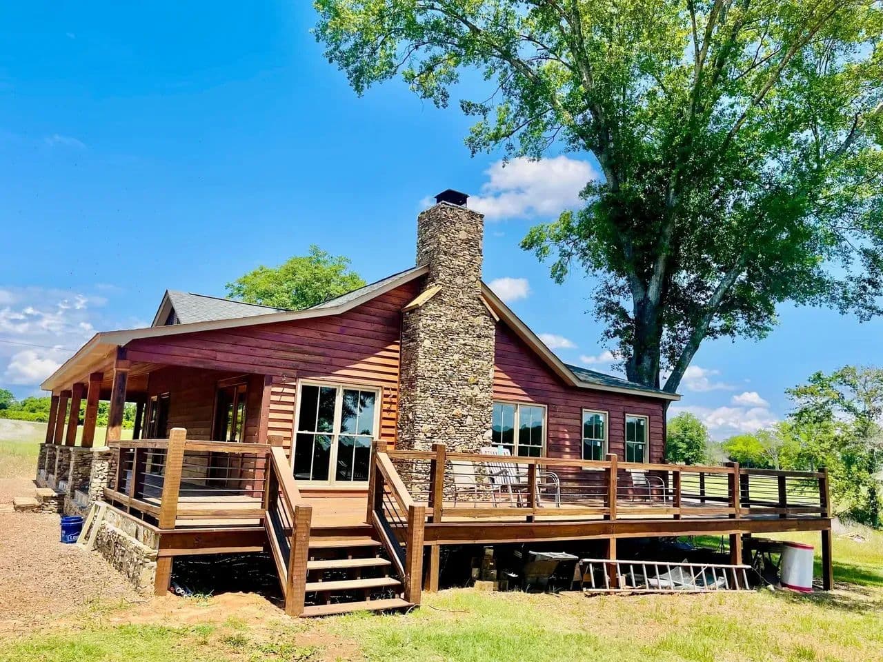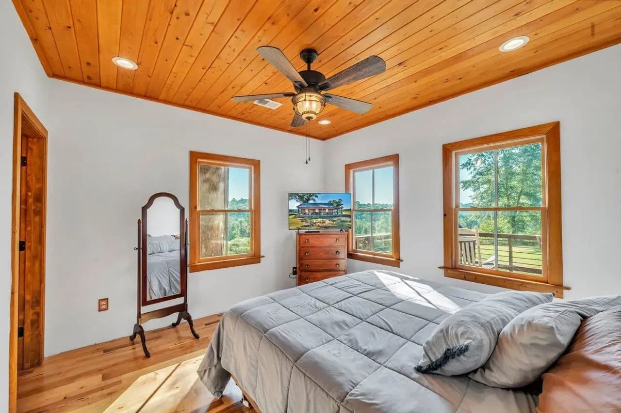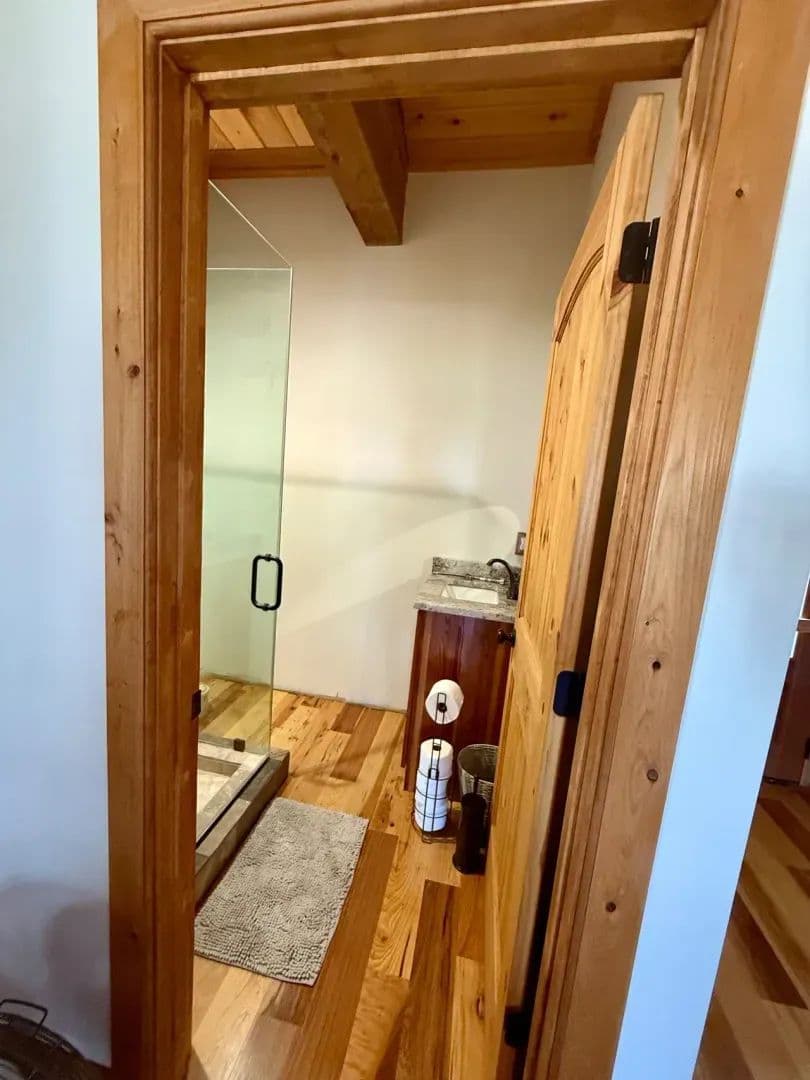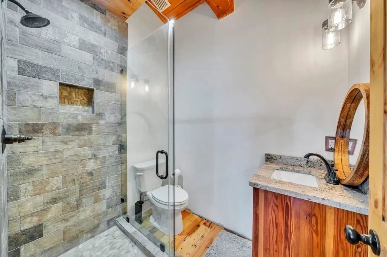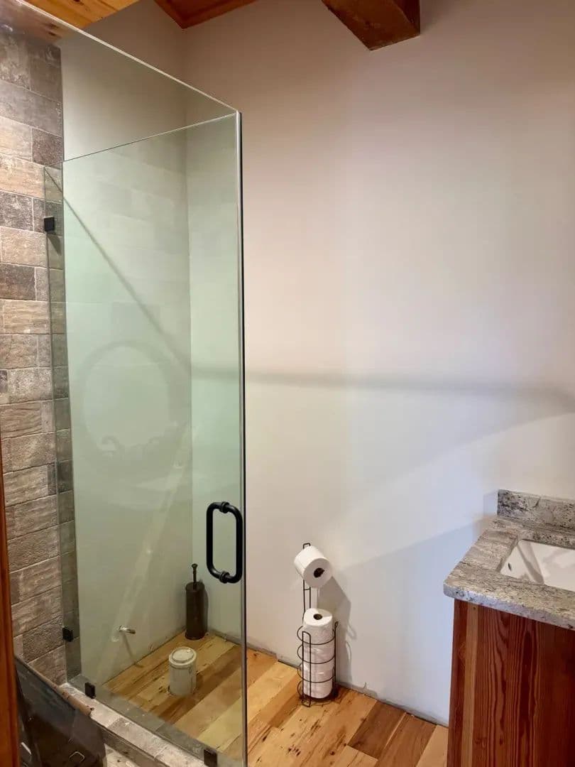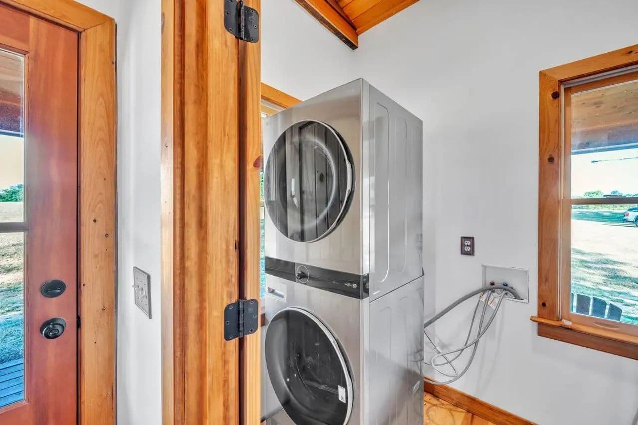 2br 2ba 1295 sq ft beautiful custom wood cabin. Cypress siding and ceilings, hickory floors, granite countertops, heart pine cabinets, 2.5 ton heat pump, LP gas, tankless water heater Rinnai unit, gas fireplace, and gas stovetop.