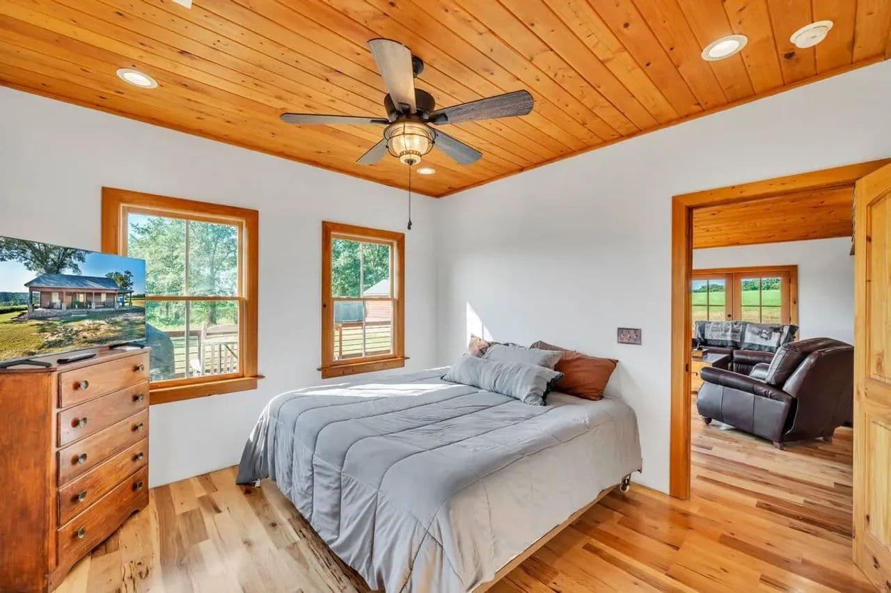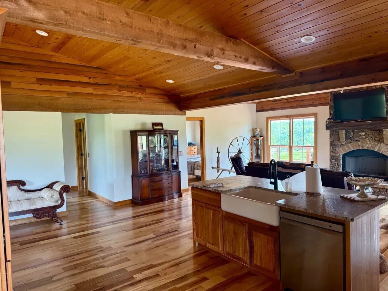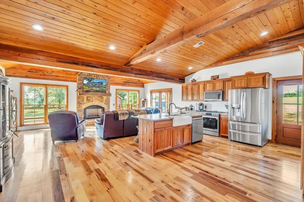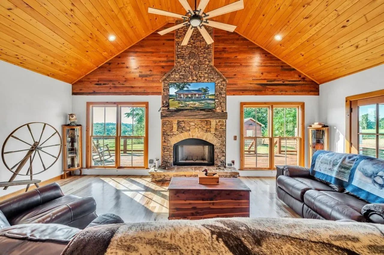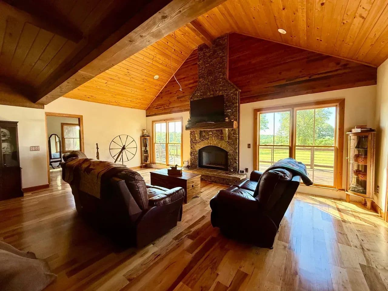 2br 2ba 1295 sq ft beautiful custom wood cabin. Cypress siding and ceilings, hickory floors, granite countertops, heart pine cabinets, 2.5 ton heat pump, LP gas, tankless water heater Rinnai unit, gas fireplace, and gas stovetop.