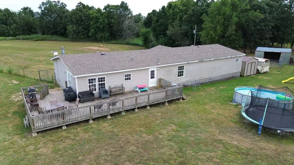 Improvements Improvements on the property include a 2,660 sq. ft. manufactured home with 4 bedrooms and 2 bathrooms, along with a pole barn covered in metal siding for storage or equipment use.