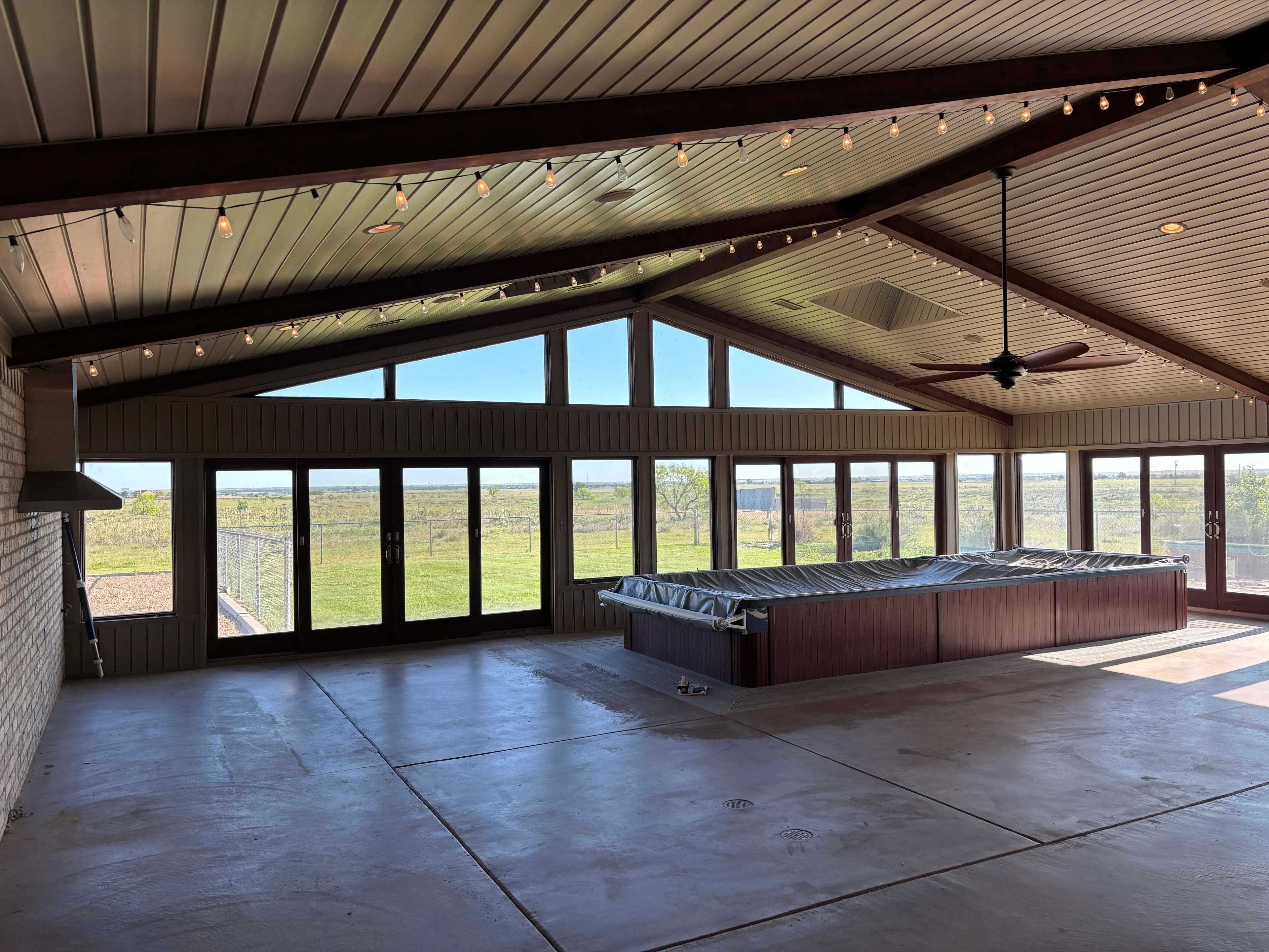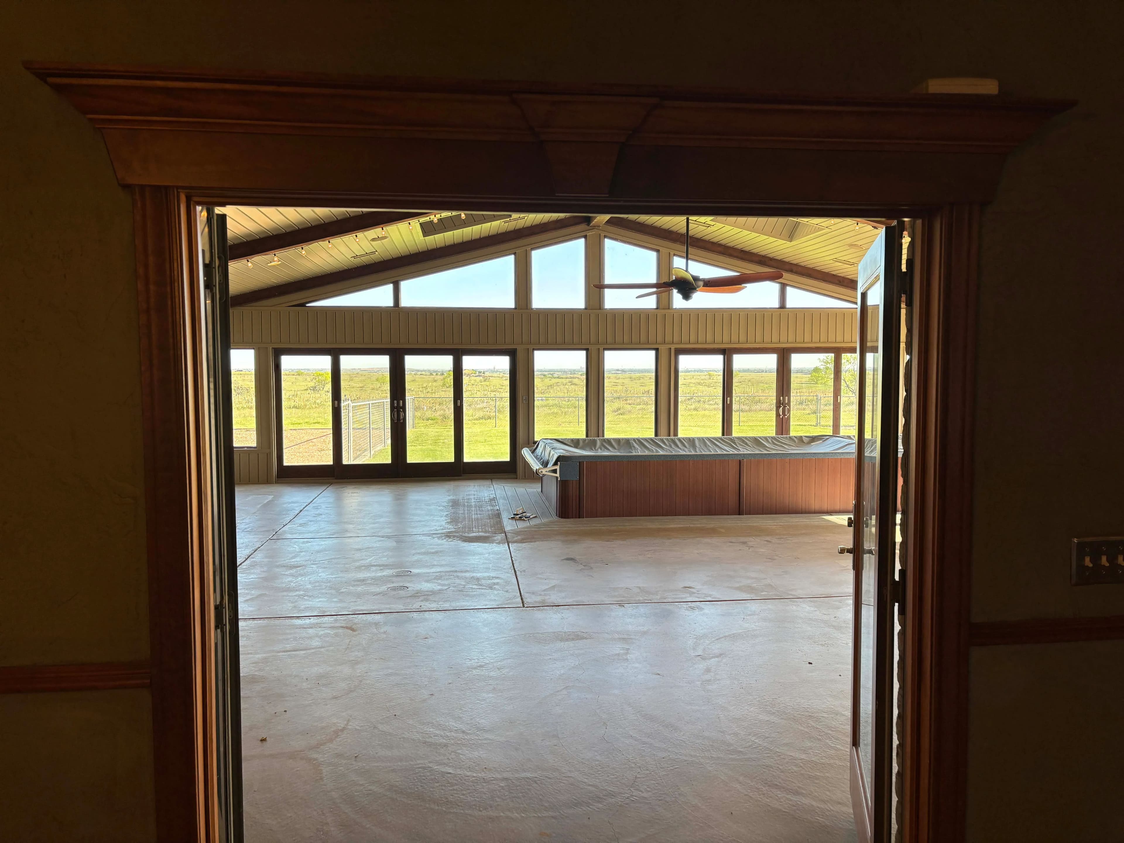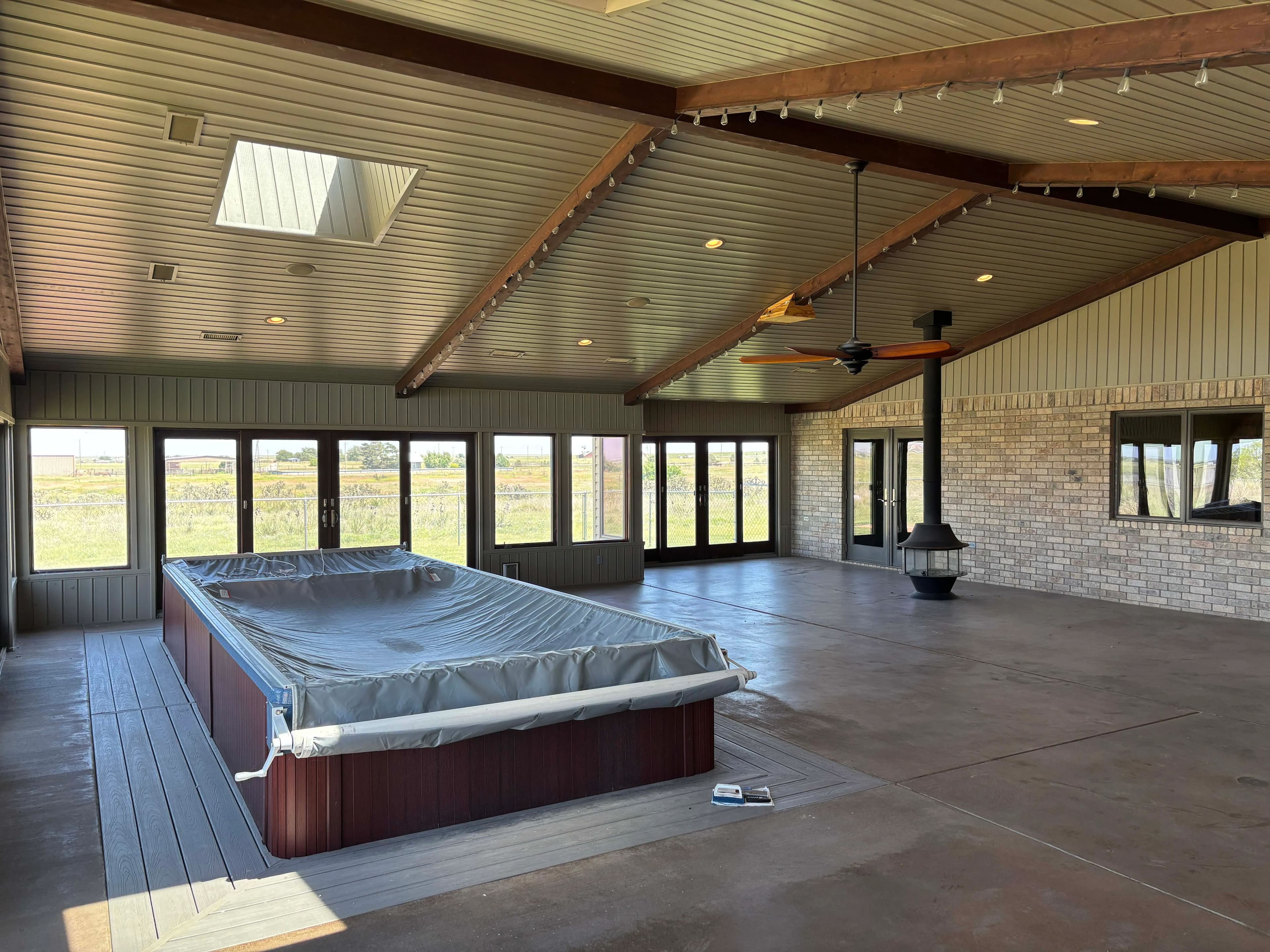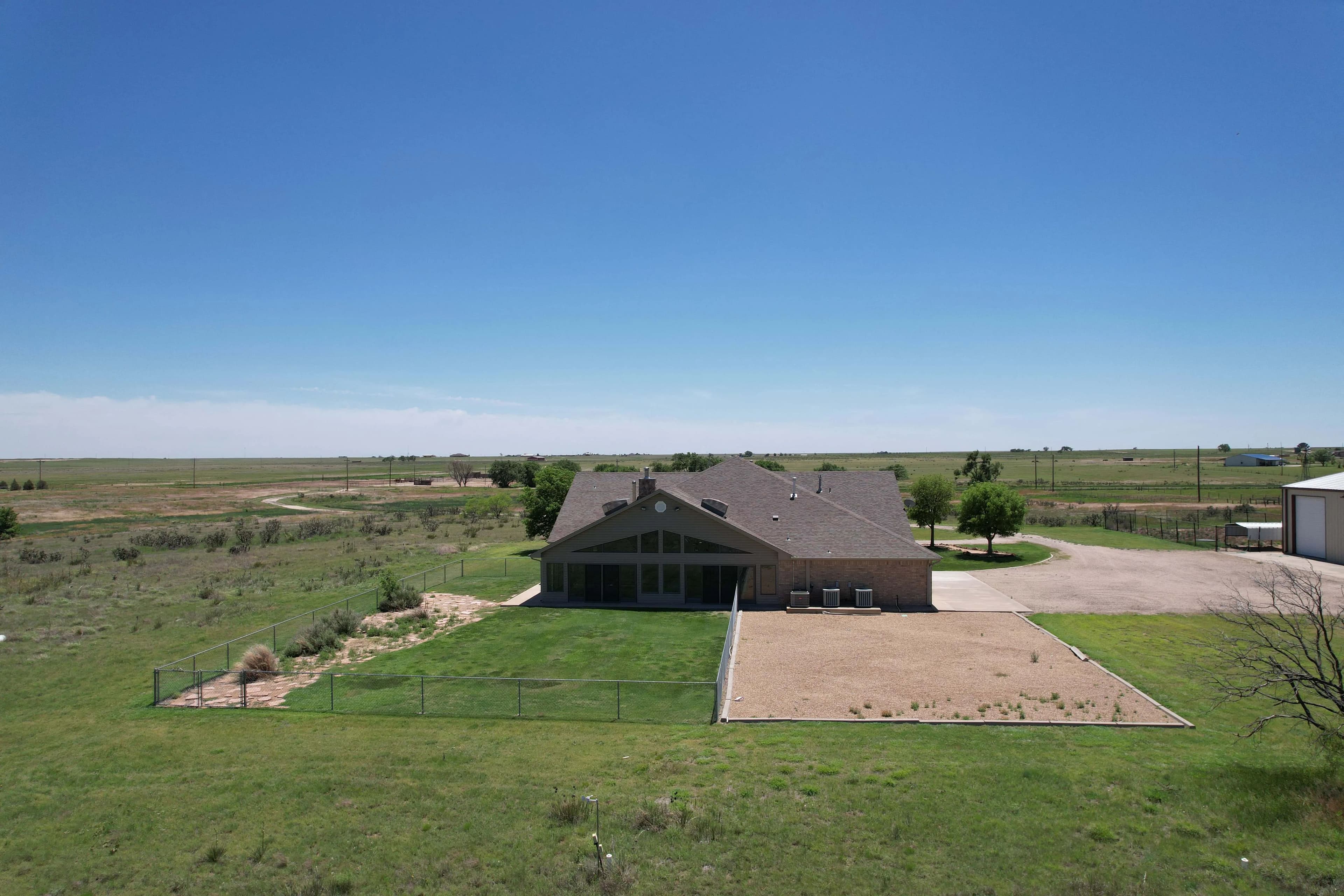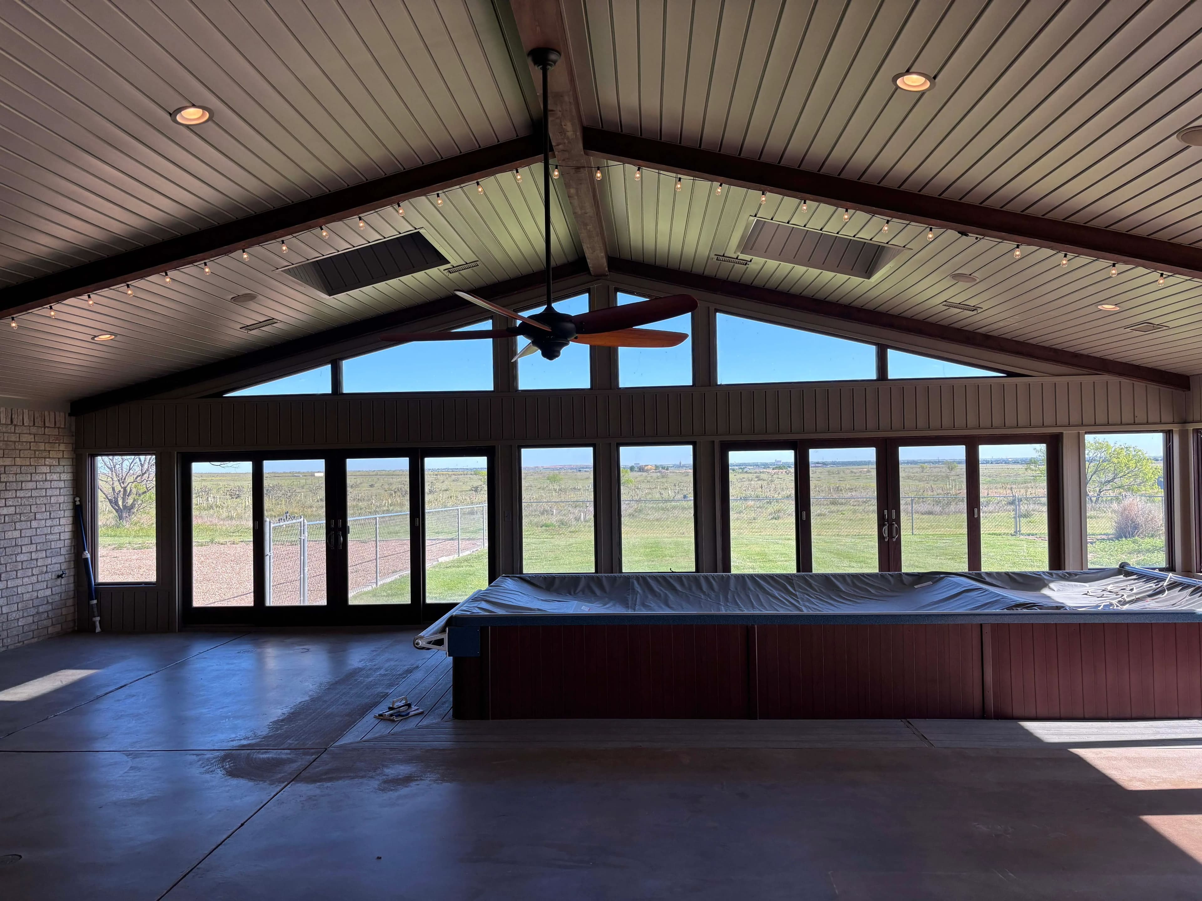 This 76 +/- acre gem is a rare opportunity located just 6.5 miles south of Canyon, TX, on Buffalo Lake Road (FM 1714). It truly has everything you could want in a country property! The custom three-bedroom, two-bath brick home built in 2005 features 2,338 sq ft of thoughtfully designed living space. The isolated master suite includes his and hers closets, a soaking tub, and a spacious walk-in shower. Two additional bedrooms share a hall bath on the opposite side of the home, with a centrally located bonus room perfect for an office, craft space, or media nook. The open-concept kitchen and living area flow seamlessly into the heart of the home—a 1,413 sq ft climate-controlled indoor/outdoor entertainment haven. Soak in the hot tub, swim in the endless pool, and take in sweeping, unobstructed views through a wall of windows. With surround sound, a vent hood, and a cozy fireplace, it’s a showstopper for entertaining family and friends. Open the surrounding windows and doors to welcome in the cool evening breeze or the scent of spring rain.