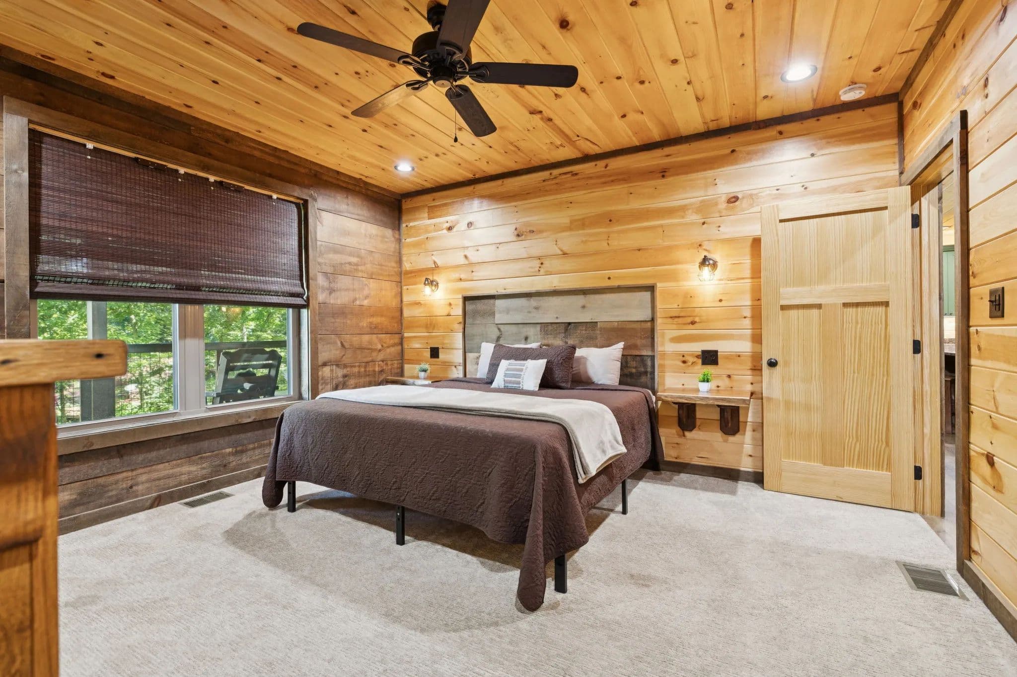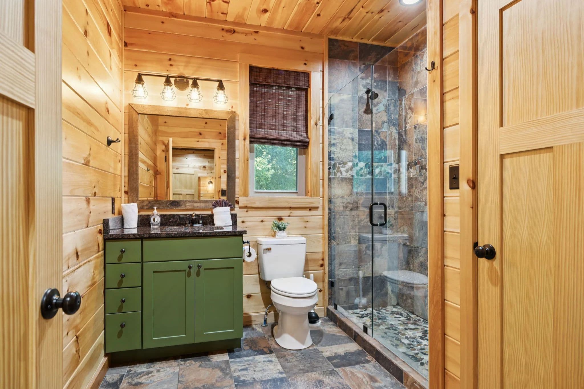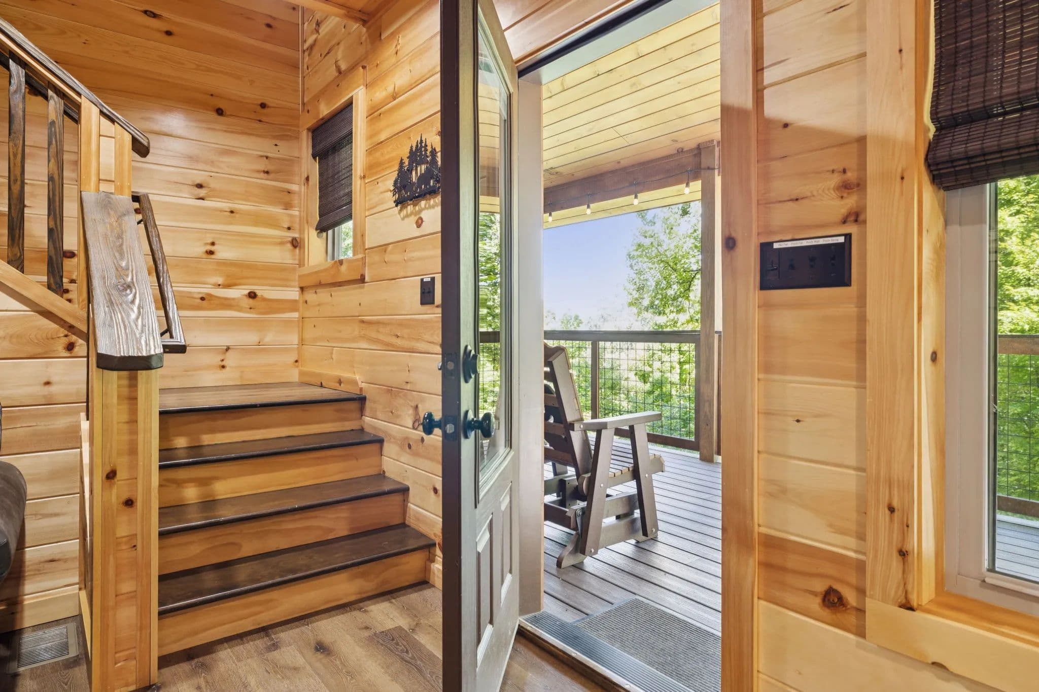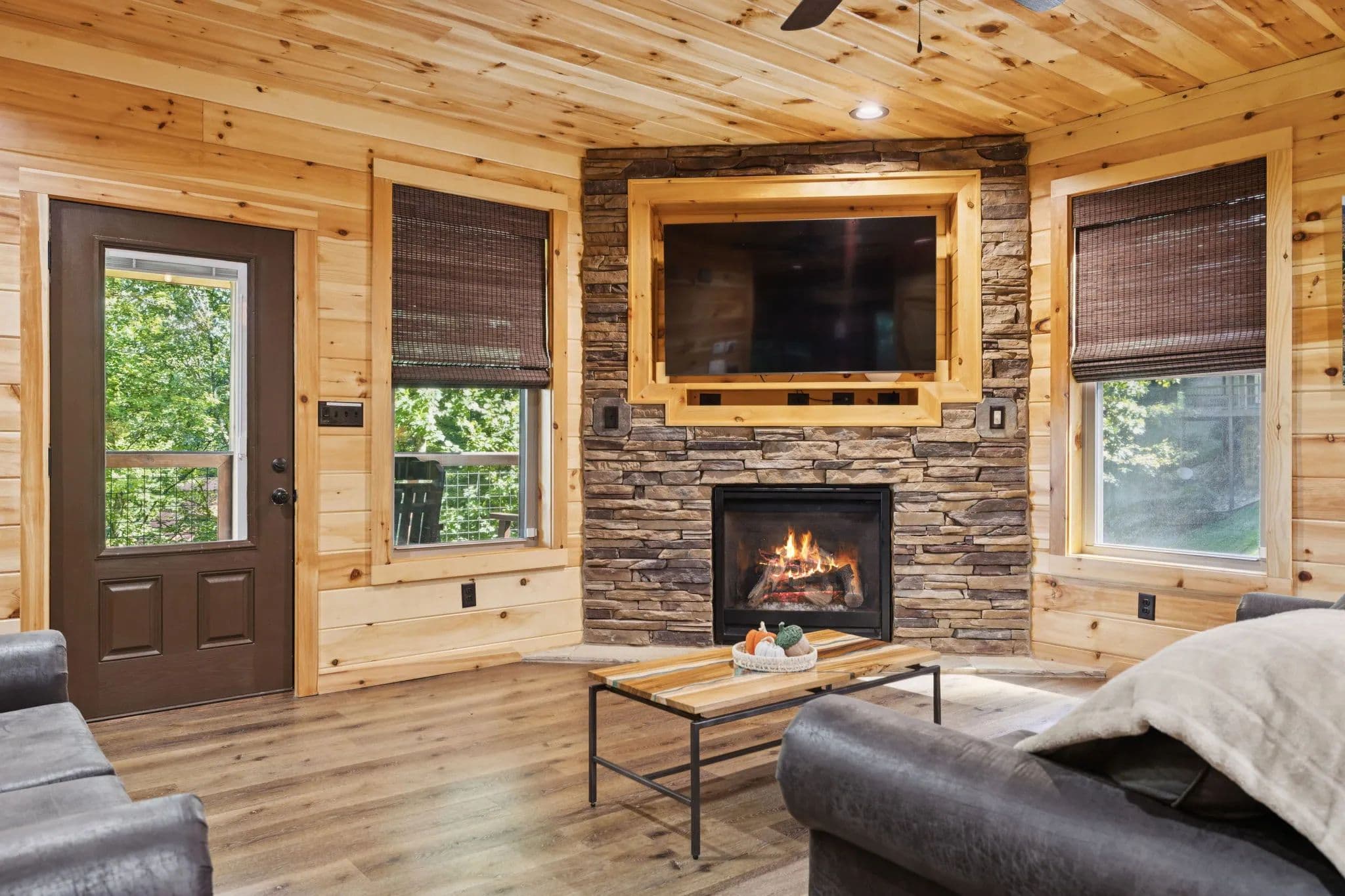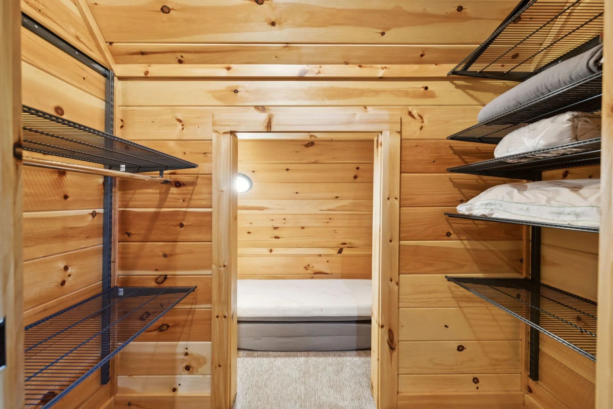 This cabin includes a whole-house water filtration system, tankless water heater, and flood lights on all corners. Pocket doors, USB charger outlets, built-in king headboards with floating shelves, and built-in blinds on entry doors add to the convenience and modern appeal.