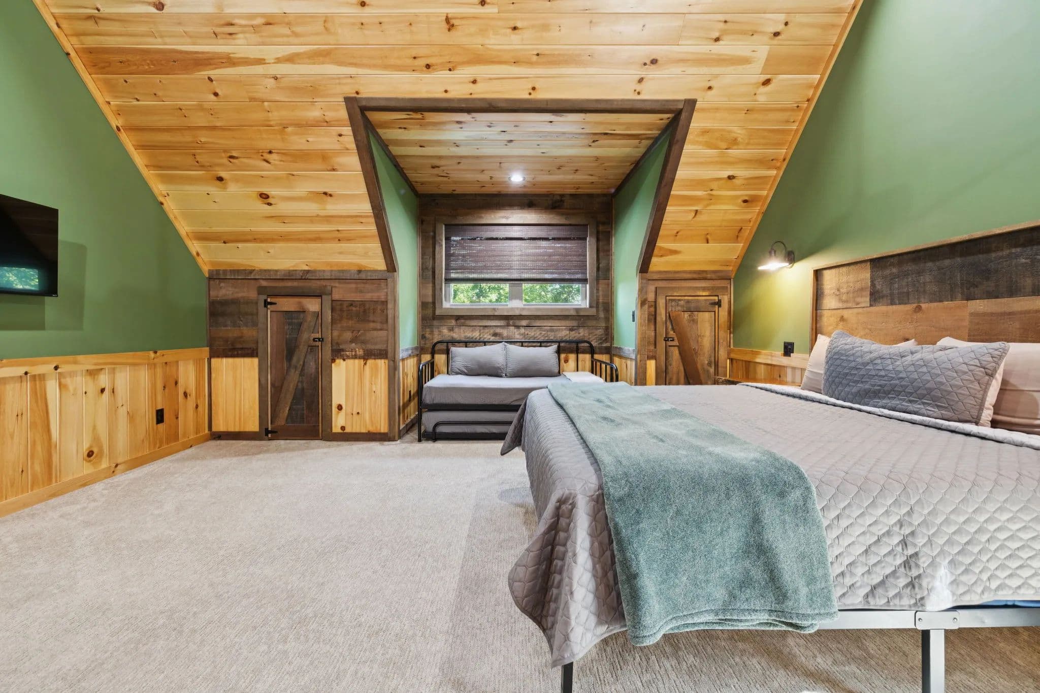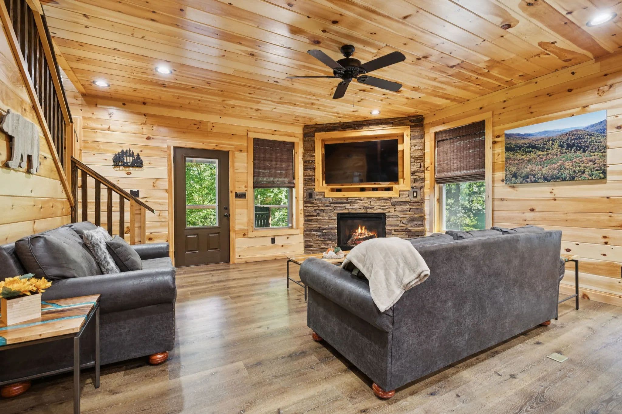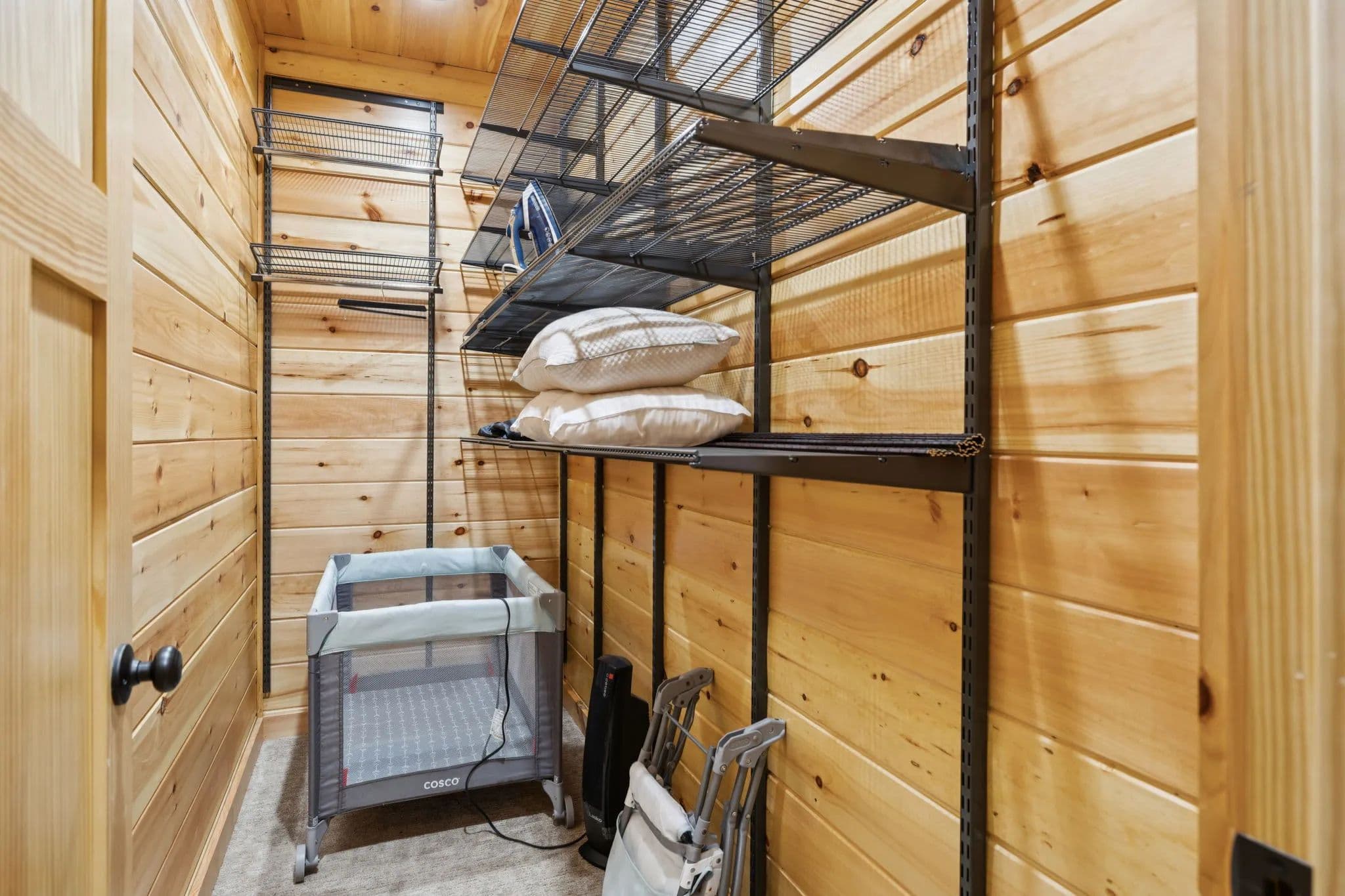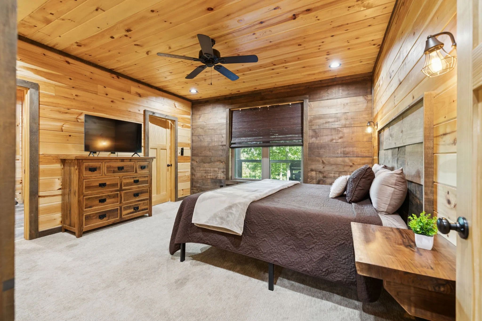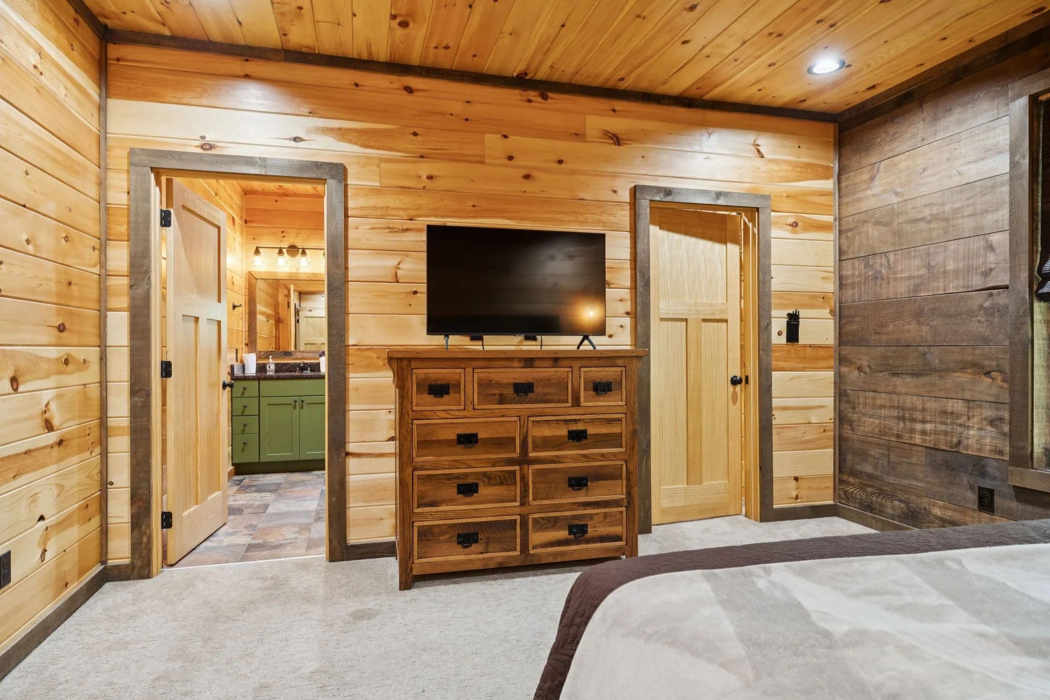 This cabin includes a whole-house water filtration system, tankless water heater, and flood lights on all corners. Pocket doors, USB charger outlets, built-in king headboards with floating shelves, and built-in blinds on entry doors add to the convenience and modern appeal.