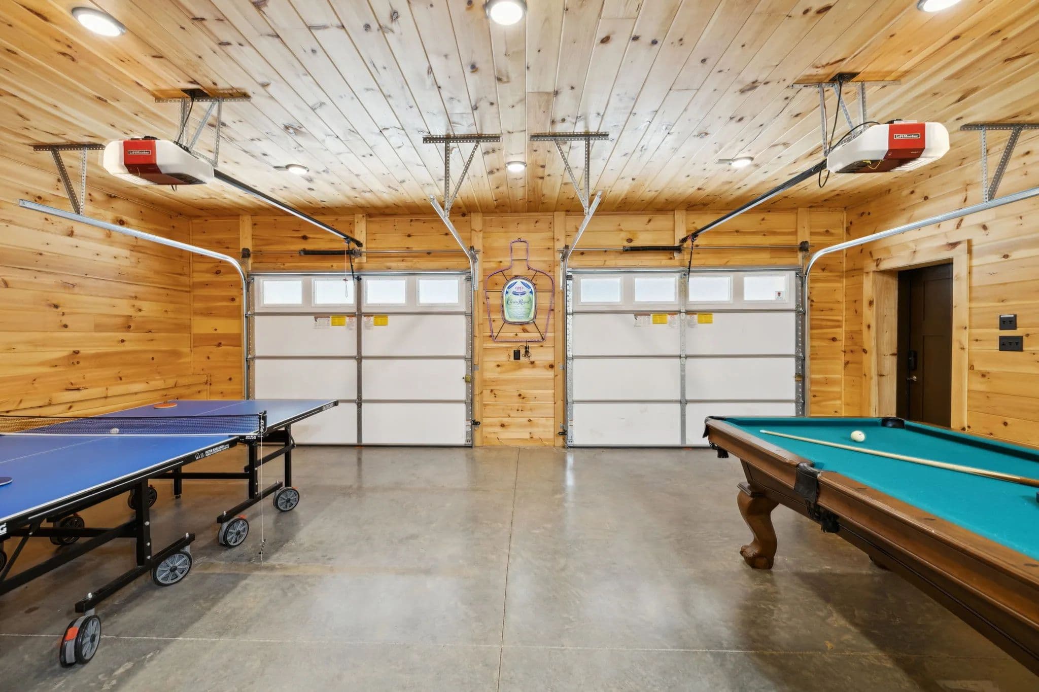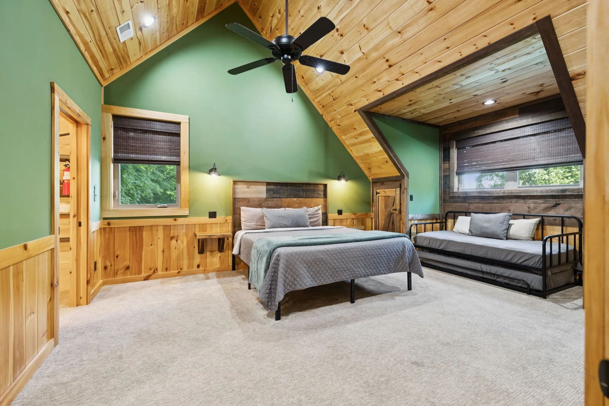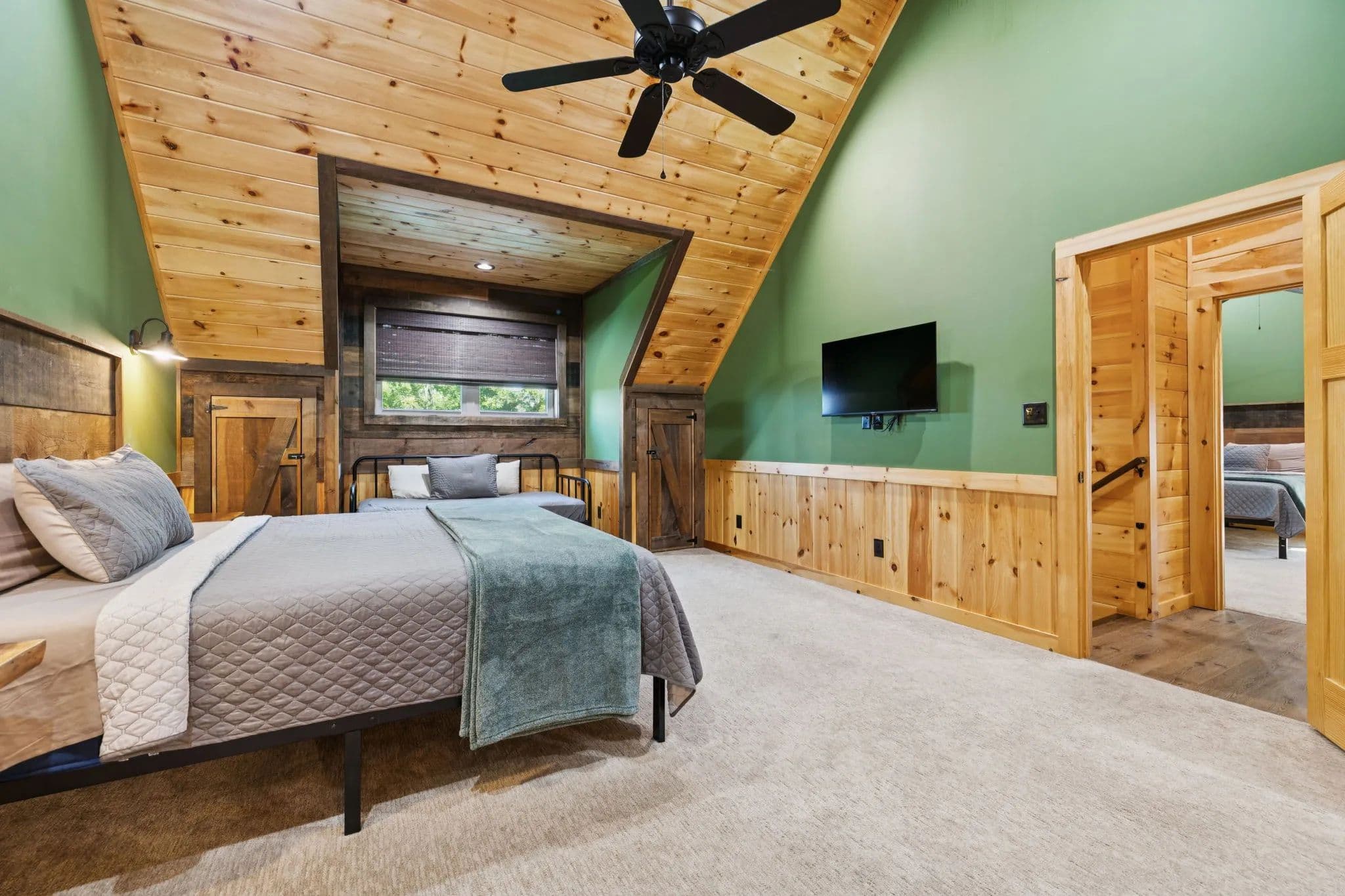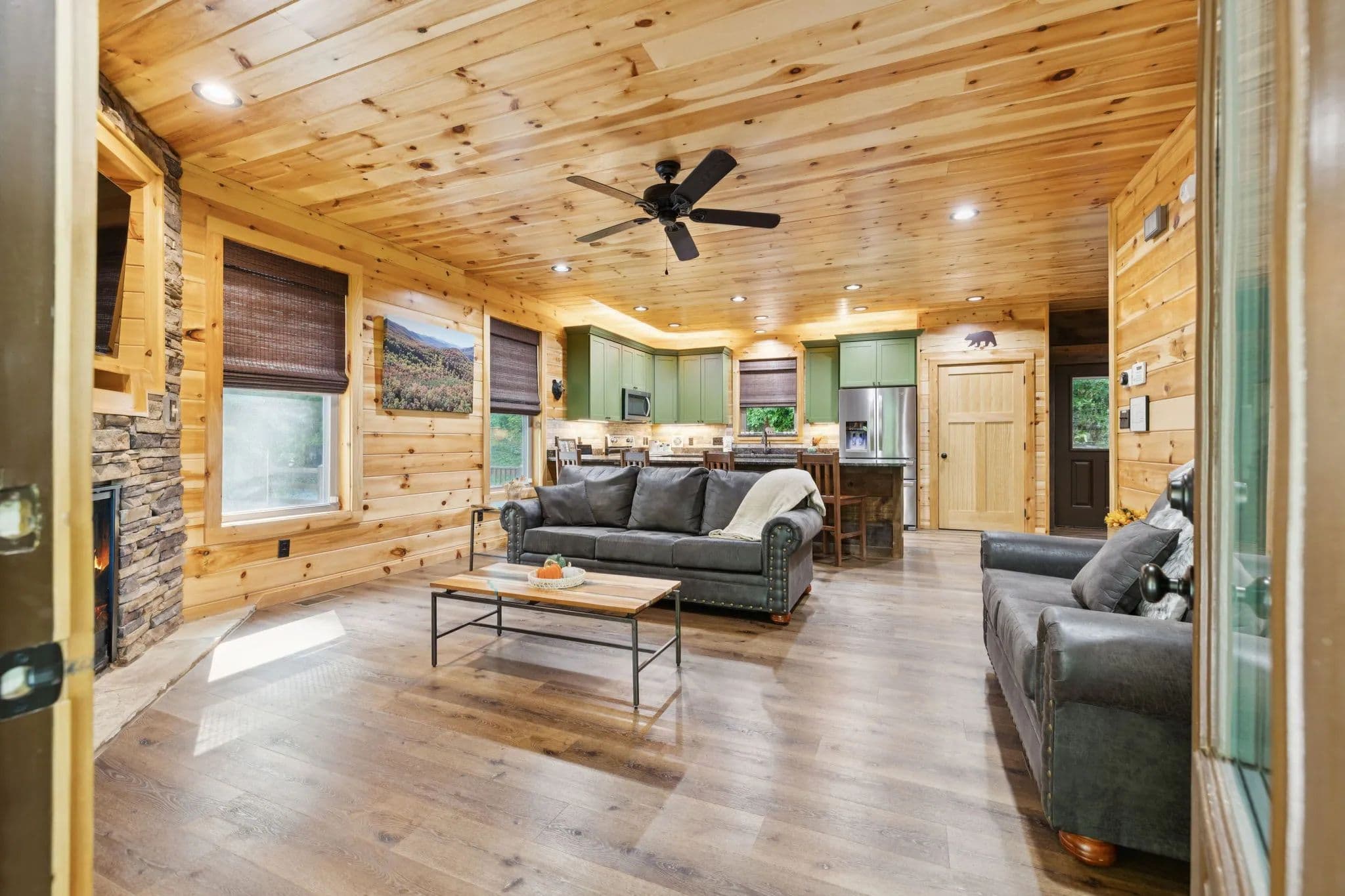 This cabin includes a whole-house water filtration system, tankless water heater, and flood lights on all corners. Pocket doors, USB charger outlets, built-in king headboards with floating shelves, and built-in blinds on entry doors add to the convenience and modern appeal.