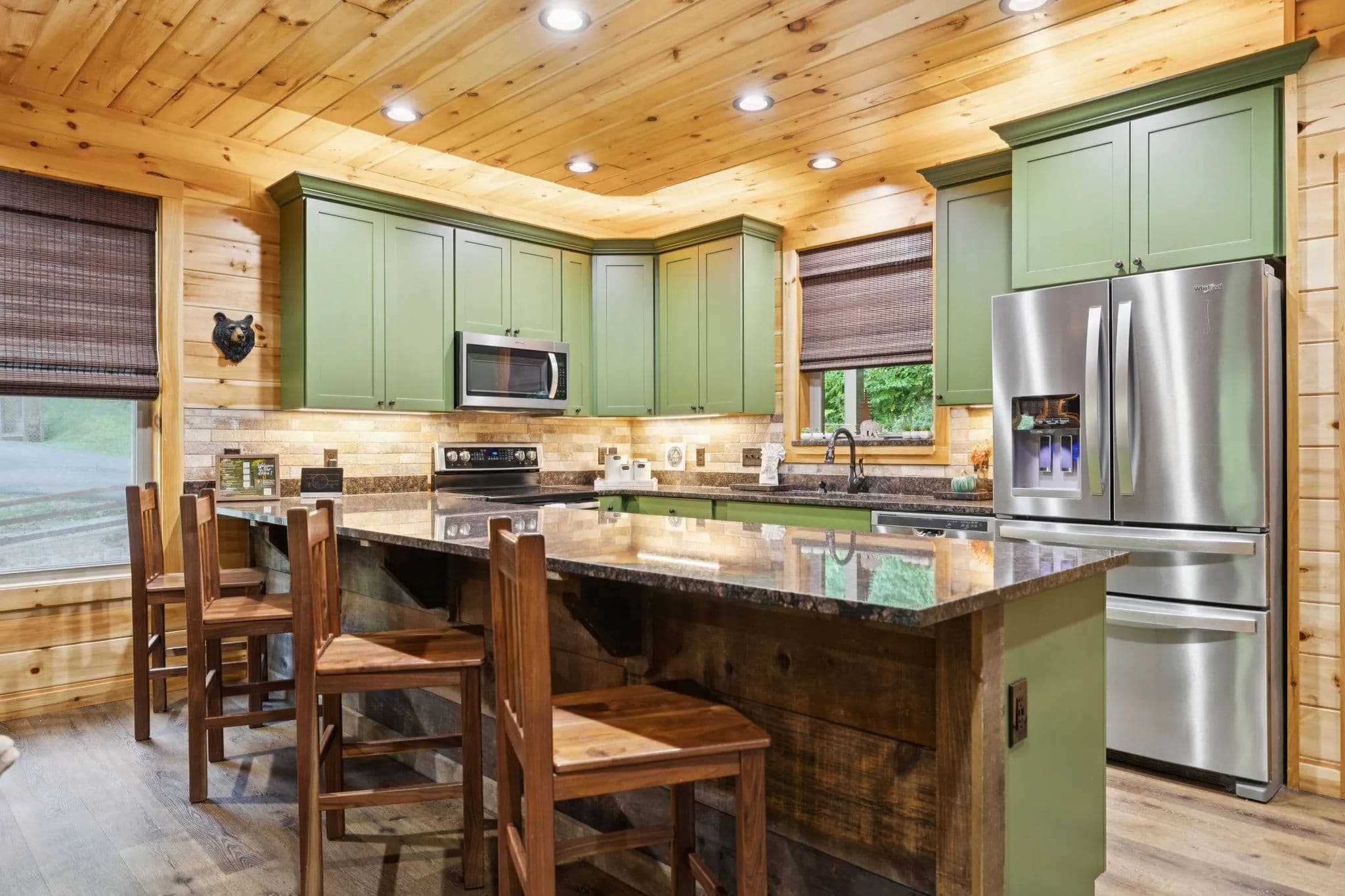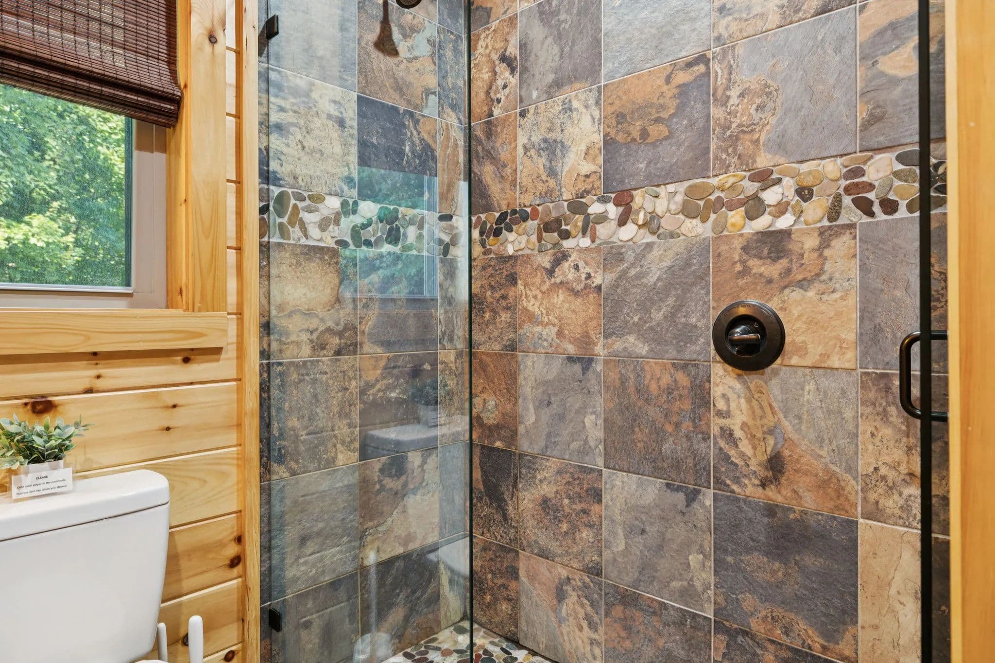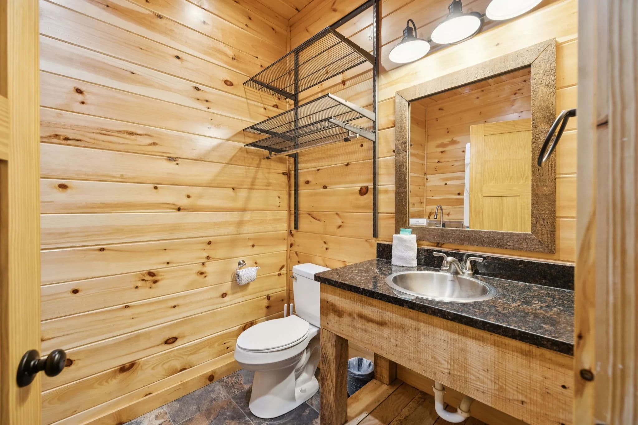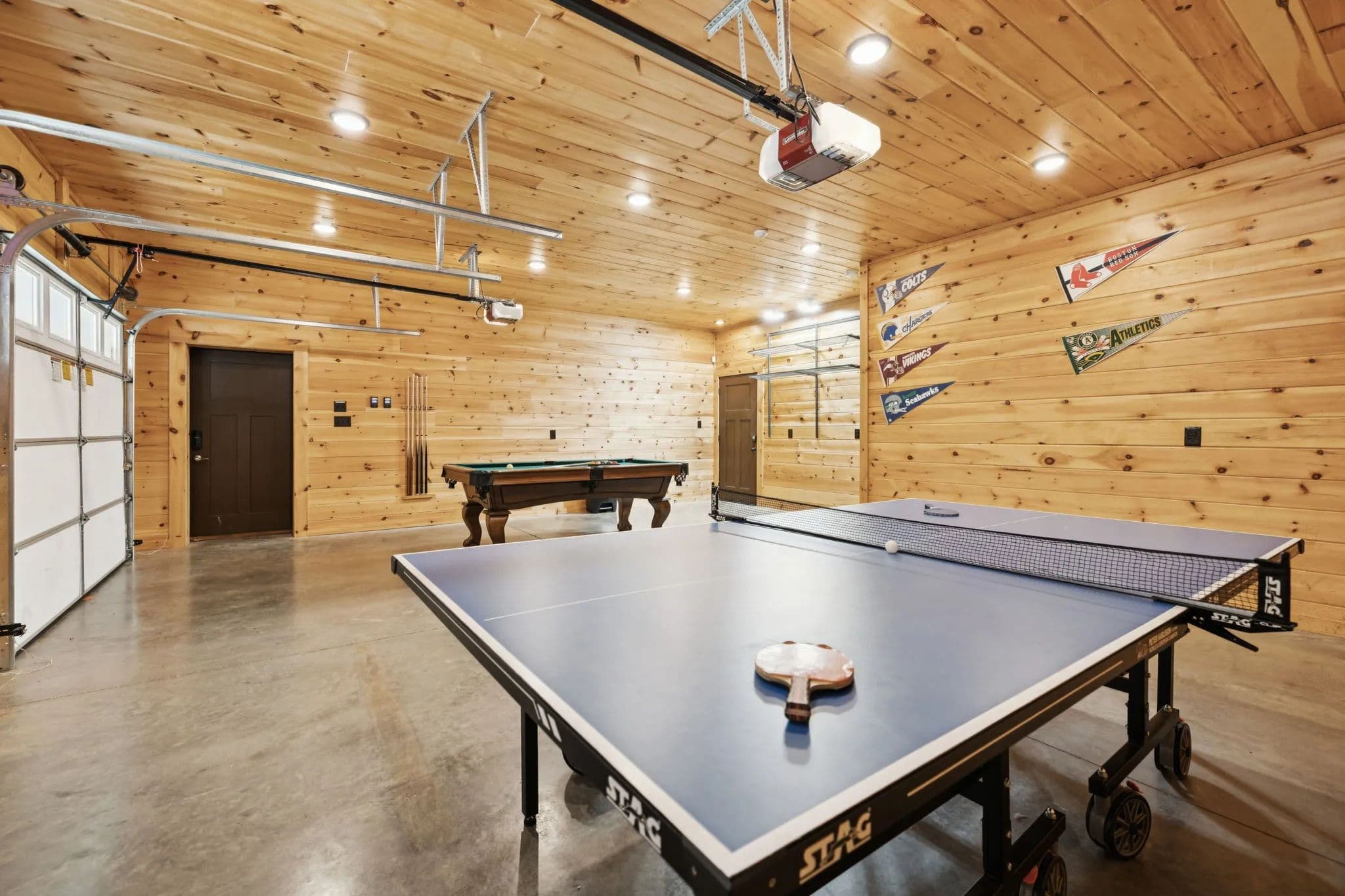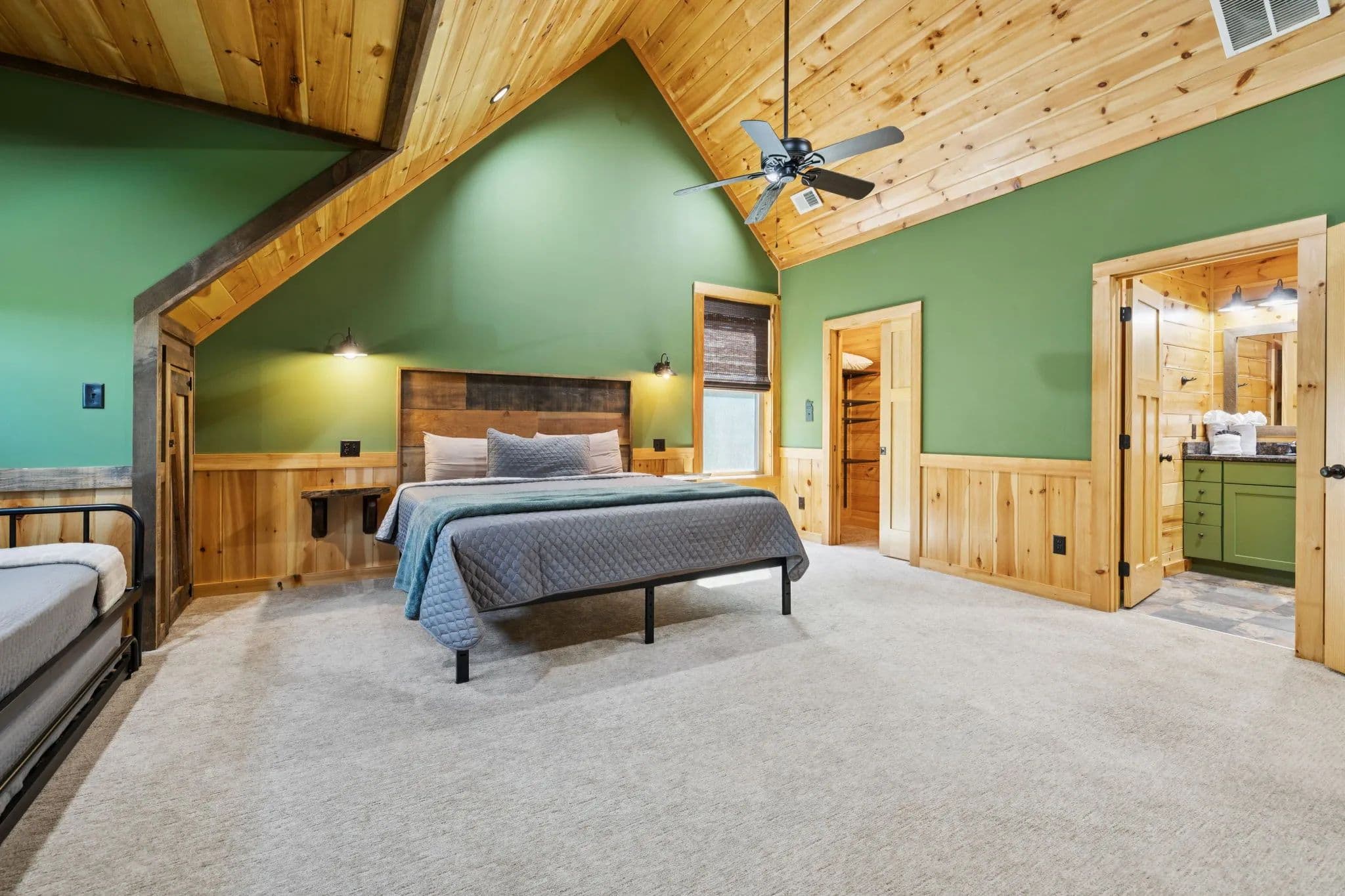 This cabin includes a whole-house water filtration system, tankless water heater, and flood lights on all corners. Pocket doors, USB charger outlets, built-in king headboards with floating shelves, and built-in blinds on entry doors add to the convenience and modern appeal.