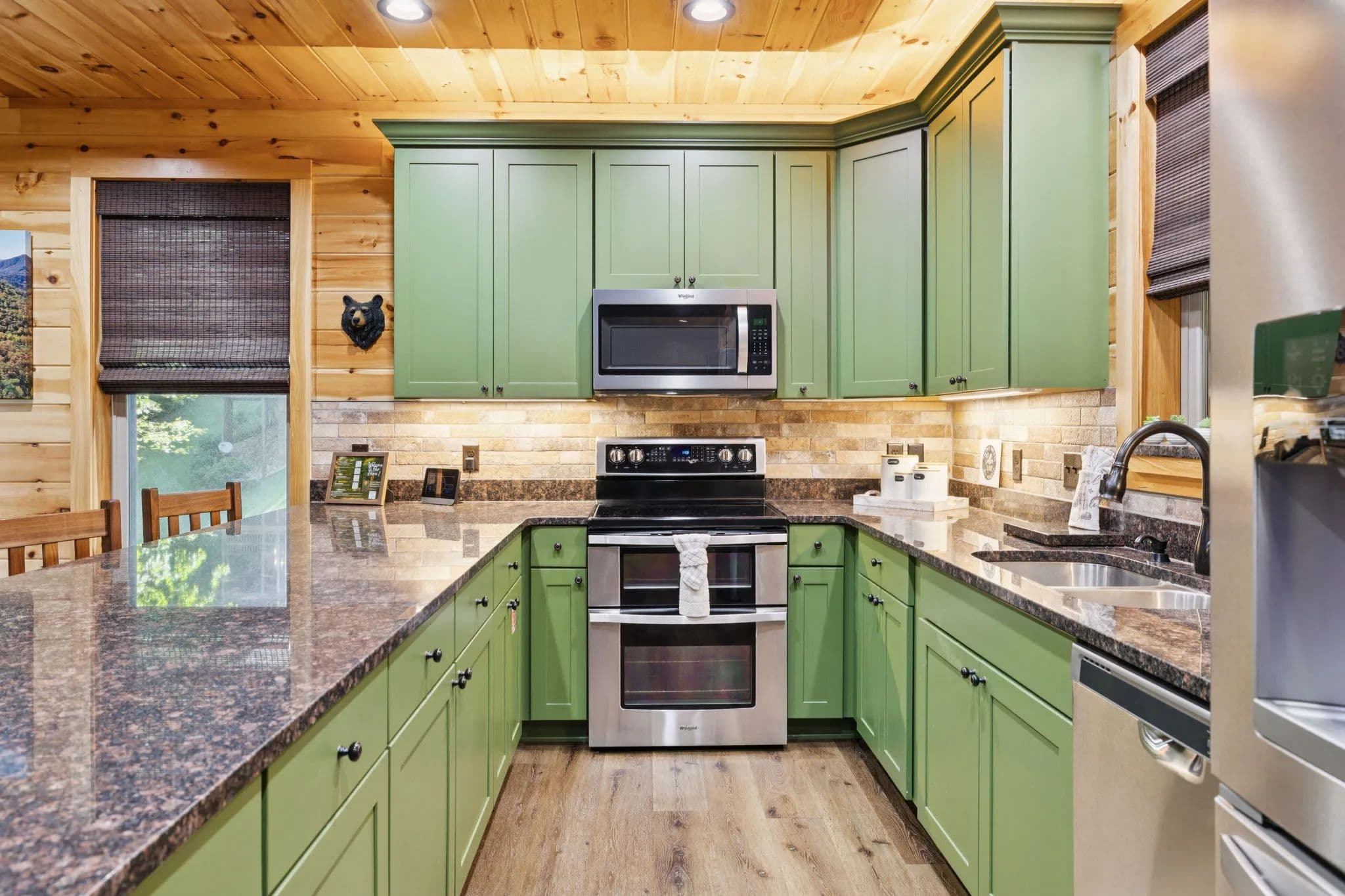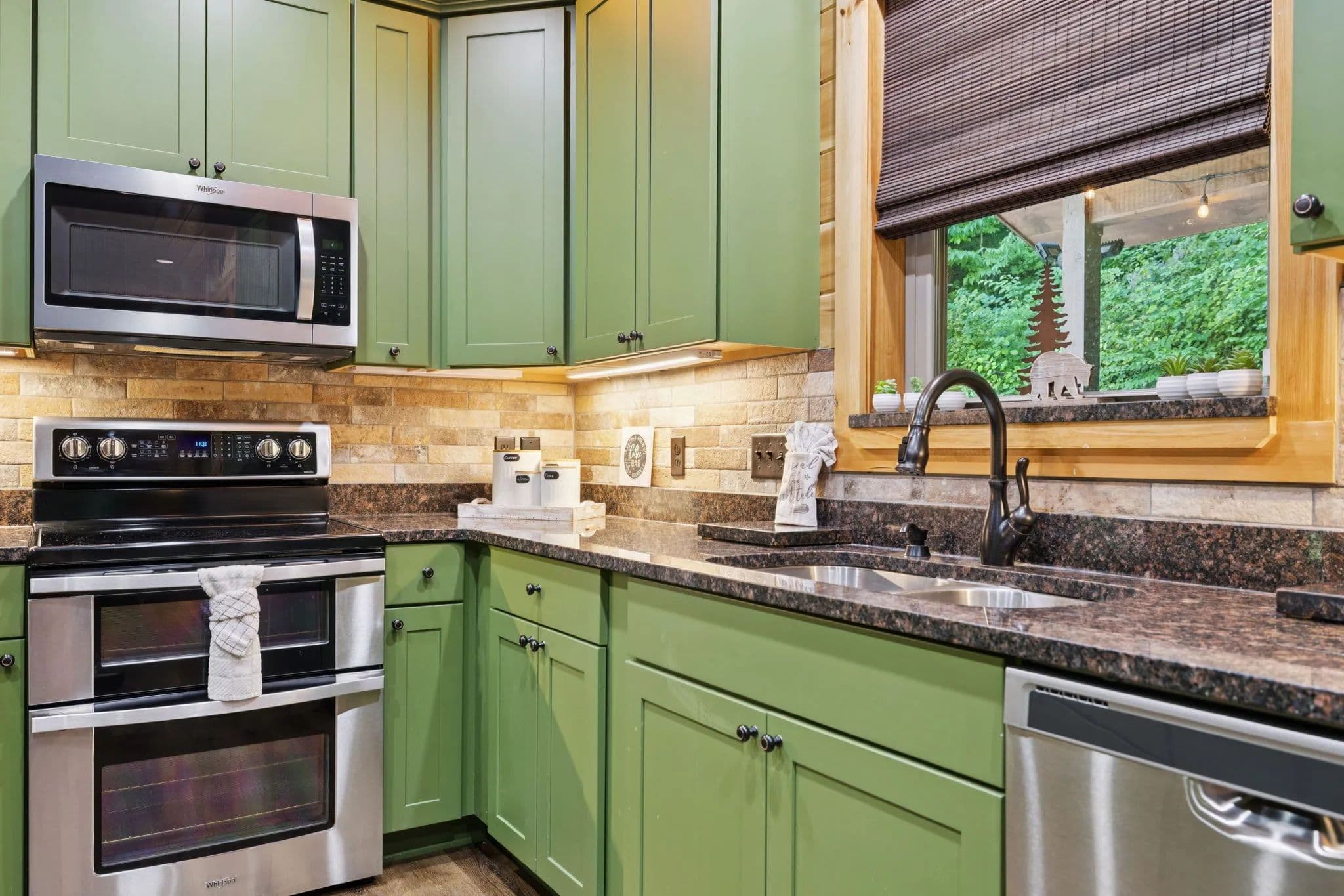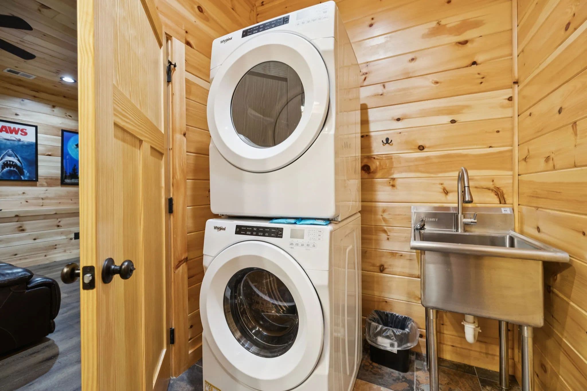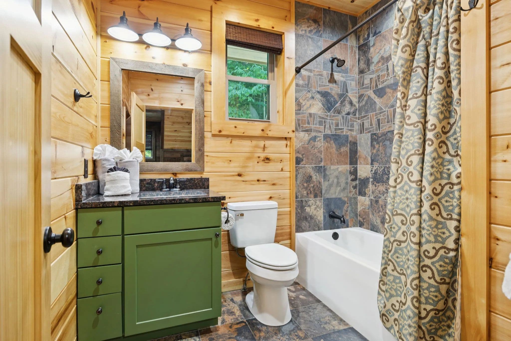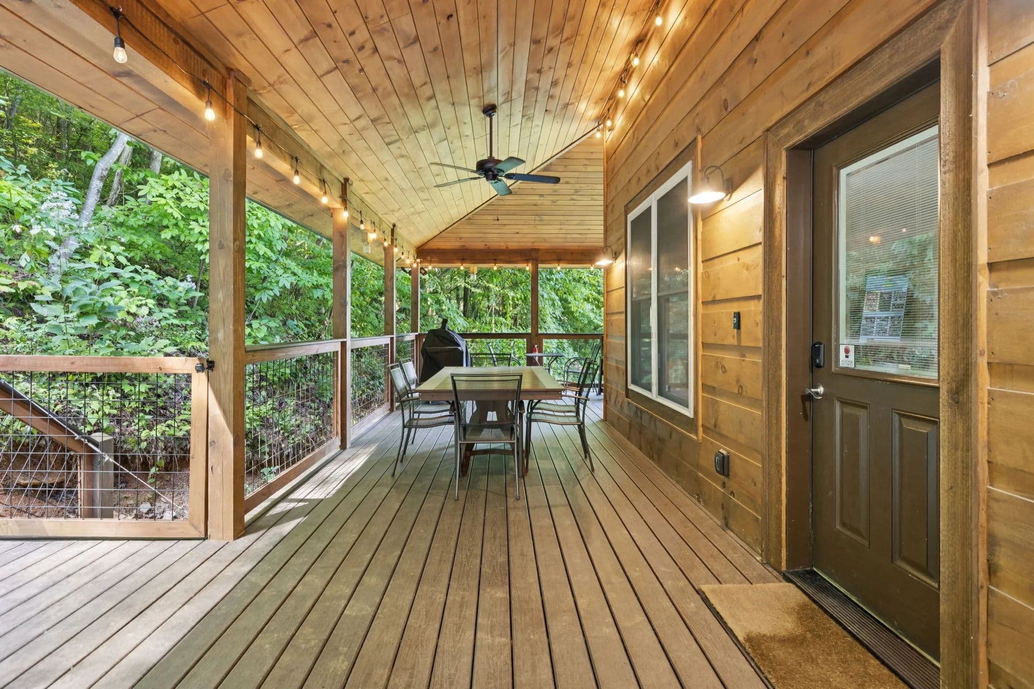 This cabin includes a whole-house water filtration system, tankless water heater, and flood lights on all corners. Pocket doors, USB charger outlets, built-in king headboards with floating shelves, and built-in blinds on entry doors add to the convenience and modern appeal.