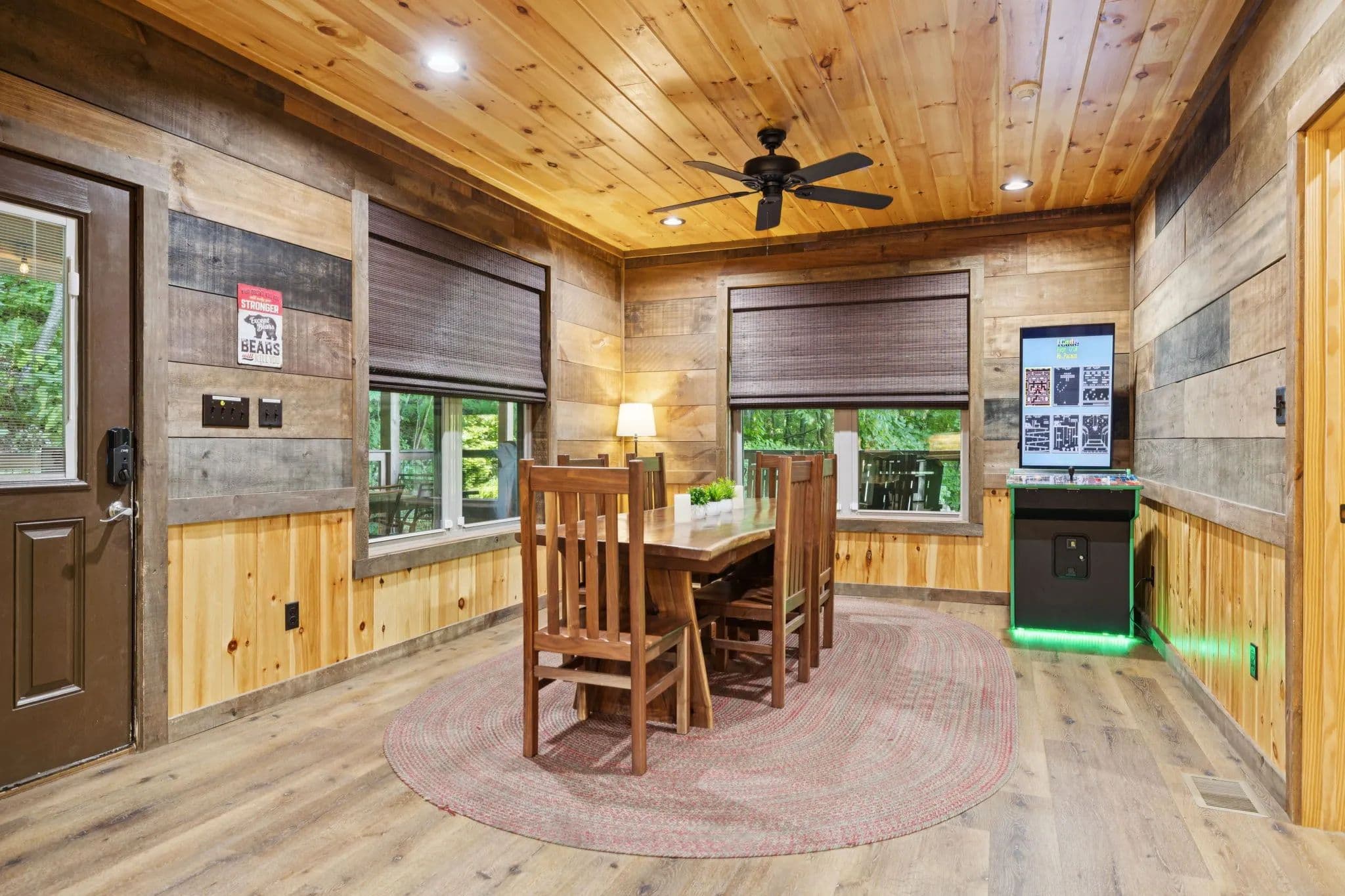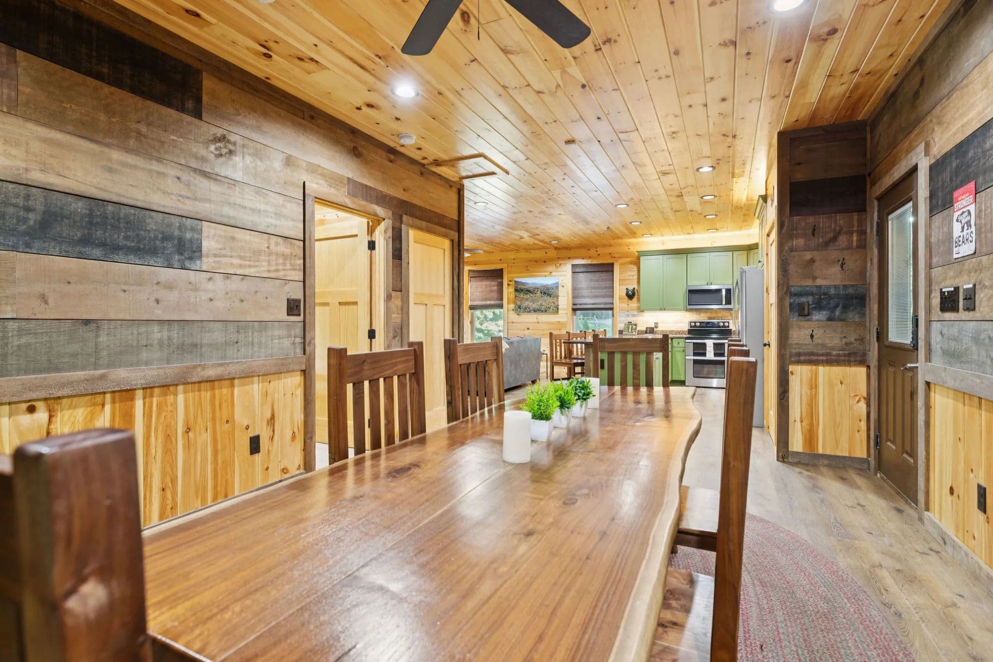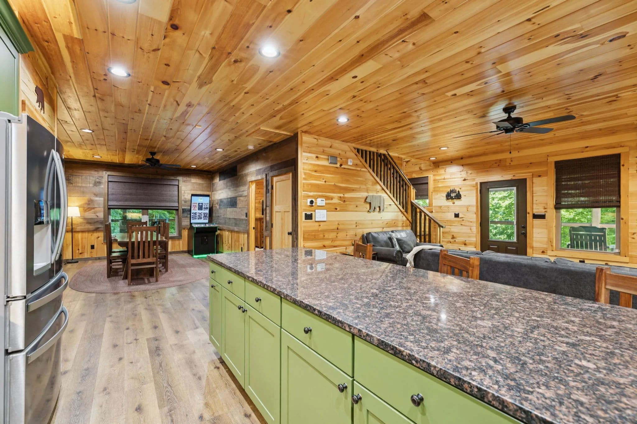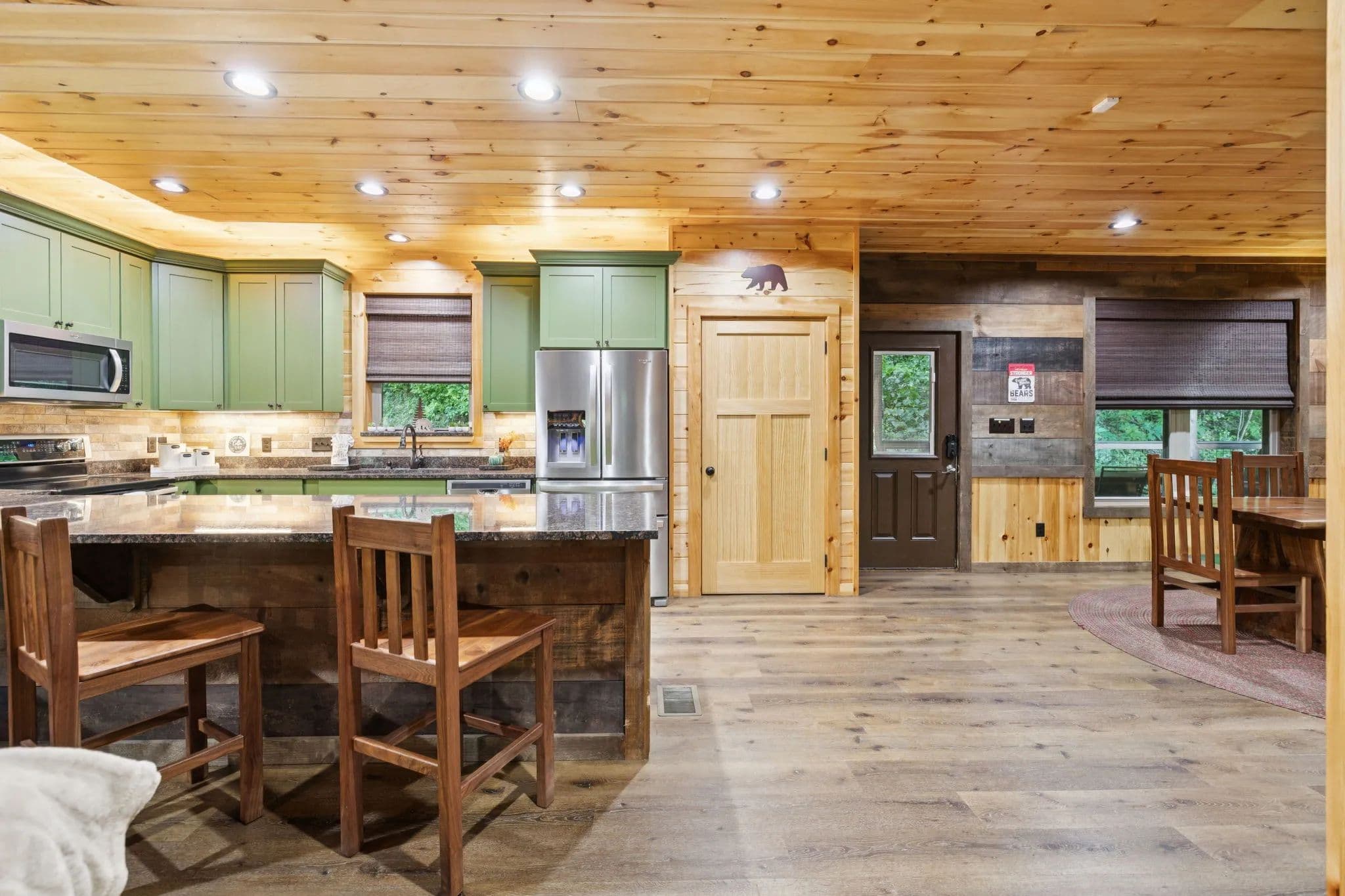 The open floorplan features vaulted ceilings, wood walls and ceilings, recessed lighting, and luxury vinyl plank flooring. The living room includes a stone-accented gas fireplace and ample seating. The kitchen is equipped with upgraded stainless appliances, including a convection oven, granite countertops, stone backsplash, pantry, soft-close cabinetry, and snack bar seating for four. The dining area offers seating for six and a barnwood accent wall.
