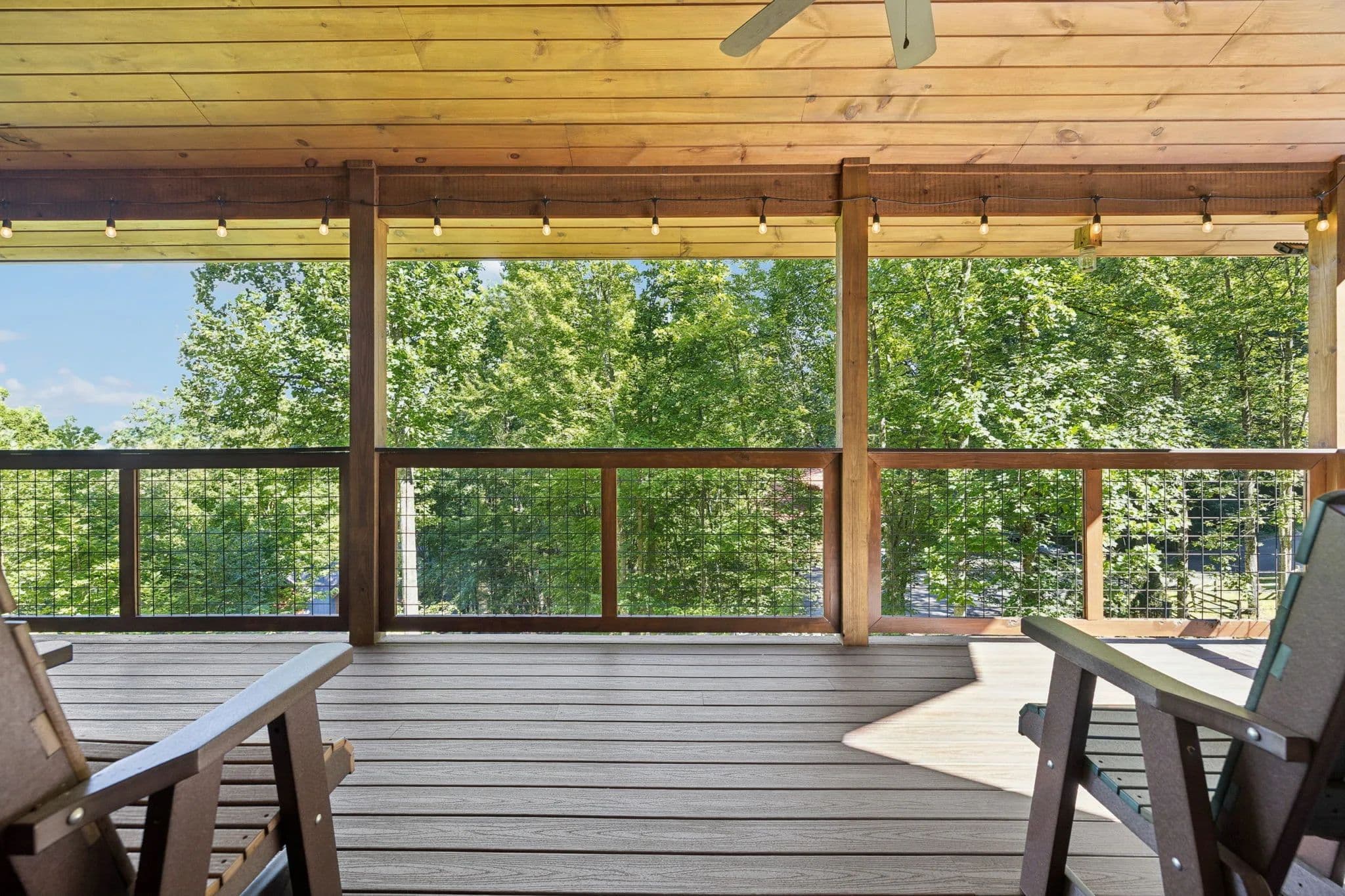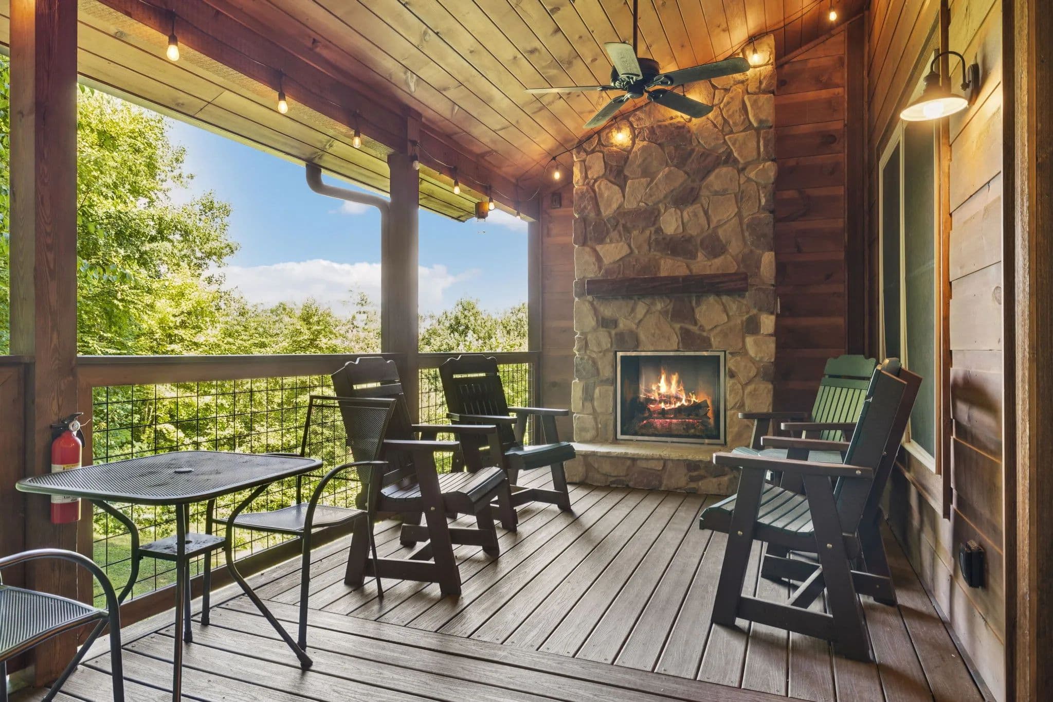 Expansive 10-foot-wide composite decks feature covered seating areas with ceiling fans, a stone-accented outdoor fireplace, and durable composite furniture. The level concrete drive offers ample parking and space for basketball, cornhole, or additional recreation. A gated, shared driveway and low HOA fees complete the exterior amenities.
